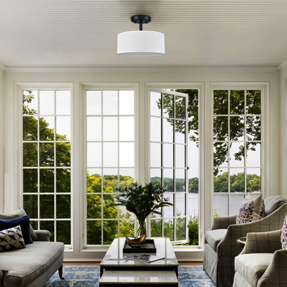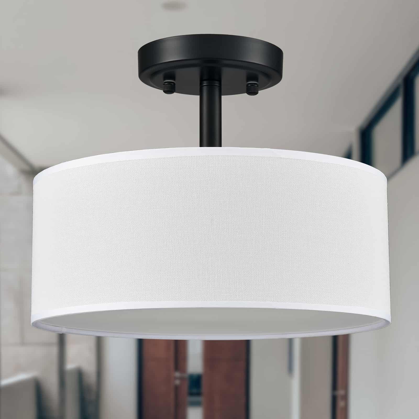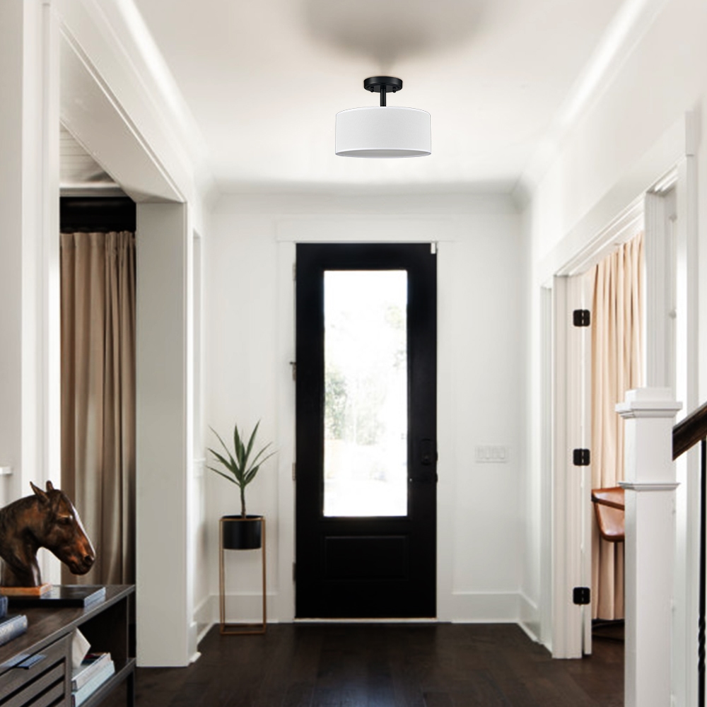 The drum ceiling light’s canopy, lamp holder, and rod flaunt a rustproof semigloss black finish, bringing a dash of drama to your home. The light pouring through the beige linen lampshade is gently muted and fills the room without any glare. Its white drum shade contrasts the black finish and adds alluring visual interest and a large dose of texture to your interior. It comes with an acrylic diffuser that helps to soften the light.