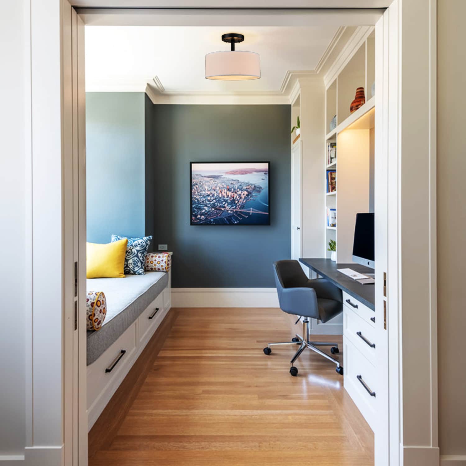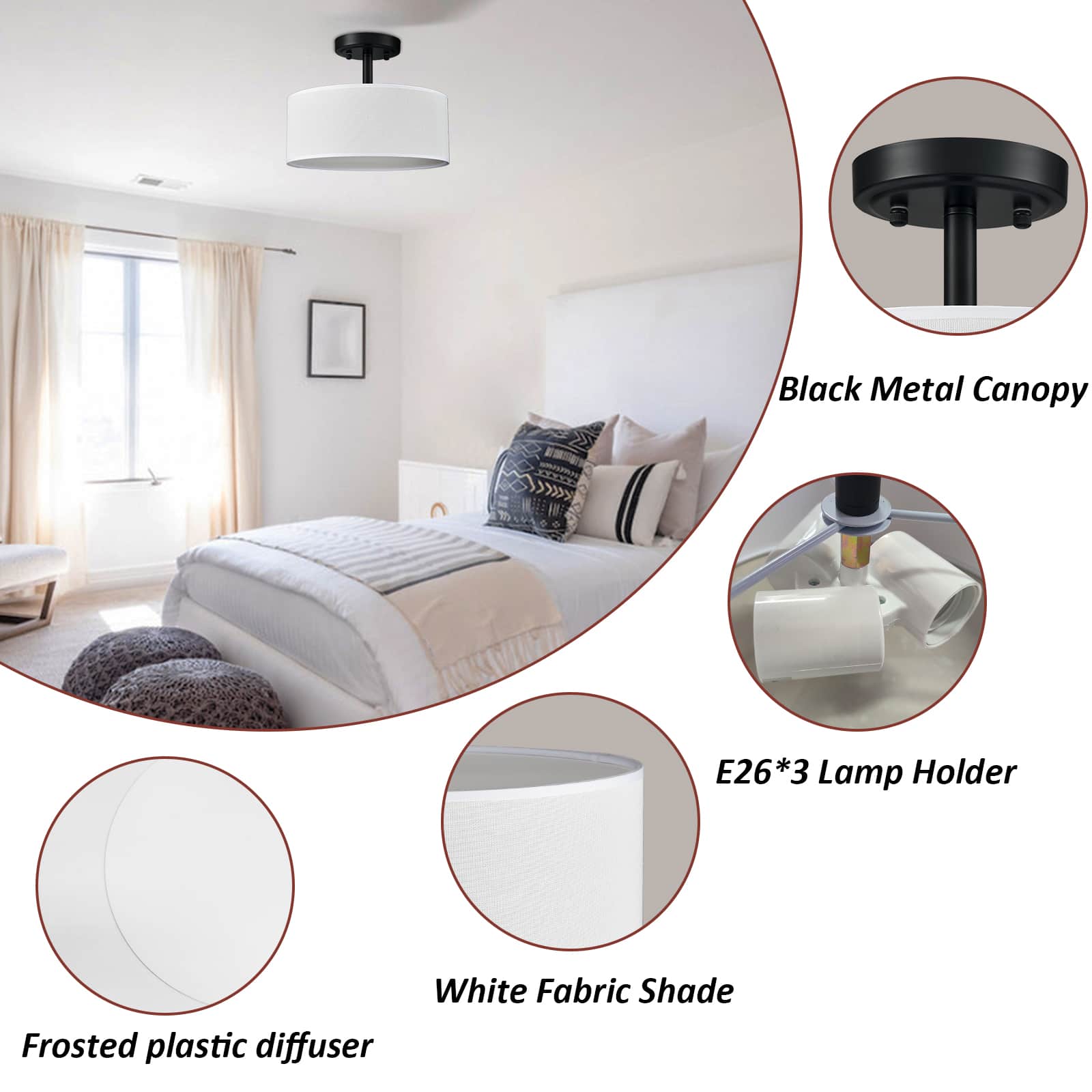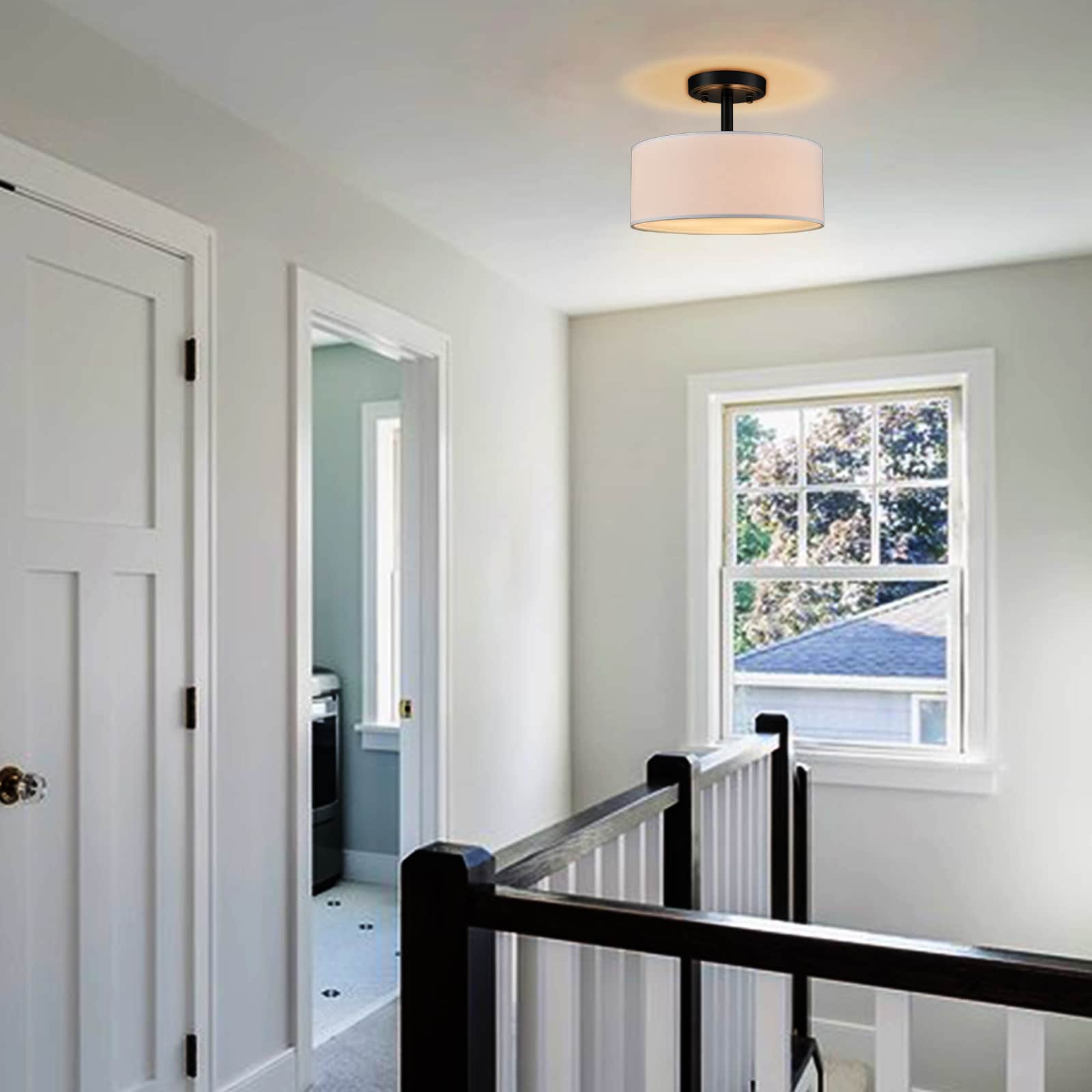 The drum ceiling light’s canopy, lamp holder, and rod flaunt a rustproof semigloss black finish, bringing a dash of drama to your home. The light pouring through the beige linen lampshade is gently muted and fills the room without any glare. Its white drum shade contrasts the black finish and adds alluring visual interest and a large dose of texture to your interior. It comes with an acrylic diffuser that helps to soften the light.