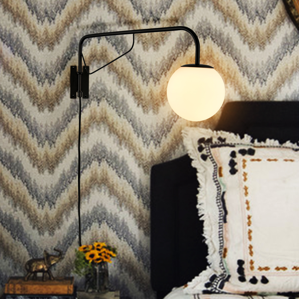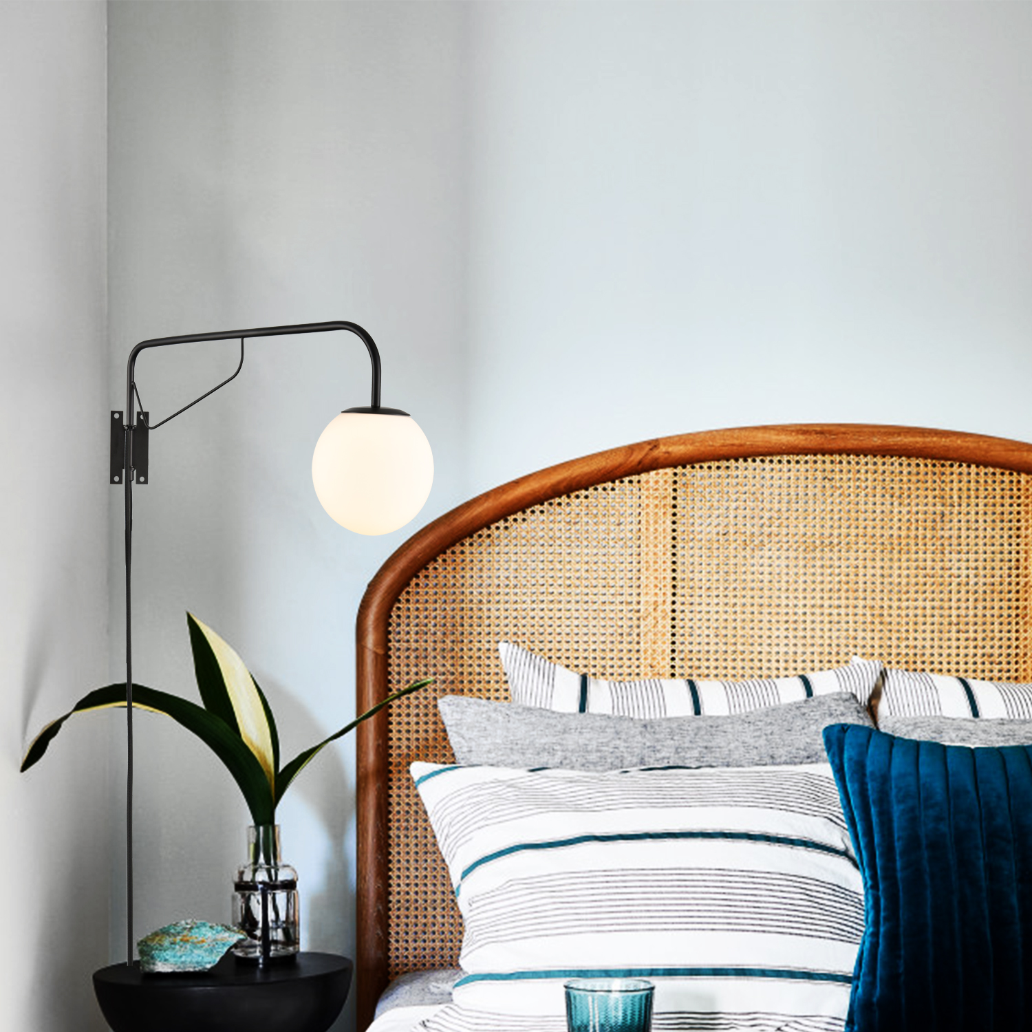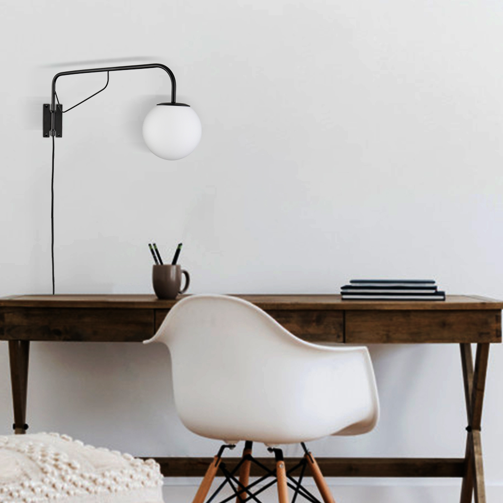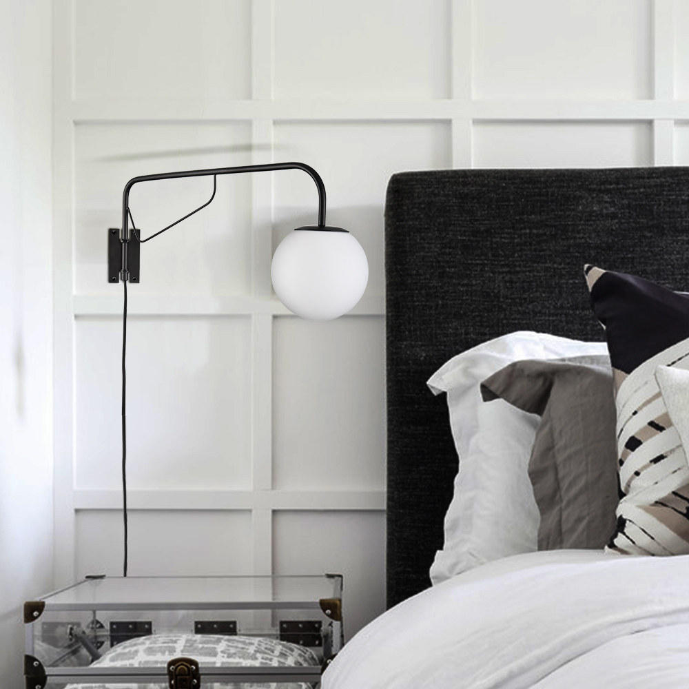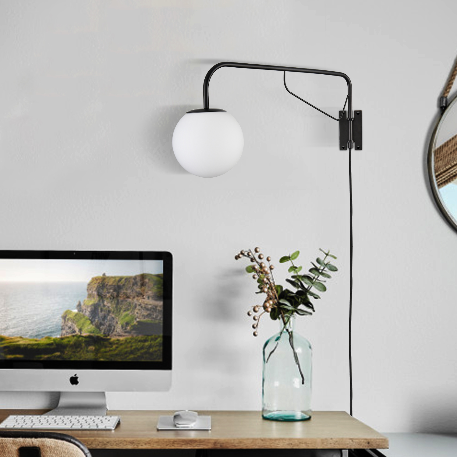 The swing arm wall lamp is accented with a rustproof black finish, bringing a large dose of texture to your interior. It diffuses awesome light rays from the opaque milk glass shade to make the bedroom dainty, romantic, and dreamy. The glass shade offers a sleek sphere silhouette and boasts the beauty of geometry. Its black finish contrasts the milk glass shade and showcases the classic black-and-white color combo. Its swing arm can swivel 180 degrees horizontally. It comes with an on/off switch without a dimming function and a 70.87-inch plug-in cord.