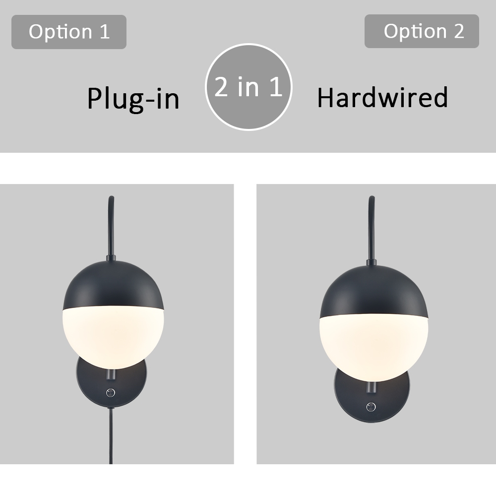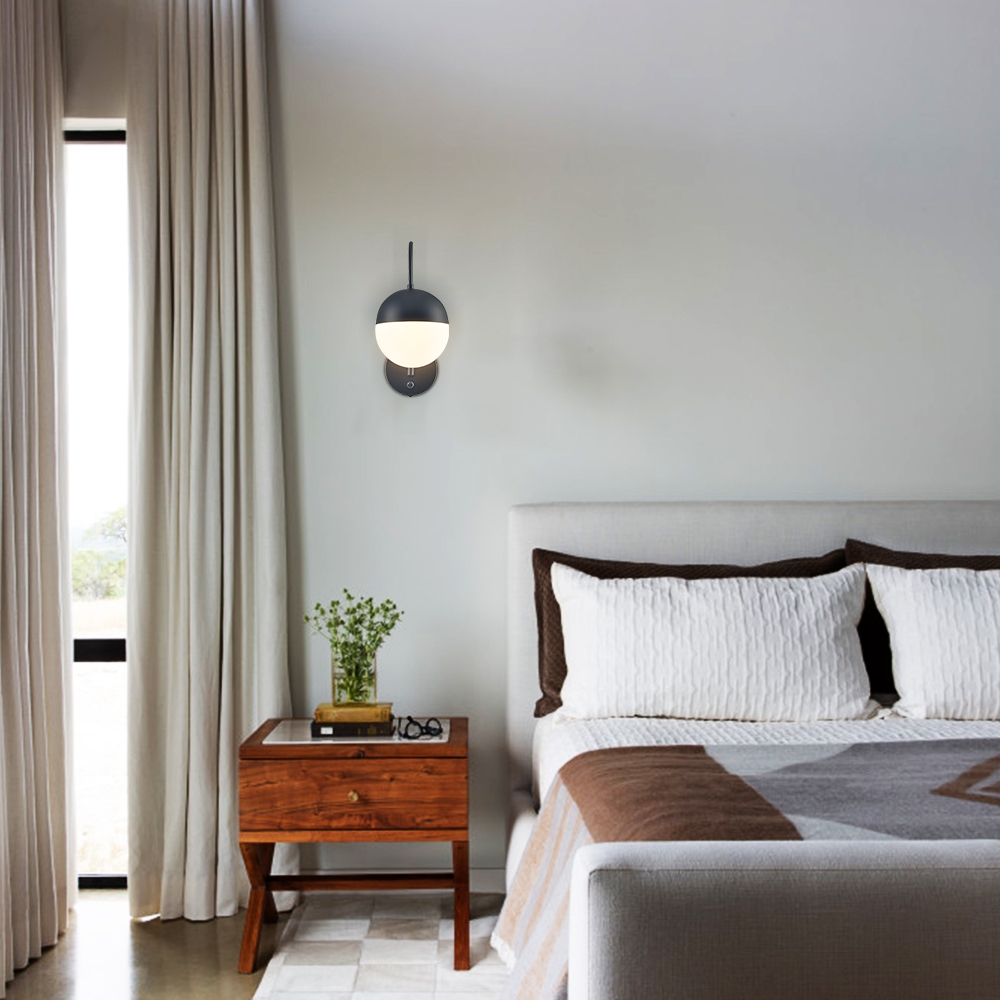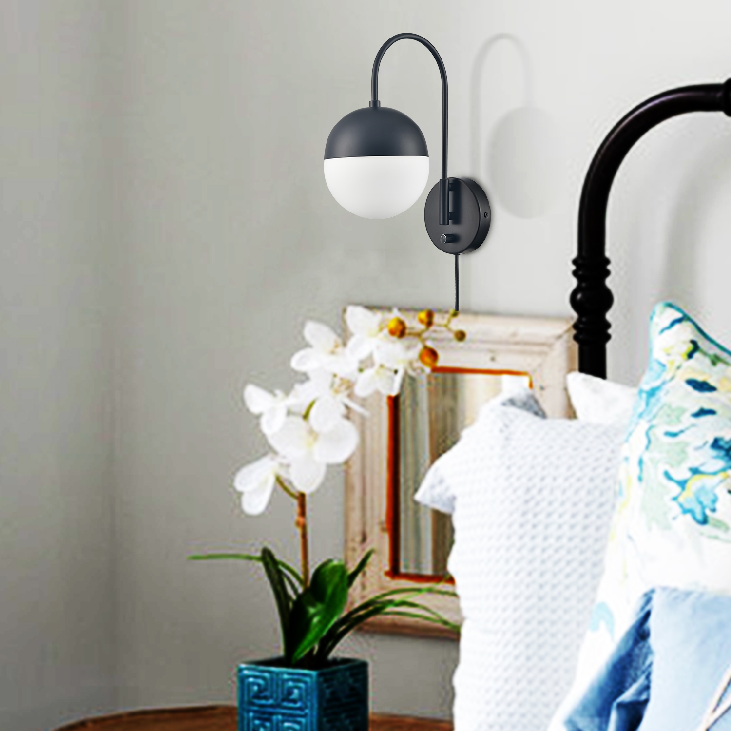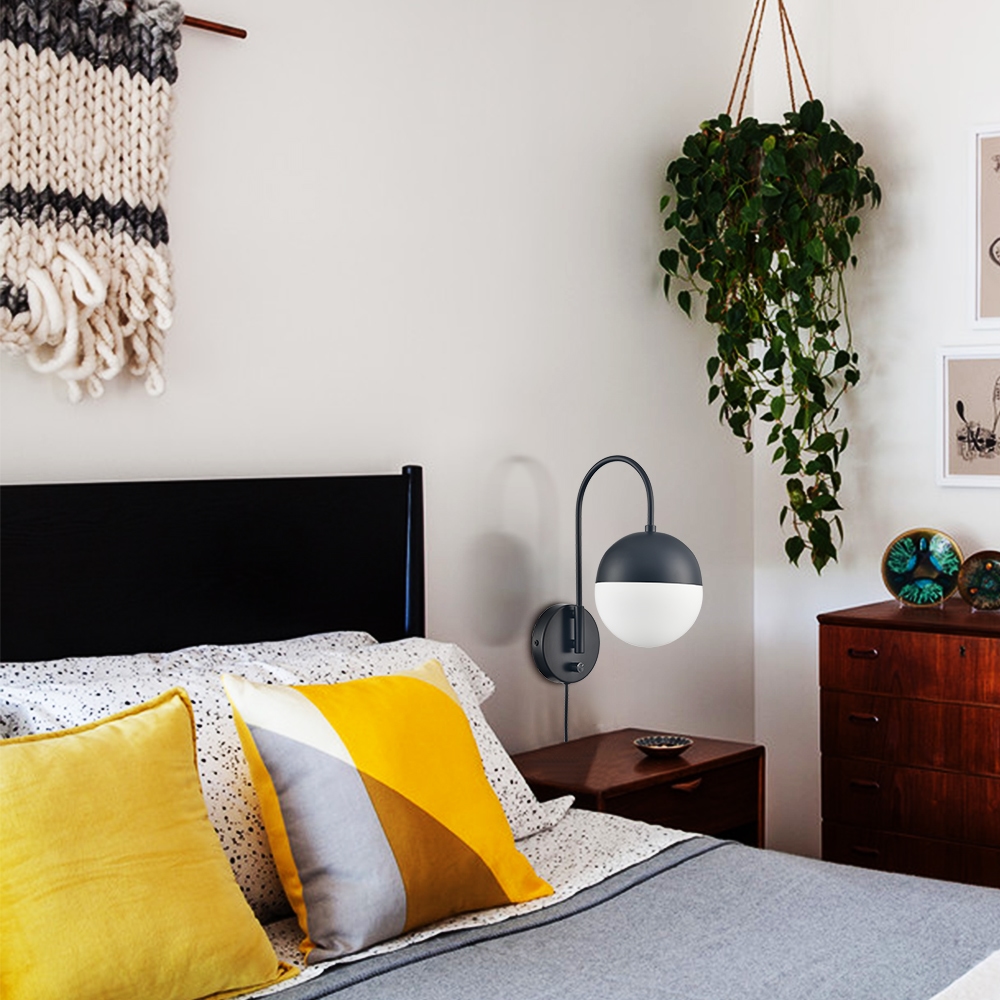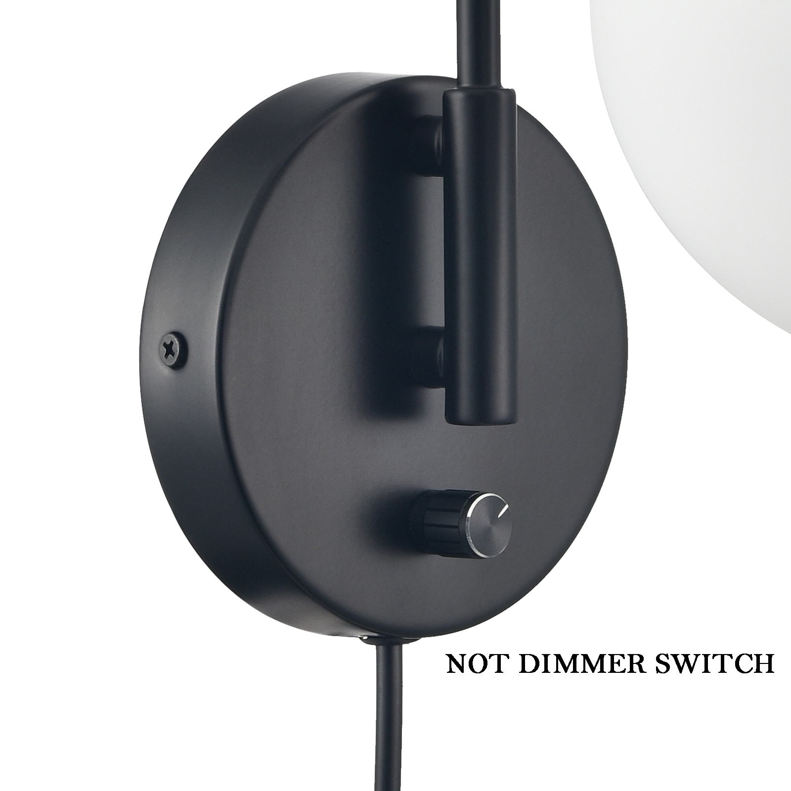 The modern black wall lamp’s canopy, arm, the upper part of the globe shade, and the lamp holder sport a matte black finish, giving your interior a touch of modern sophistication. Its opaque opal glass shade rounds out the design with understated elegance. Its glass shade offers a sleek sphere silhouette and shows off the beauty of geometry. The white lower part of the globe shade contrasts the black finish and adds alluring visual interest to the living space. The switch on the canopy is just an on/off switch without a dimming function. It comes with a 70.8-inch power cord.
