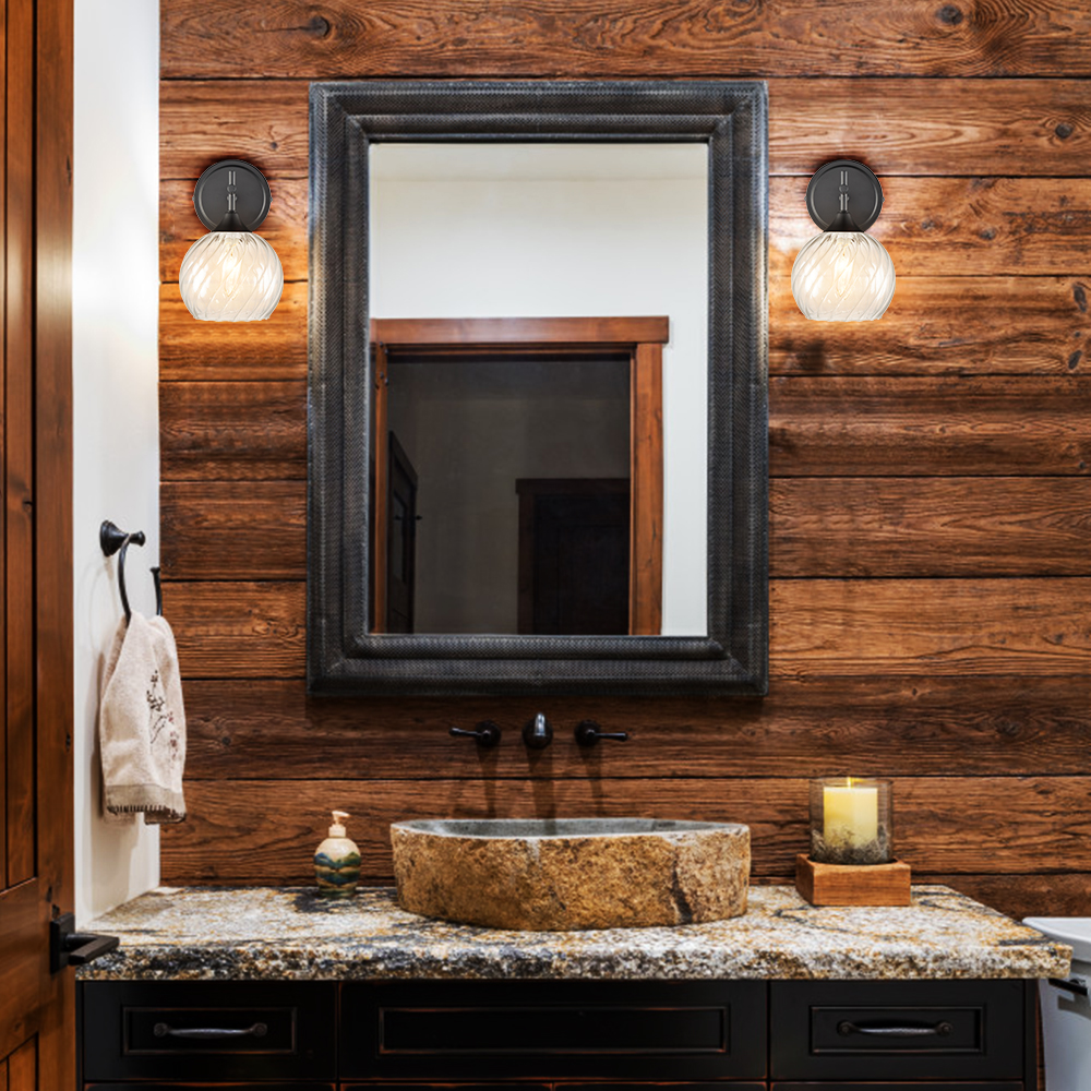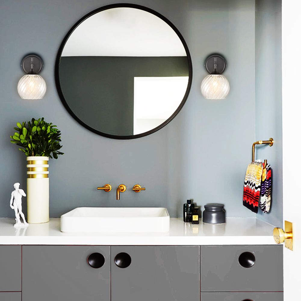 The modern black wall sconces show off a stunning decorative detail with their semigloss black finish. Their clear glass shades that flaunt leave pattern provide attractive eye appeal to your home, stand out, and shine on their own. Their hand-blown clear glass globe shades introduce a large dose of texture to the space. Boasting a sleek sphere silhouette, they show off the beauty of geometry and complete the aesthetic with an elegant touch. A charming glow shines through the glass shade, creating intriguing light effects and shades.