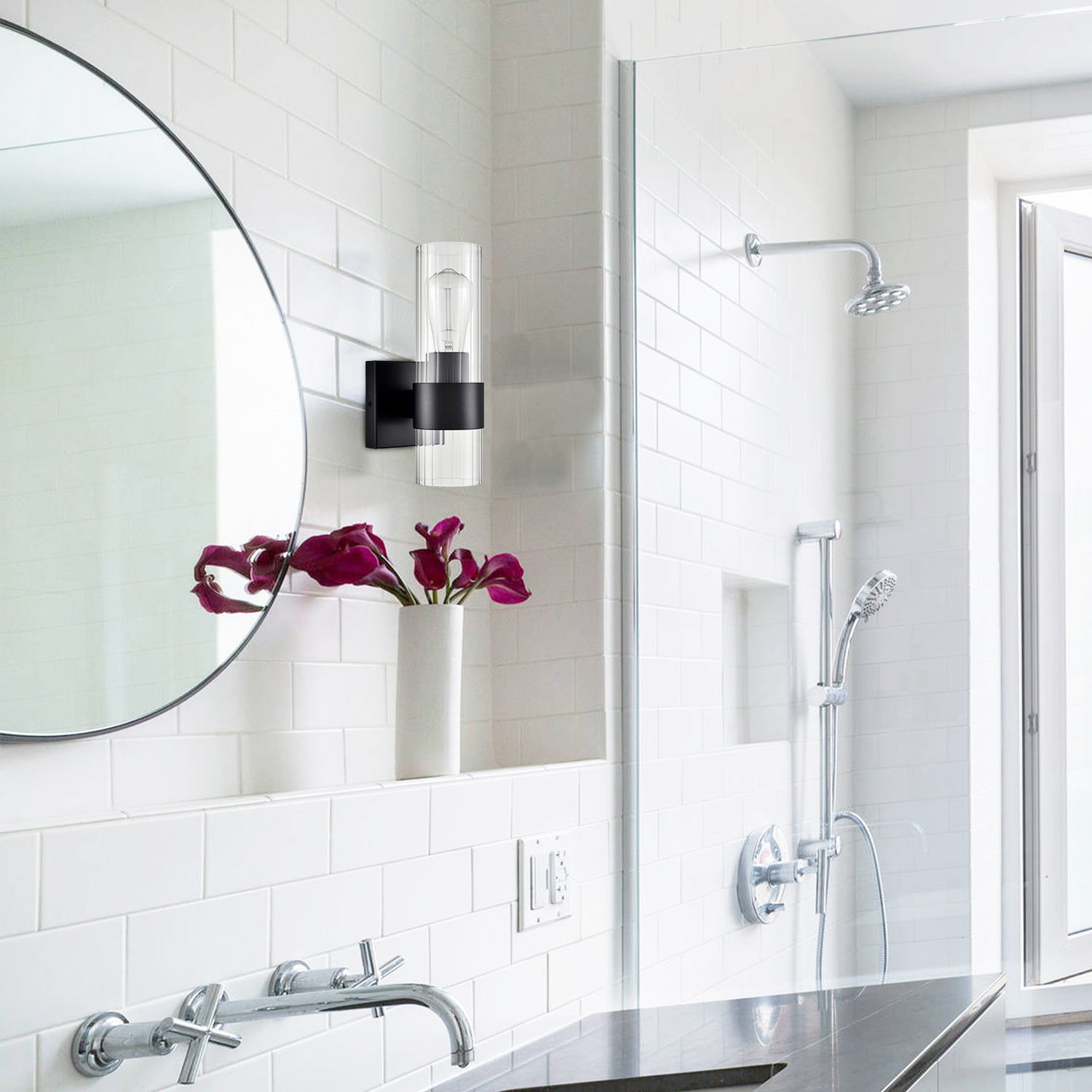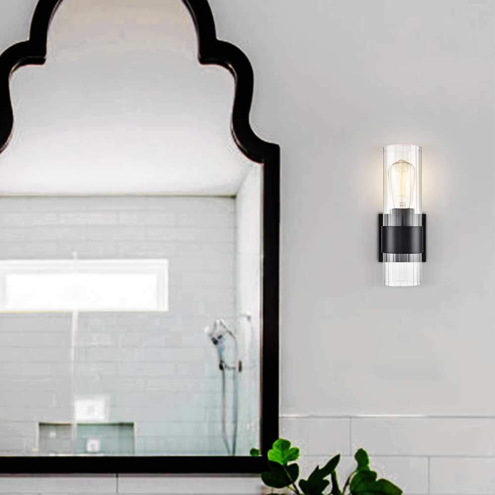 The modern black wall sconce flaunts a rustproof semigloss black finish, bringing a dash of drama and dramatic decorative impact to your home. It shows off a cylinder shade crafted from impurity-free clear glass. The shade is designed to encircle one exposed bulb to complete the aesthetic. It is held aloft by a black metal ring on the lower part of the glass shade, bringing an unrivaled level of sophistication. Its cylinder shade contrasts the black finish and adds alluring visual interest to the living area. The stripes on the clear glass cylinder give the light fixture an instant texture boost. It can be installed horizontally or vertically.