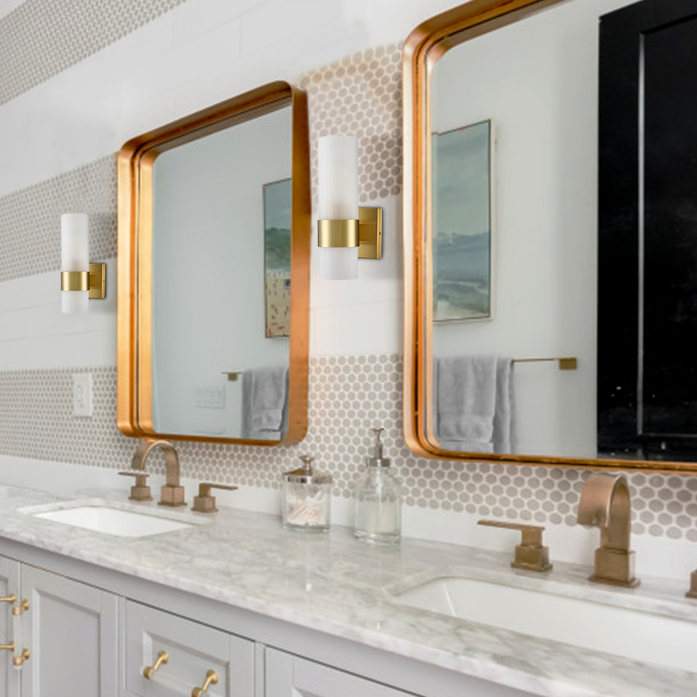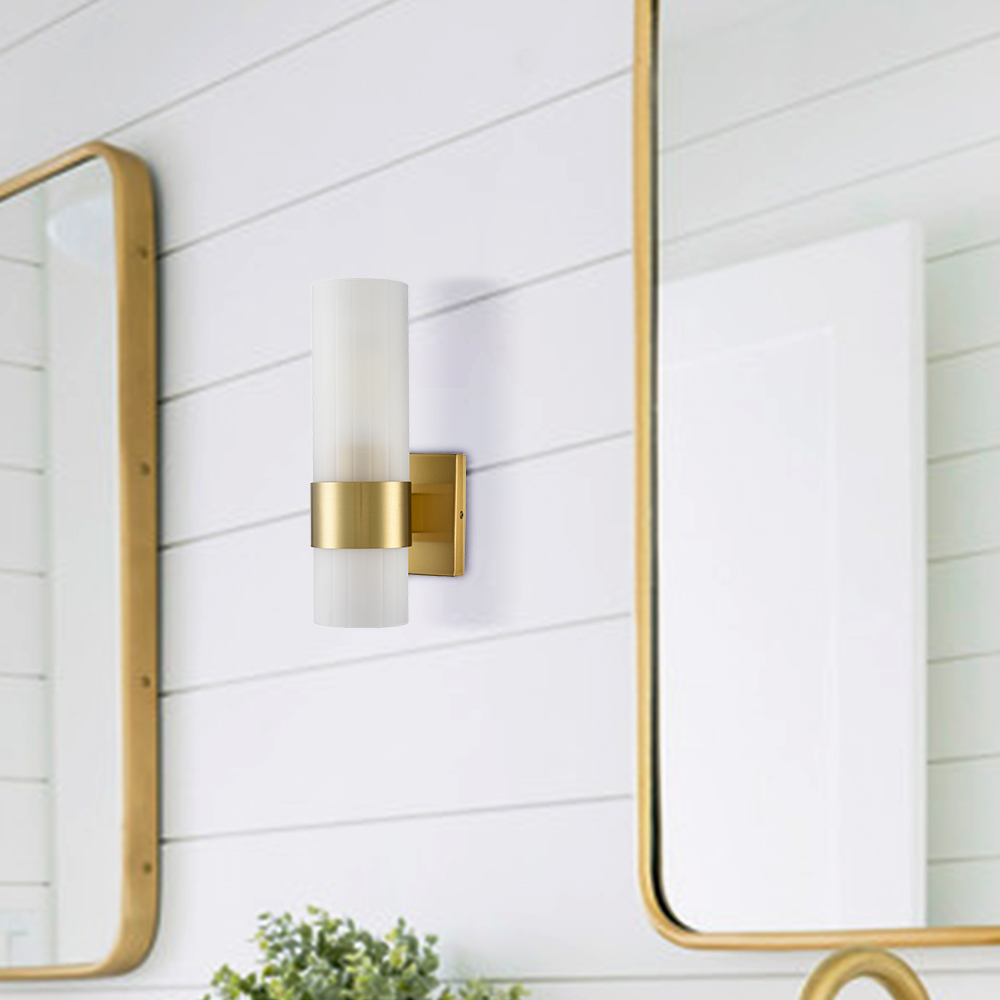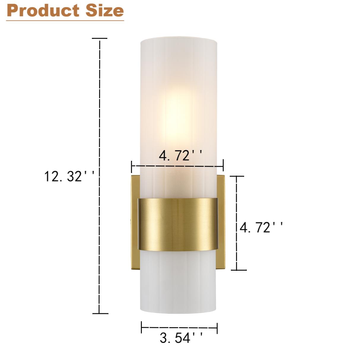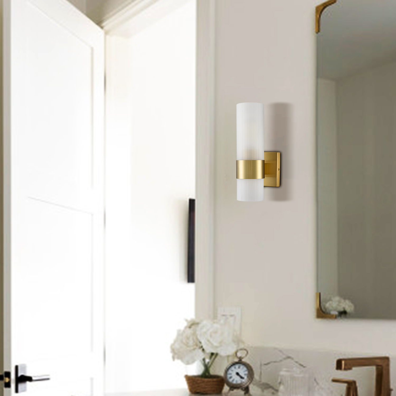 The frosted glass cylinder wall sconce flaunts a rustproof gold finish, bringing a dash of drama and dramatic decorative impact to your home. It shows off a cylinder shade crafted from impurity-free frosted glass. The shade is designed to encircle one exposed bulb to complete the aesthetic. It is held aloft by a gold metal ring on the lower part of the glass shade, bringing an unrivaled level of sophistication. Its cylinder shade contrasts the gold finish and adds alluring visual interest to the living area. The stripes on the frosted glass cylinder give the light fixture an instant texture boost. It can be installed horizontally or vertically.