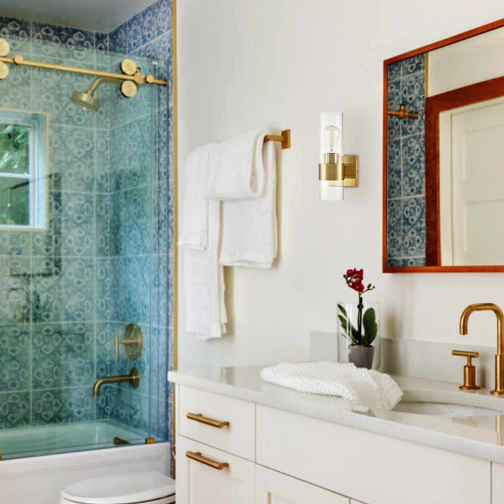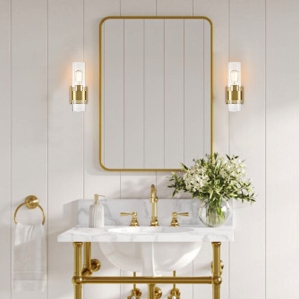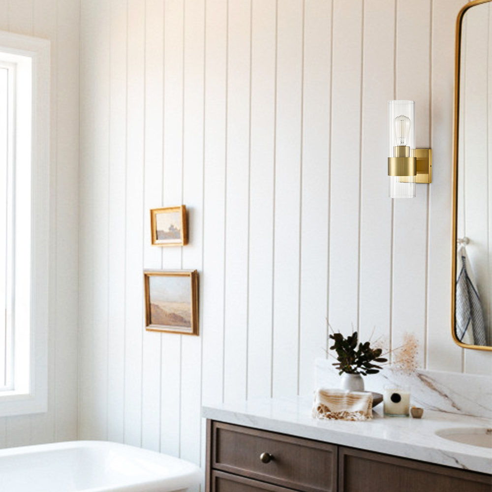 The clear glass cylinder wall sconce flaunts a rustproof gold finish, bringing a dash of drama and dramatic decorative impact to your home. It shows off a cylinder shade crafted from impurity-free clear glass. The shade is designed to encircle one exposed bulb to complete the aesthetic. It is held aloft by a black metal ring on the lower part of the glass shade, bringing an unrivaled level of sophistication. Its cylinder shade contrasts the gold finish and adds alluring visual interest to the living area. The stripes on the clear glass cylinder give the light fixture an instant texture boost. It can be installed horizontally or vertically.