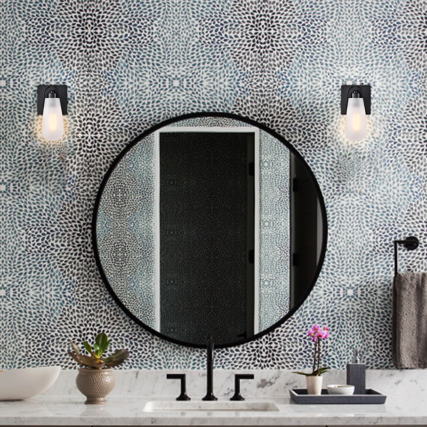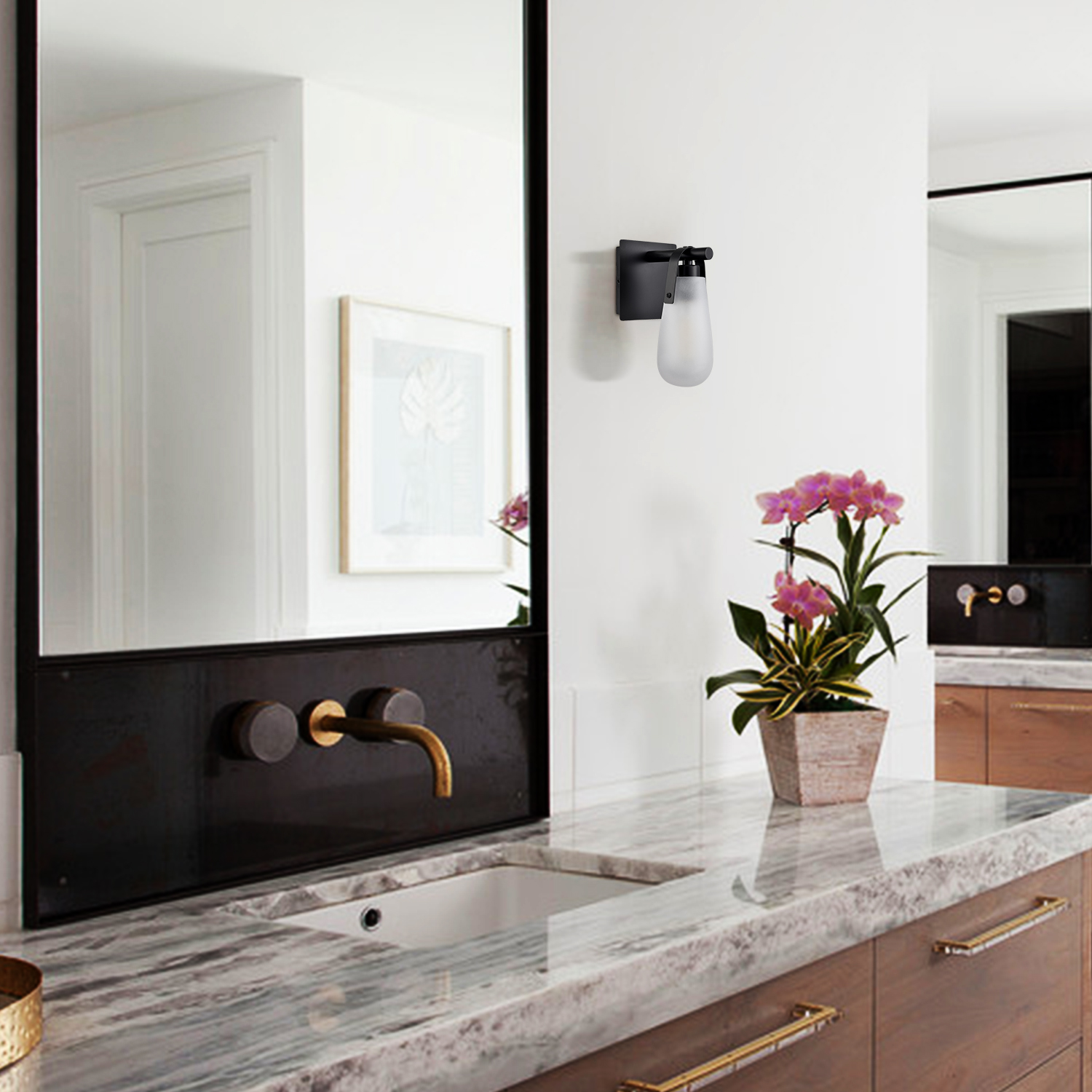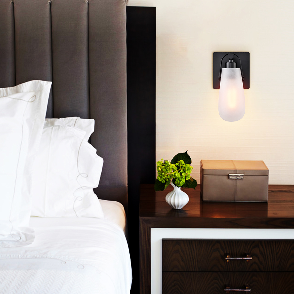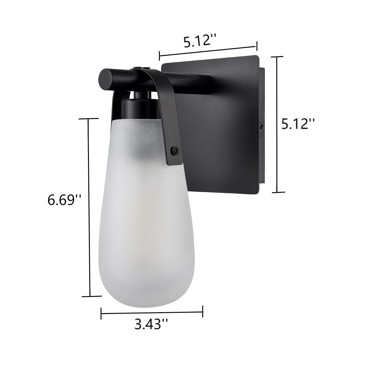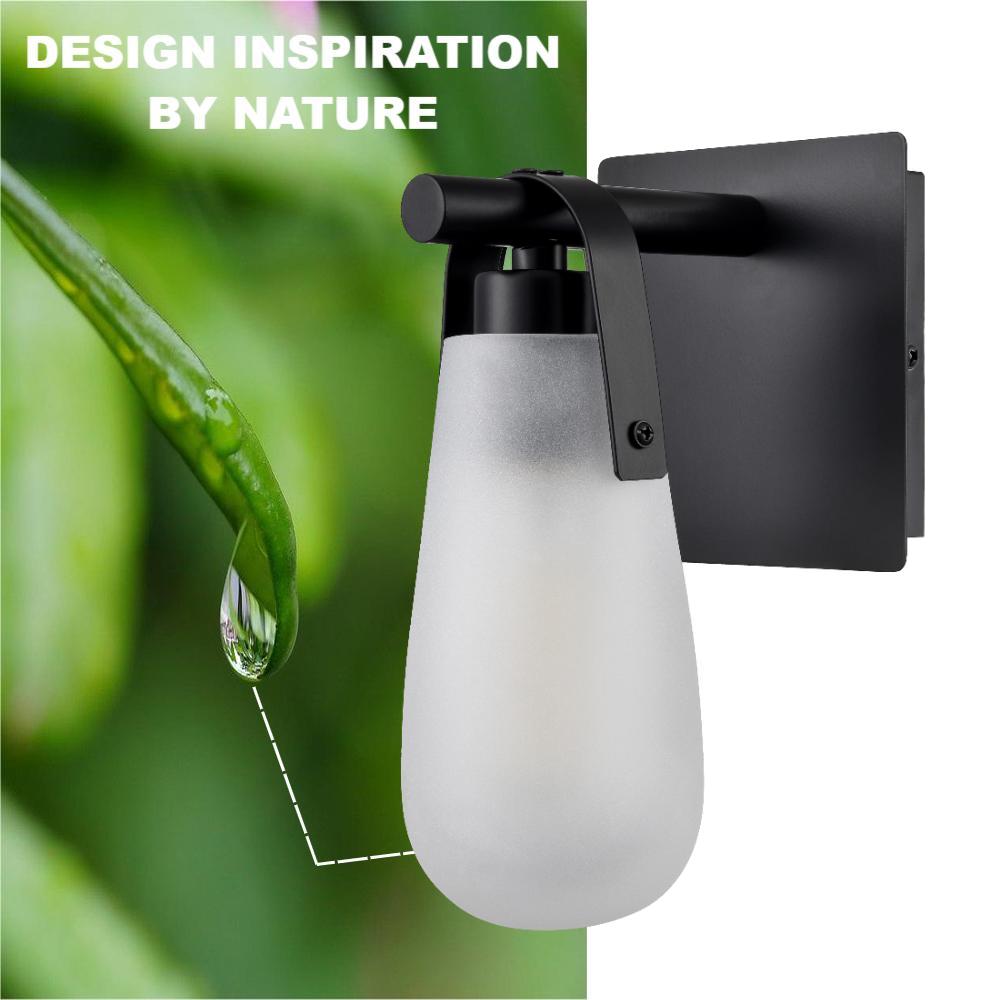 The frosted glass raindrop wall sconce flaunts a rustproof semigloss black finish, giving your living space a touch of urban sophistication. Showing off a raindrop-inspired silhouette, the glass shade draws the eye upward to a beautiful display of glass and metal. It is held aloft by an arched metal slat attached to the sturdy arm, bringing an unrivaled level of sophistication. Its celestial-inspired lampshade contrasts the black finish and adds alluring visual interest to the living area. It catches the light to create intriguing light effects and shades as well as provide generous ambient illumination to your living space. Its glass shade comes with a thicker bottom, which makes the glow shining through the light more charming and softer after refraction.