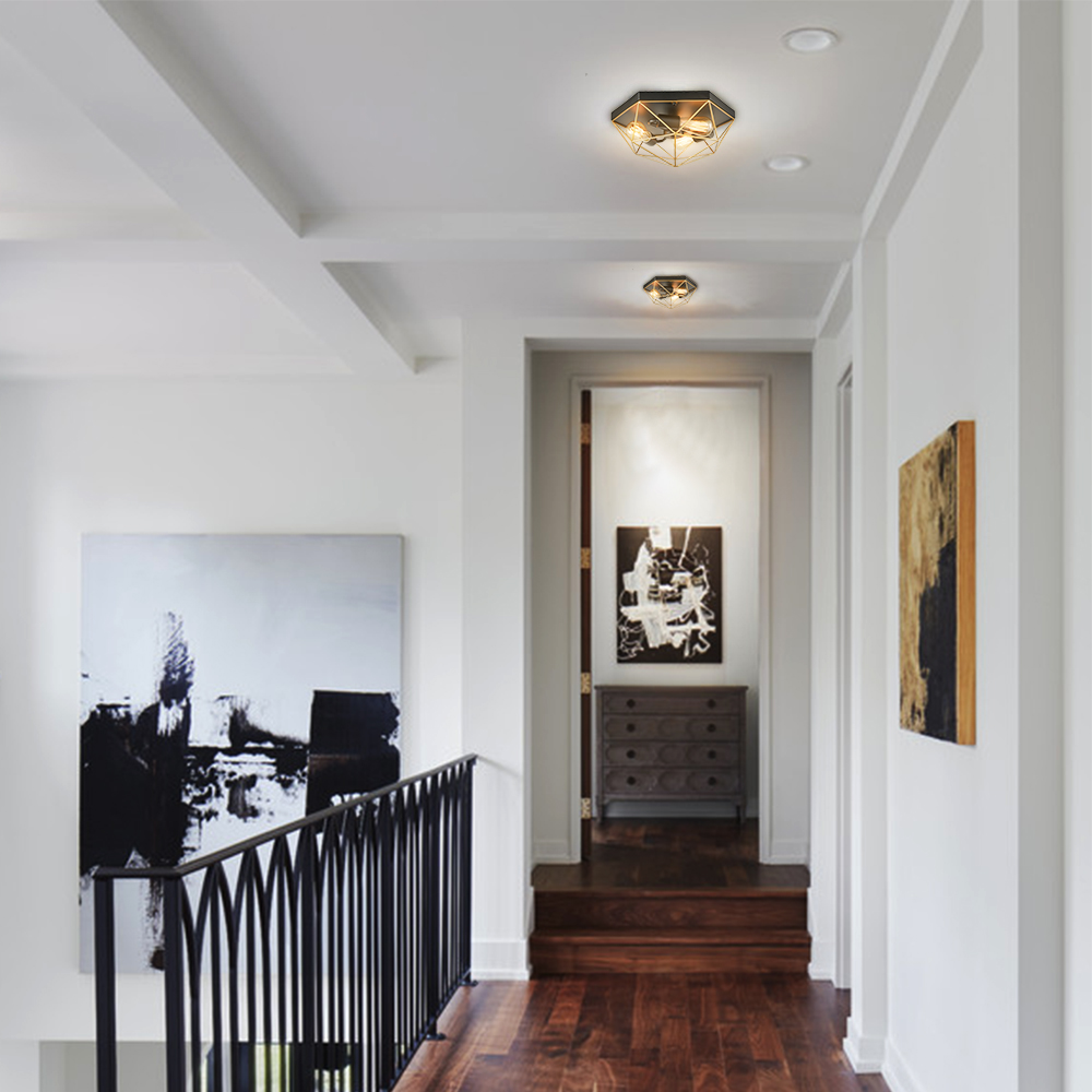 The flush mount ceiling light’s canopy, arms and lamp-holders are finished in semigloss black, imparting an industrial inspired charm to your interior. It flaunts a rhombus cage shade featuring a shimmery brass finish, revitalizing your living space with its glitzy sparkle. Its hexagonal canopy and rhombus cage shade bring bold geometric accent to your home decor. Its arms and bulbs offer a unique three-way swirl design, making the light a glamorous addition to your overall design scheme.