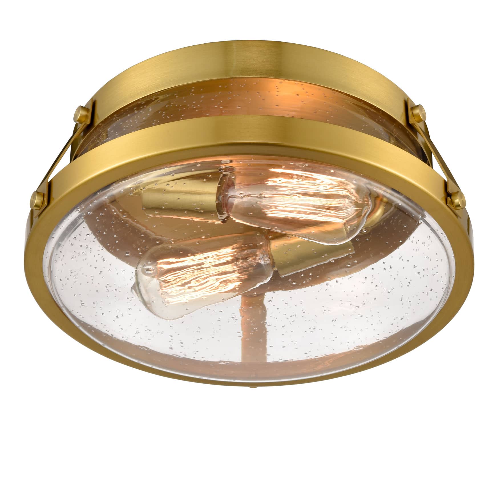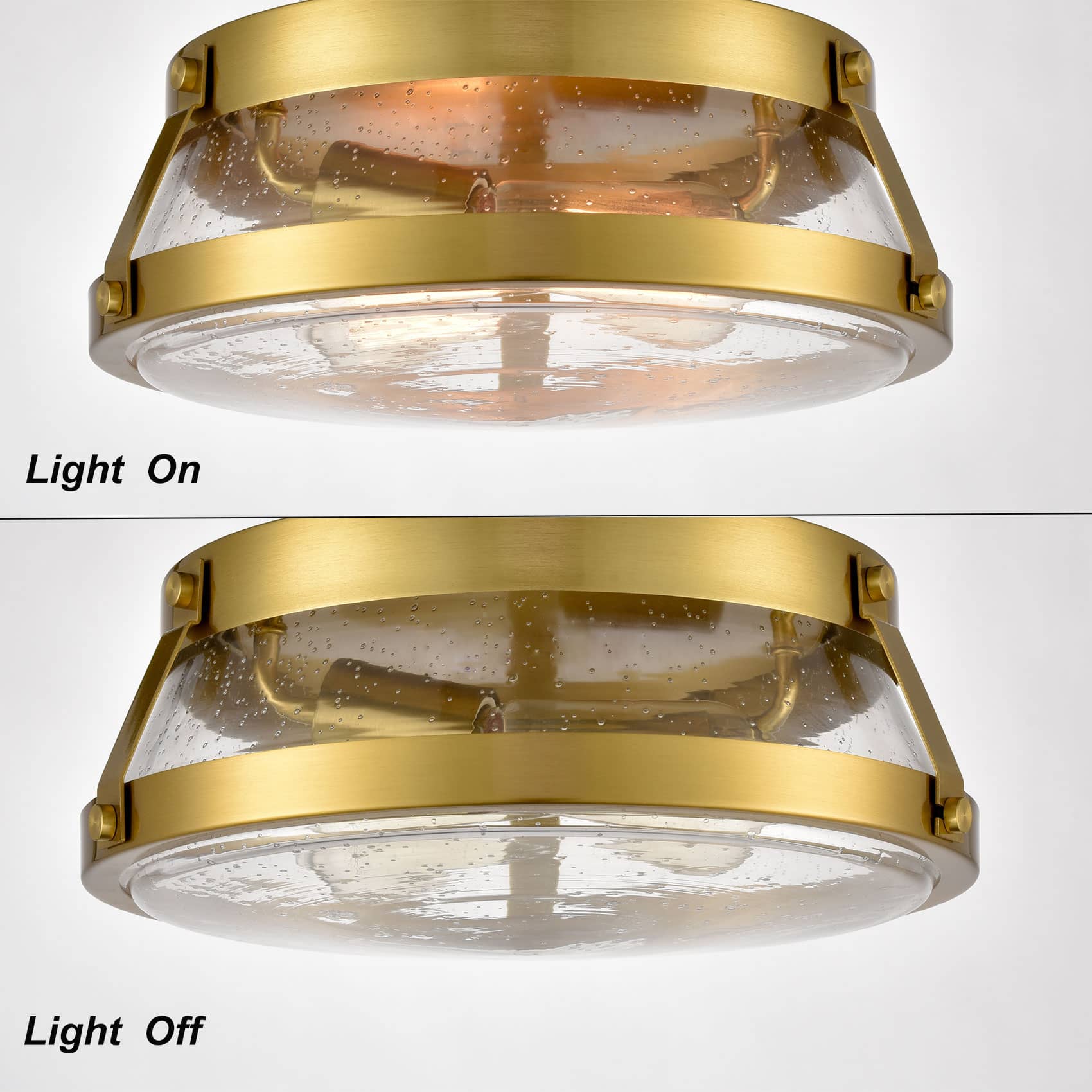 The metal ceiling light fixture’s lamp-holders and metal frame perk up your living space with a rustproof electrophoretic brass finish. The trapezoid seeded glass drum shade which is held aloft by the rounded metal frame invites geometry into your space.