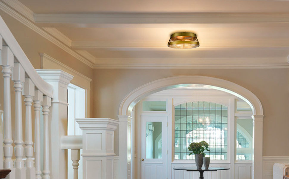 The metal ceiling light fixture’s lamp-holders and metal frame perk up your living space with a rustproof electrophoretic brass finish. The trapezoid seeded glass drum shade which is held aloft by the rounded metal frame invites geometry into your space.