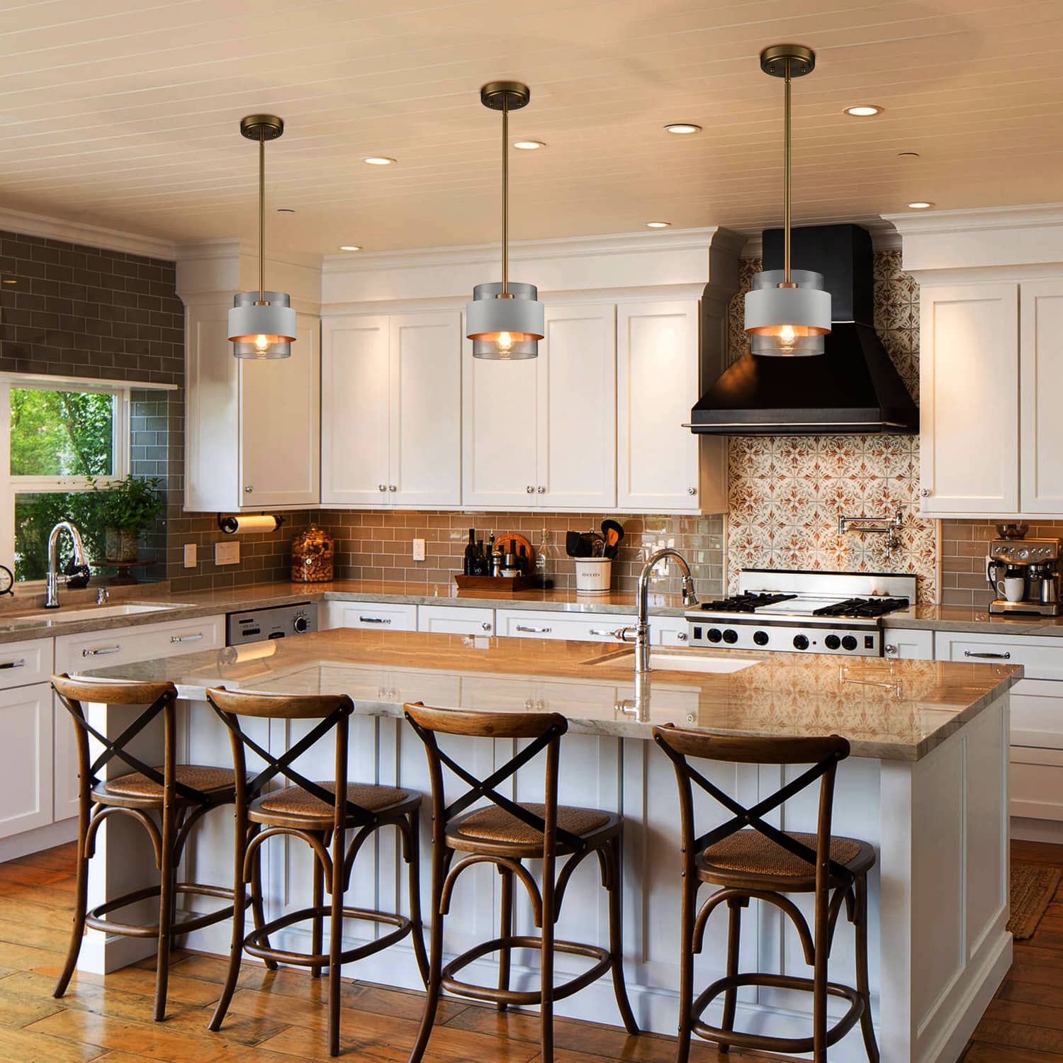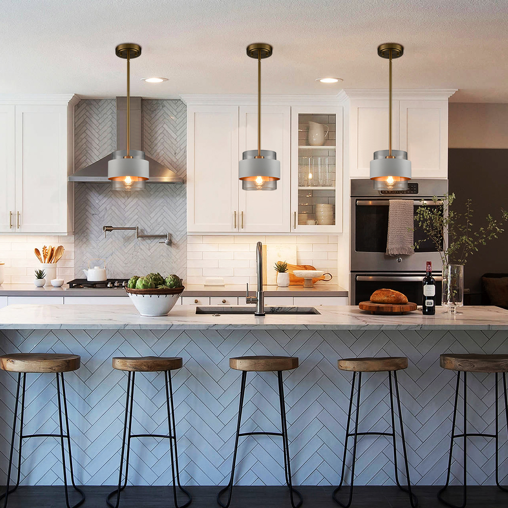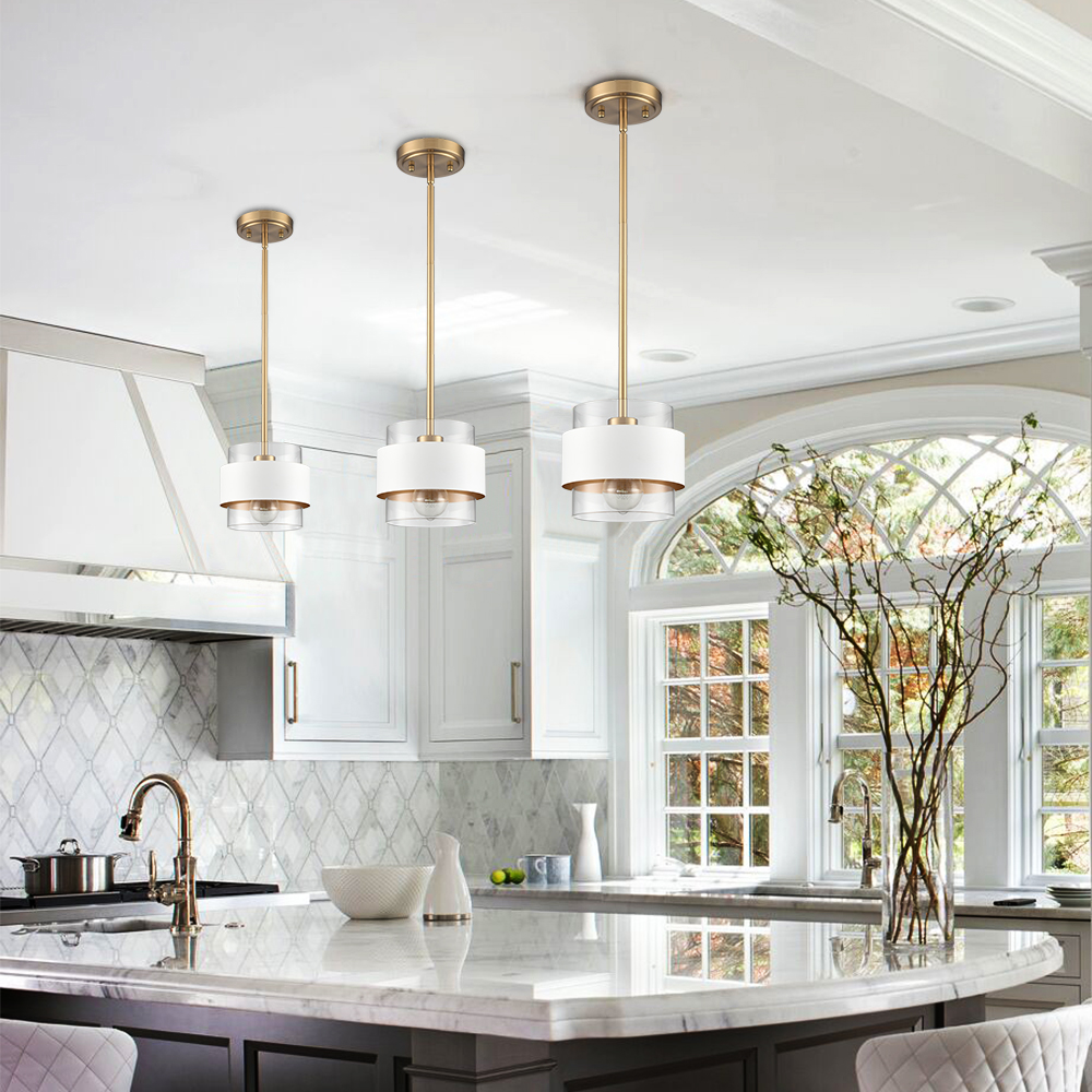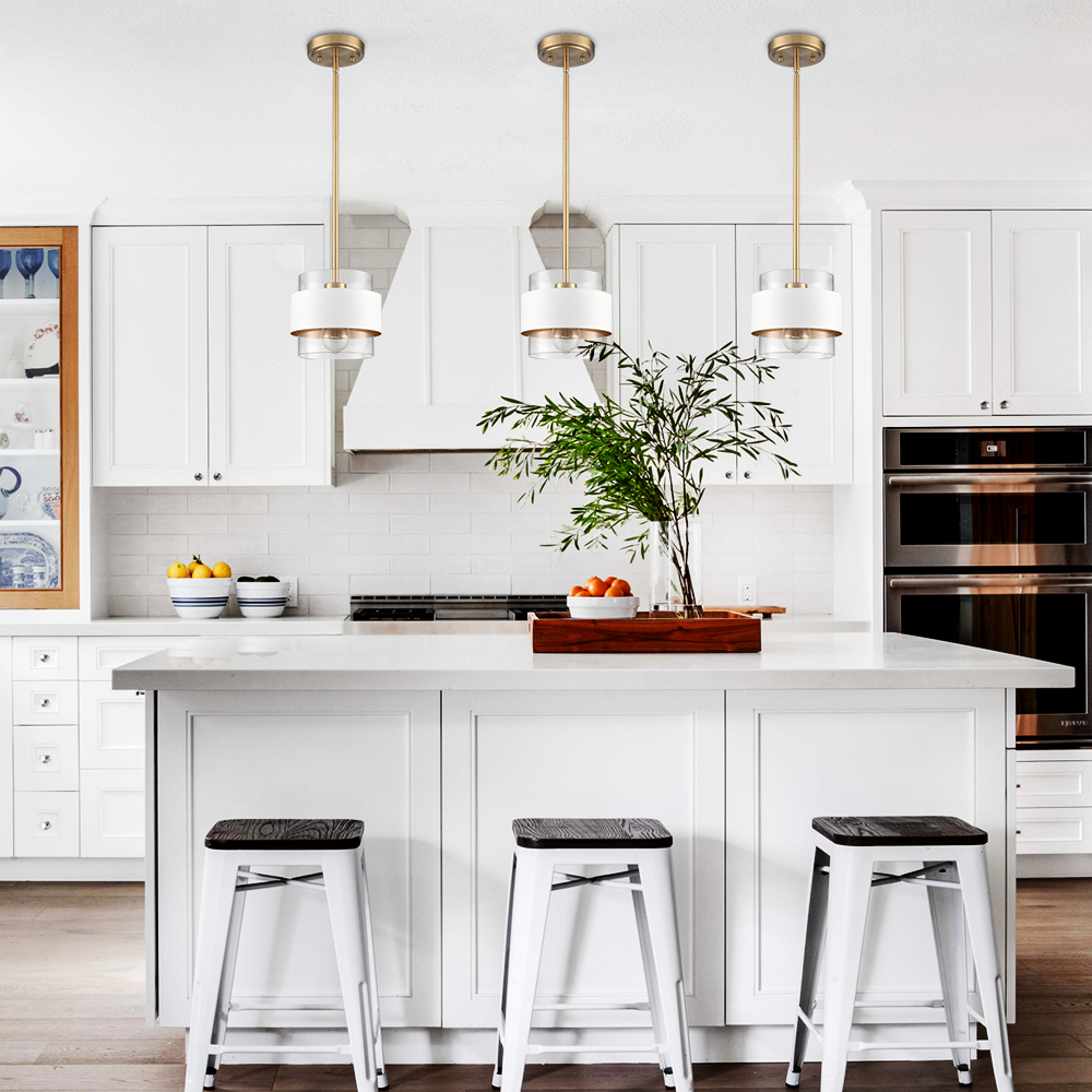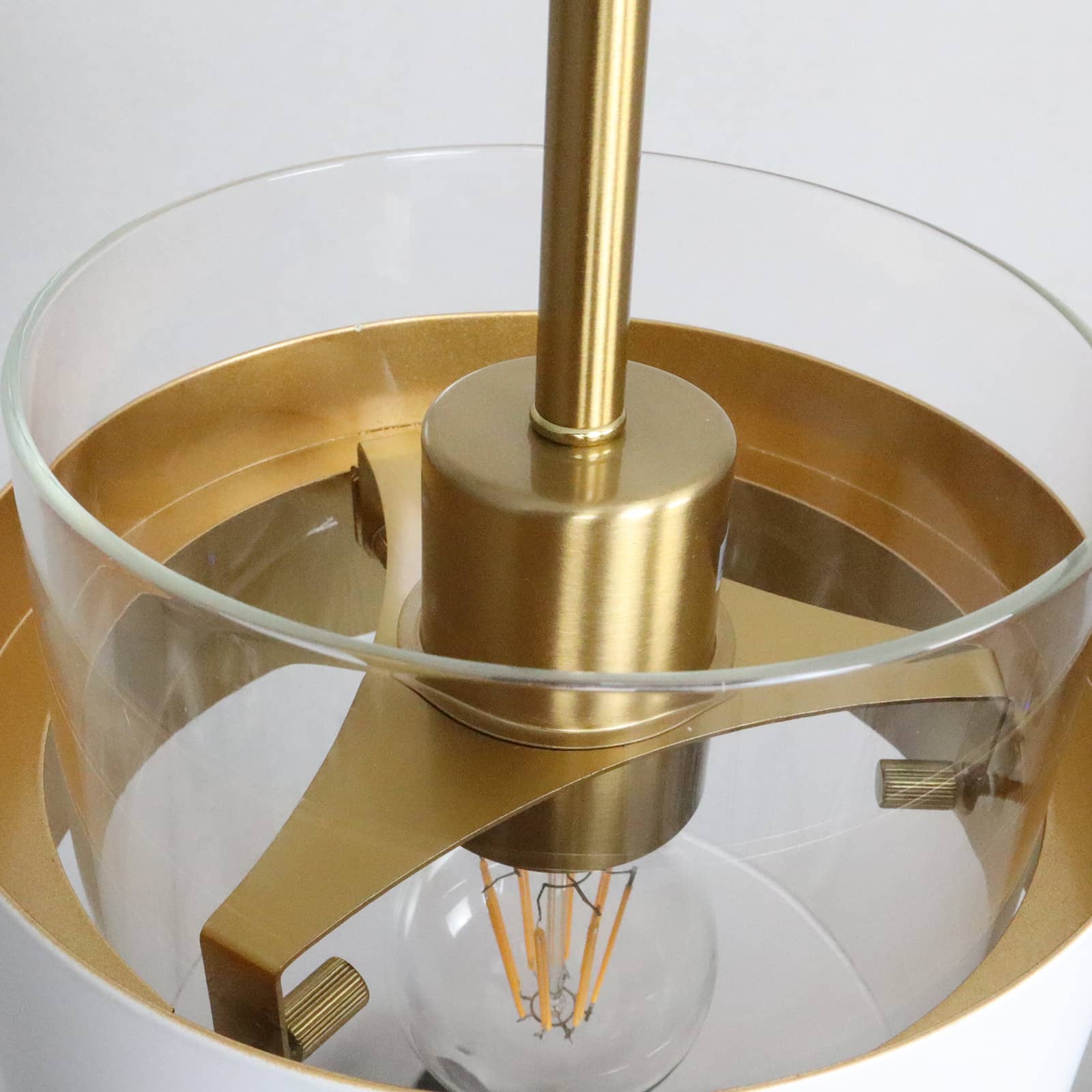 The modern glass kitchen pendant light’s canopy, hanging rods, and lamp holder flaunt an electrophoretic gold finish, sprucing up your living space with a glint of glamour. Its open clear glass cylinder shade is encircled and protected by a floating band finished in white. The color makes your home fizz with a pop of personality and adds a ton of eye appeal to the scene. A mix of finishes encompasses both modern-inspired qualities and industrial elements, yet maintains a feeling of relaxed coastal charm. The white floating band establishes a mesmerizing contrast against the clear glass shade and the gold finish, introducing visual intrigue into the space. It is sloped/vaulted ceiling adaptable and comes with three 12-inch rods and one 6-inch rod.