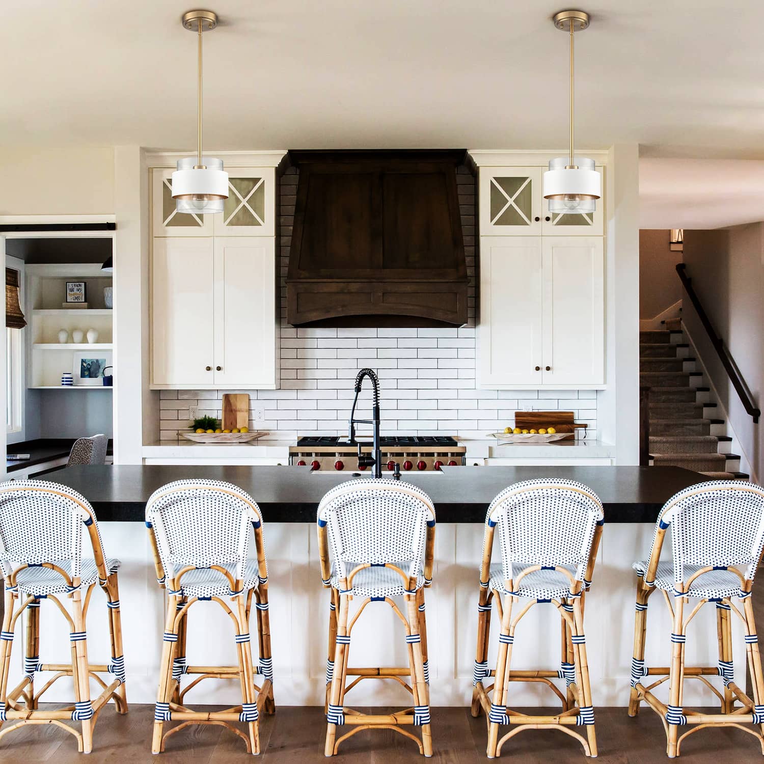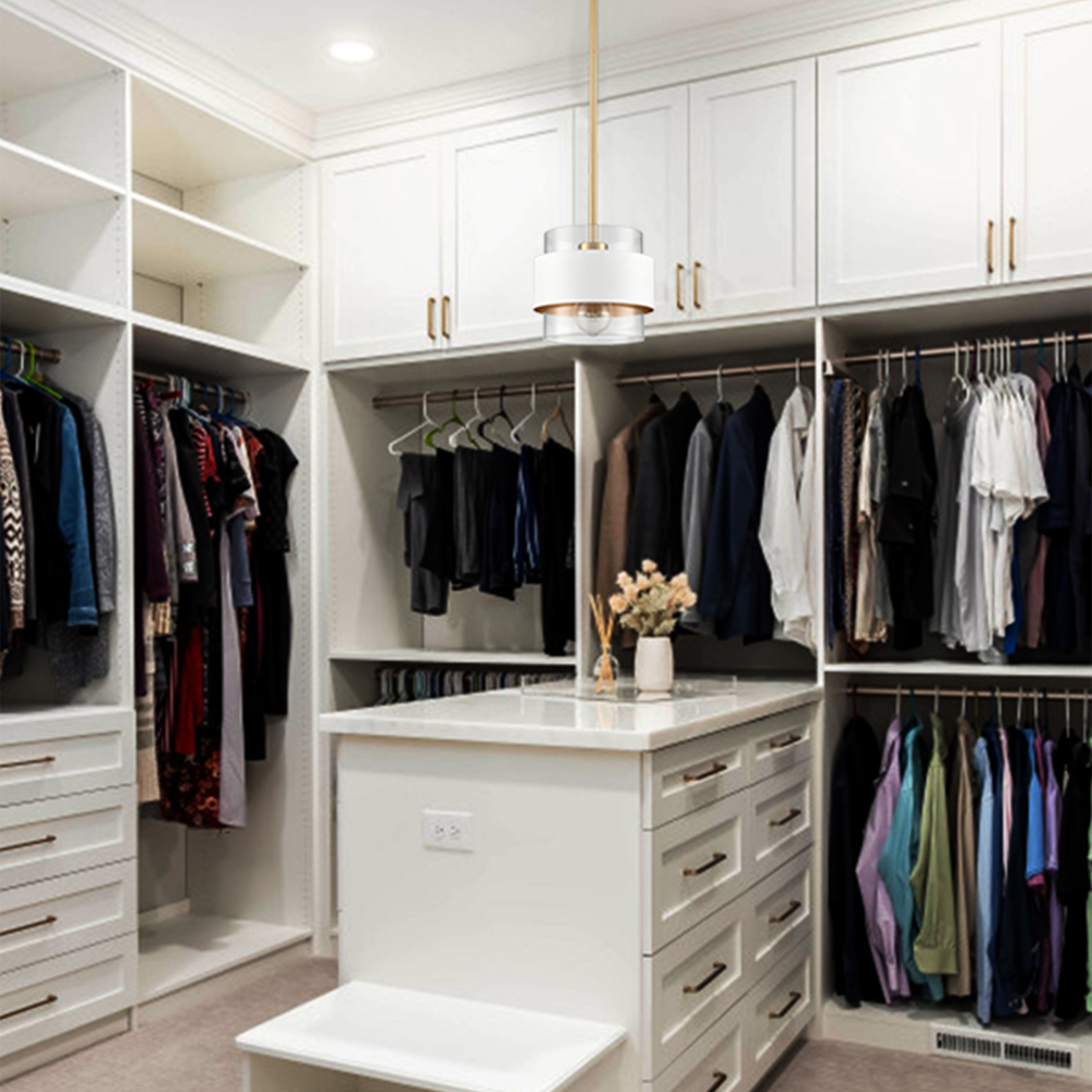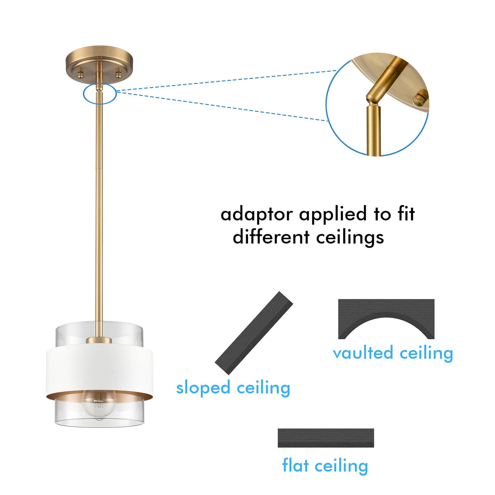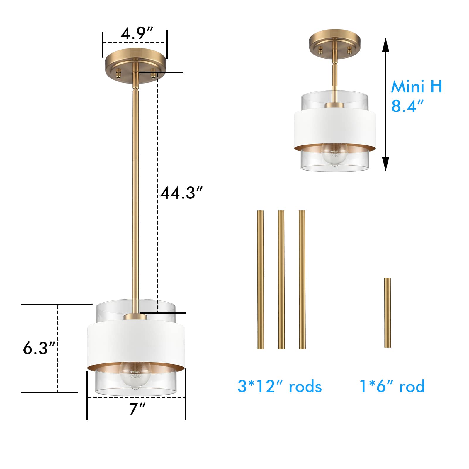 The modern glass kitchen pendant light’s canopy, hanging rods, and lamp holder flaunt an electrophoretic gold finish, sprucing up your living space with a glint of glamour. Its open clear glass cylinder shade is encircled and protected by a floating band finished in white. The color makes your home fizz with a pop of personality and adds a ton of eye appeal to the scene. A mix of finishes encompasses both modern-inspired qualities and industrial elements, yet maintains a feeling of relaxed coastal charm. The white floating band establishes a mesmerizing contrast against the clear glass shade and the gold finish, introducing visual intrigue into the space. It is sloped/vaulted ceiling adaptable and comes with three 12-inch rods and one 6-inch rod.
