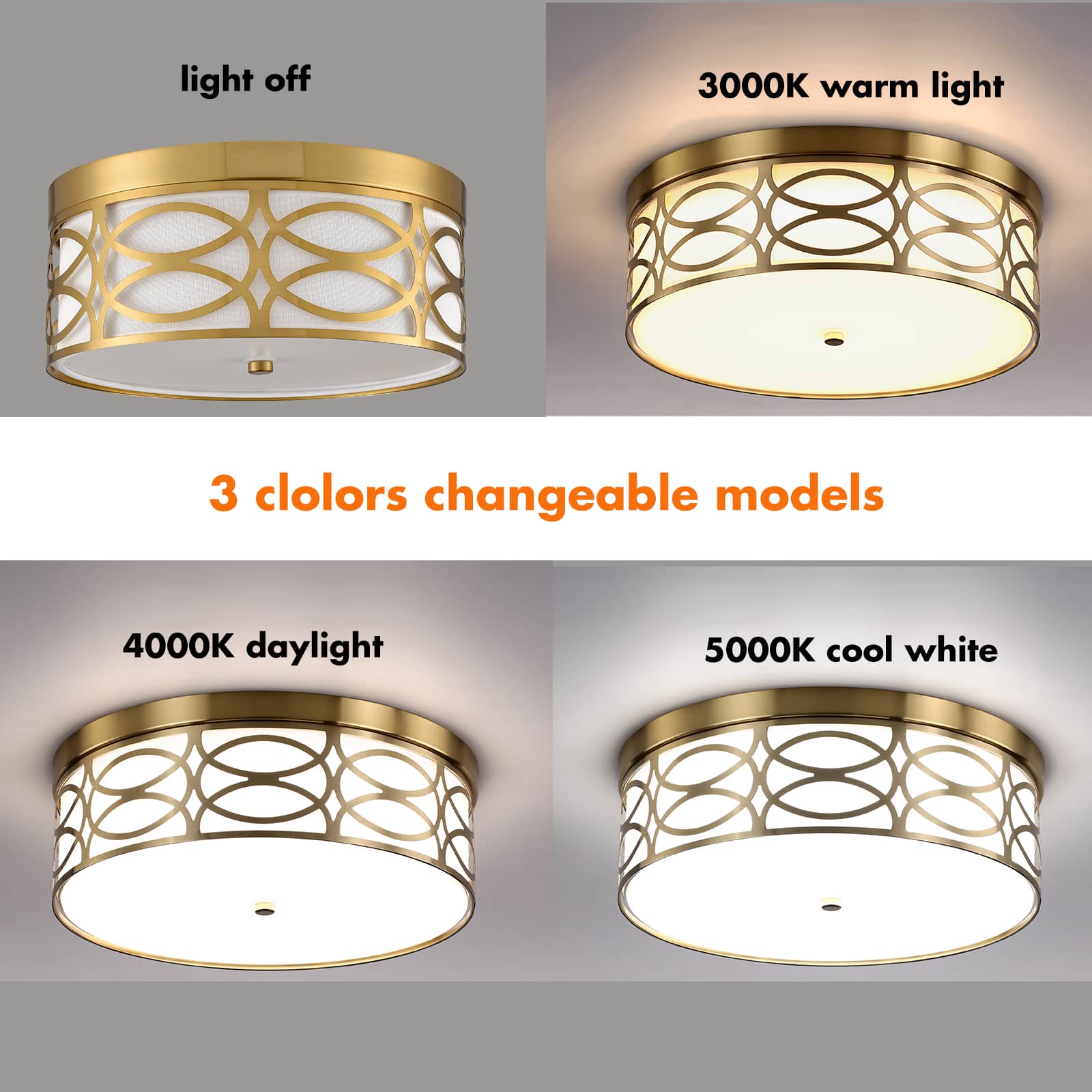 The LED flush mount ceiling light's canopy, lamp-holder, bottom accent, and airy cage are coated in an electrophoretic brass finish. Its creamy white linen drum shade is protected by an airy metal cage featuring conjoining ovals. Flaunting the covered edge workmanship, the LED flush mount ceiling light's creamy white linen lampshade casts an enchanting aura of elegance to the space. The LED flush mount ceiling light is a perfect fixture for your bedroom, dining room, entryway, hallway, living room, patio, and porch. Exuding a lovely glow throughout your space, it creates a cozy atmosphere. ETL listed for dry locations.