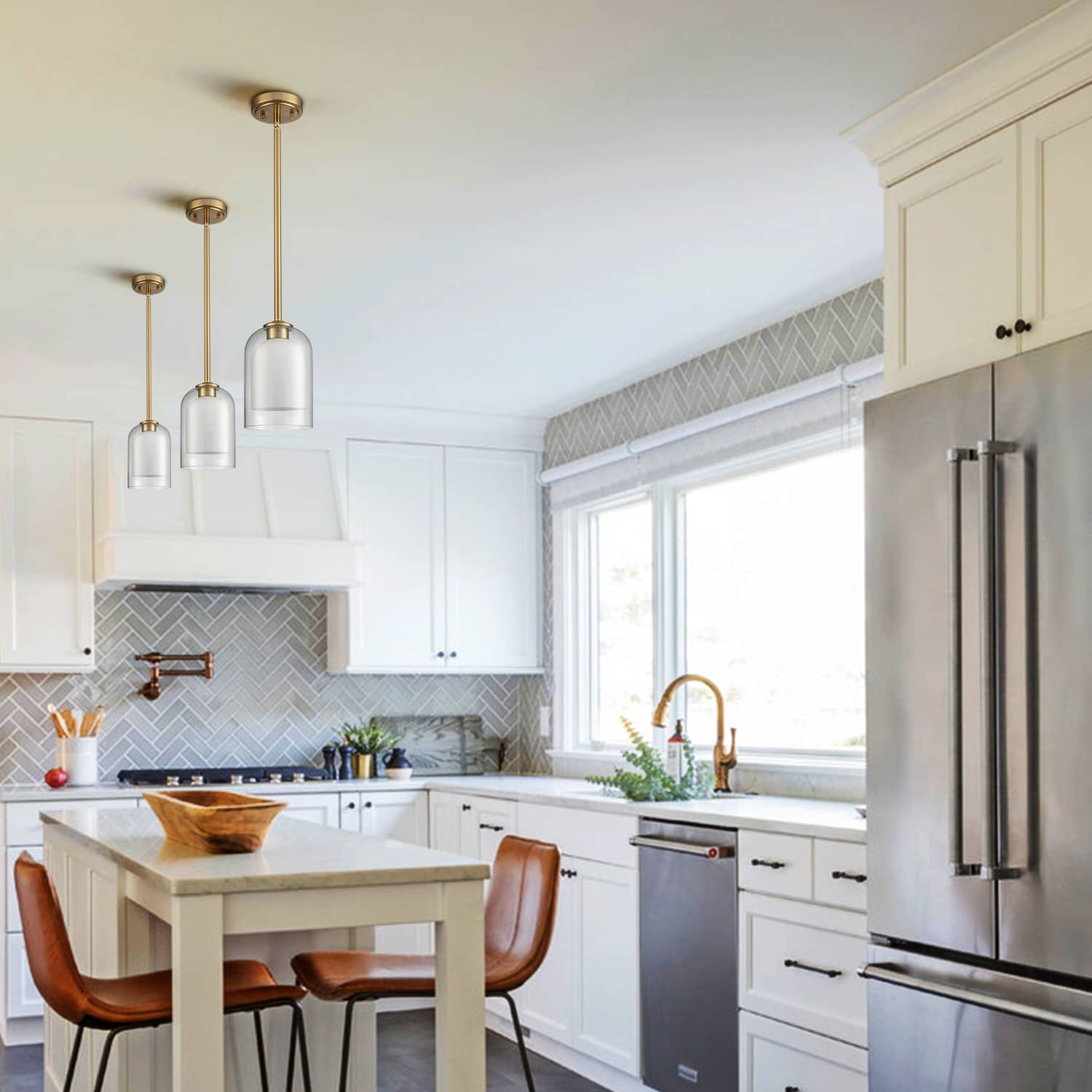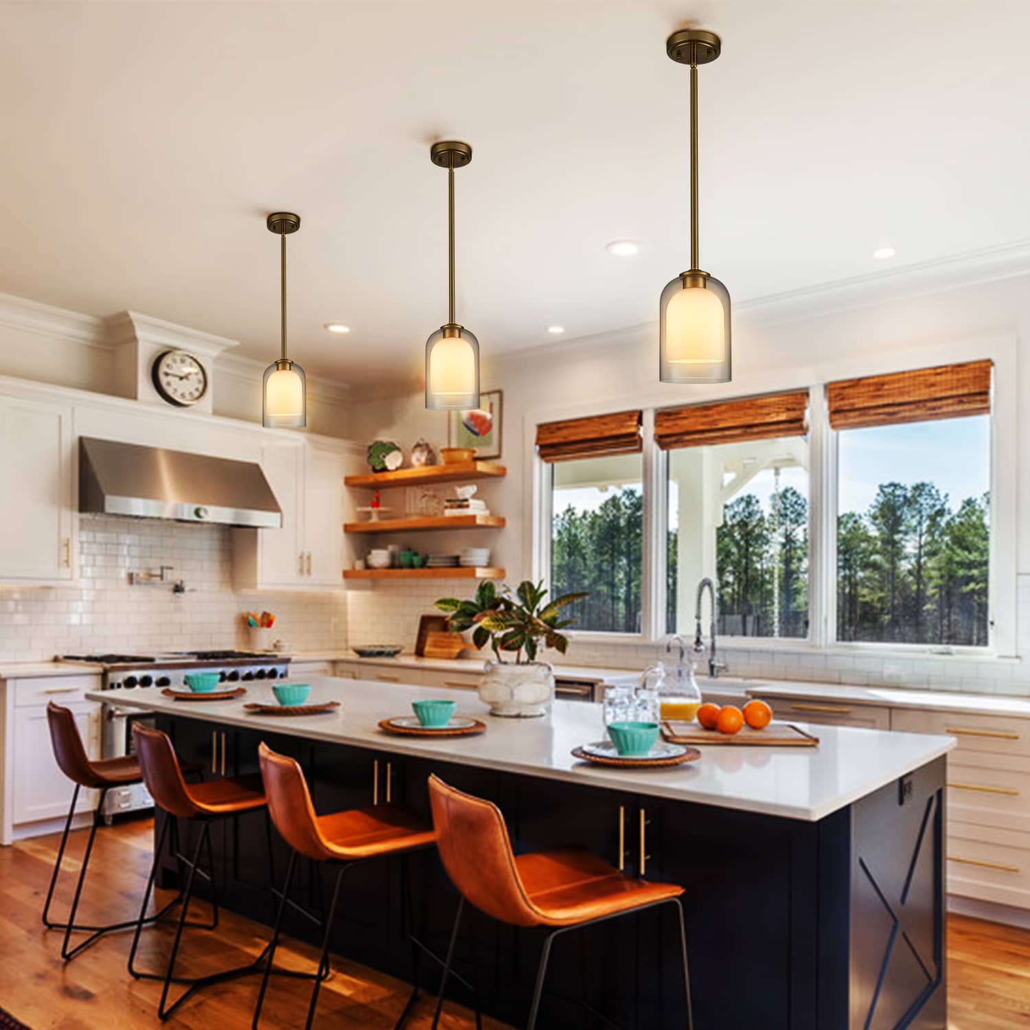 Flaunting a rustproof electrophoretic brass finish, the mini glass pendant light brings a touch of shimmer to your interior. Crafted of impurity-free hand-blown clear glass and opal glass, its double bell shades lend understated elegance and industrial chic to your living space. It doubles up on the glass bell shades, creating layers of nuanced light. Its inner opal glass bell shade is encircled and protected by a bigger clear glass bell shade, boasting elegant geometry and adding a ton of eye appeal to the scene. It is sloped/vaulted ceiling adaptable and comes with three 12-inch rods and one 6-inch rod.