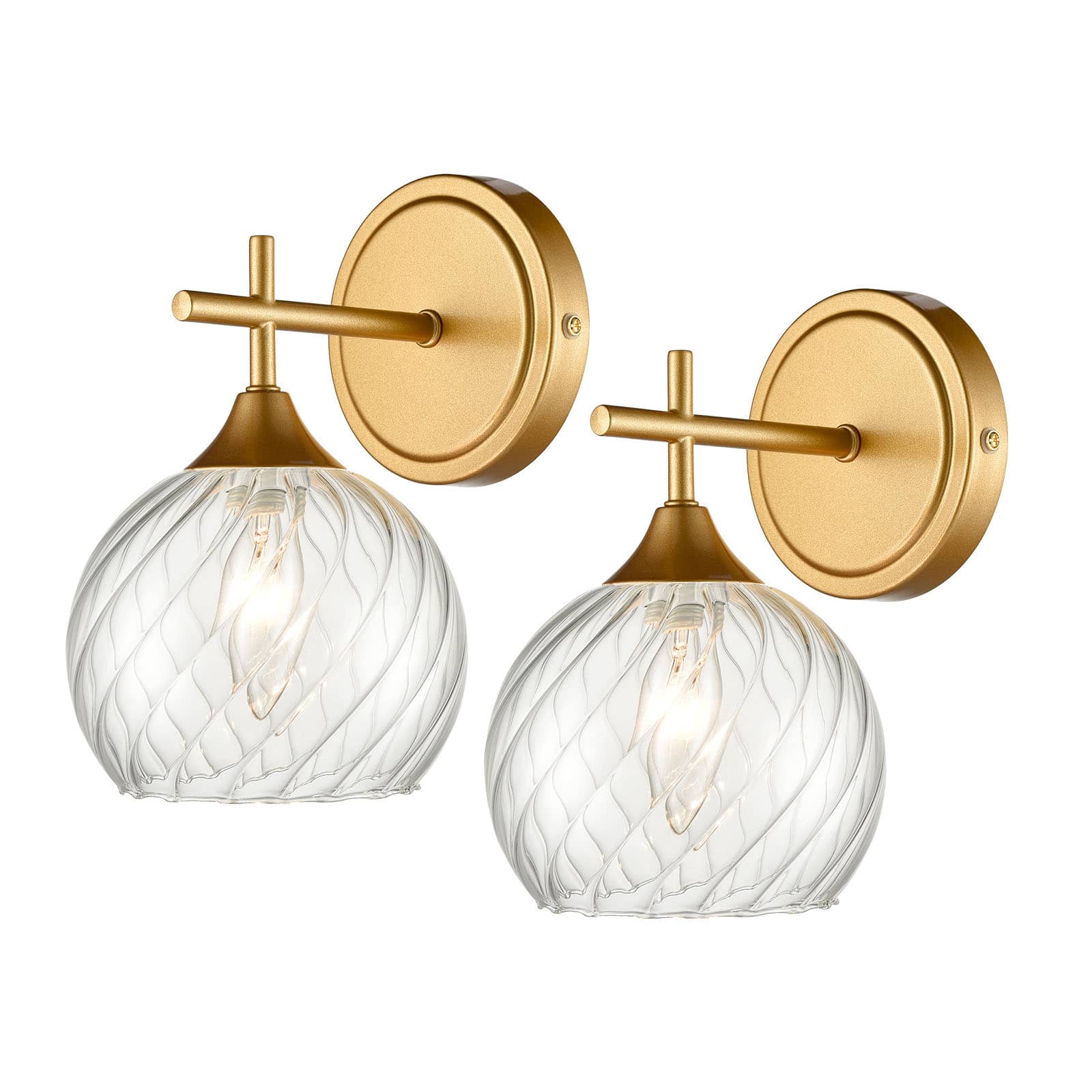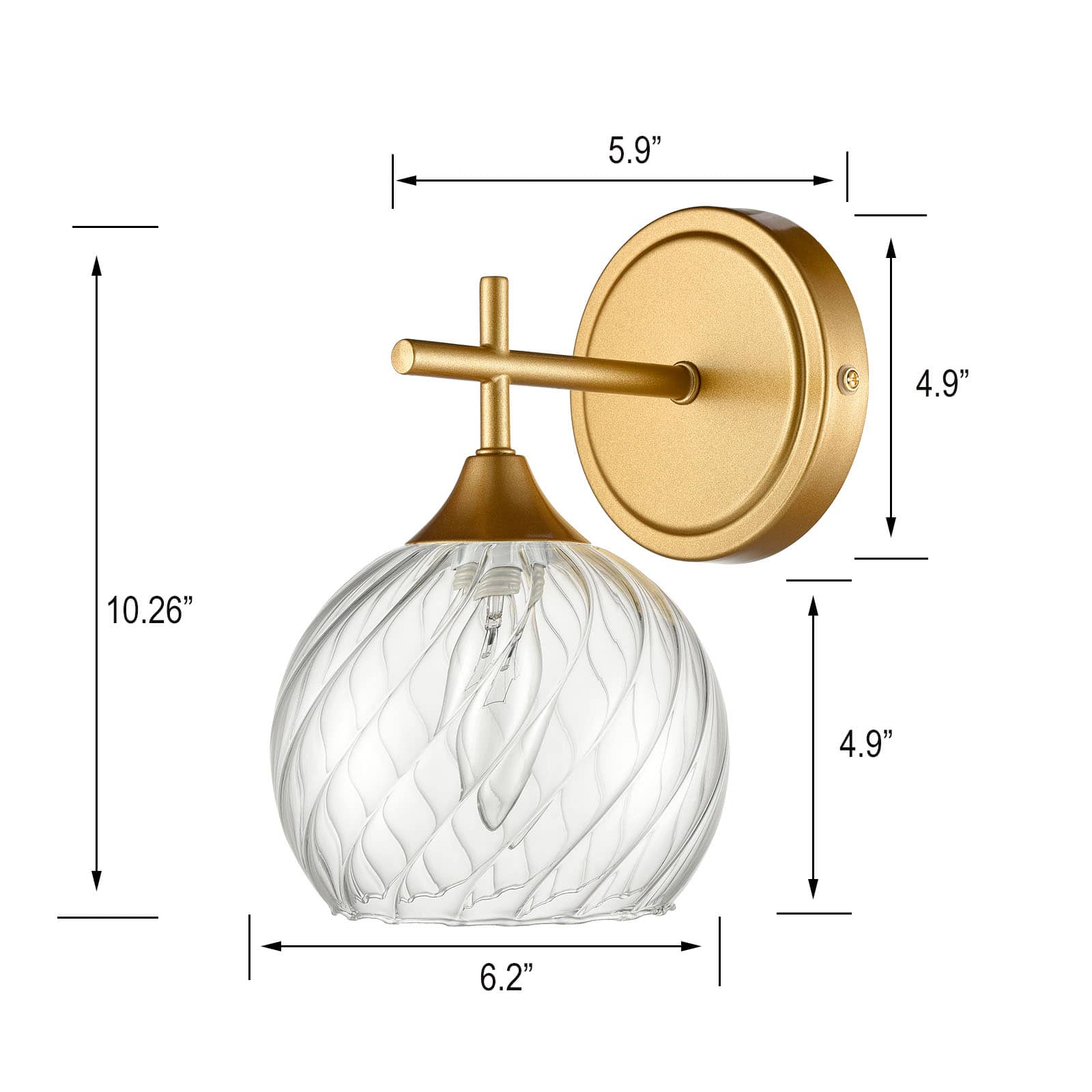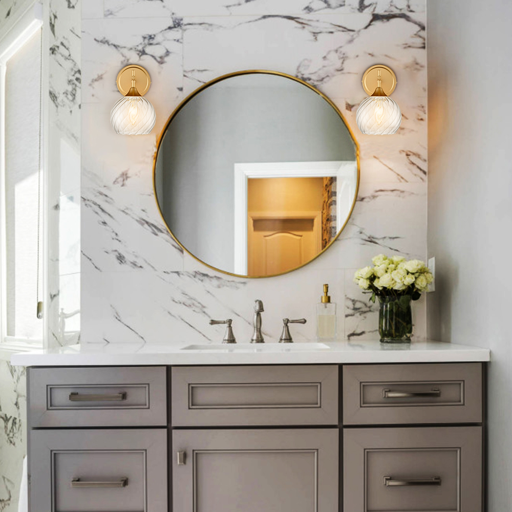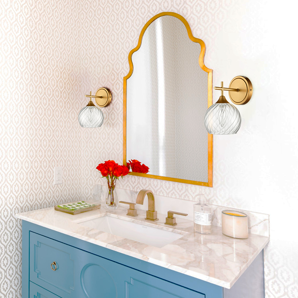 The vintage gold bathroom wall sconces show off a boost of sparkle with their shimmery gold finish. Their clear glass shades that flaunt leave pattern provide attractive eye appeal and convey a refined touch to your home. Their hand-blown clear glass globe shades introduce a large dose of texture to the space. Boasting a sleek sphere silhouette, they show off the beauty of geometry and complete the aesthetic with an elegant touch. A charming glow shines through the glass shade, creating intriguing light effects and shades.