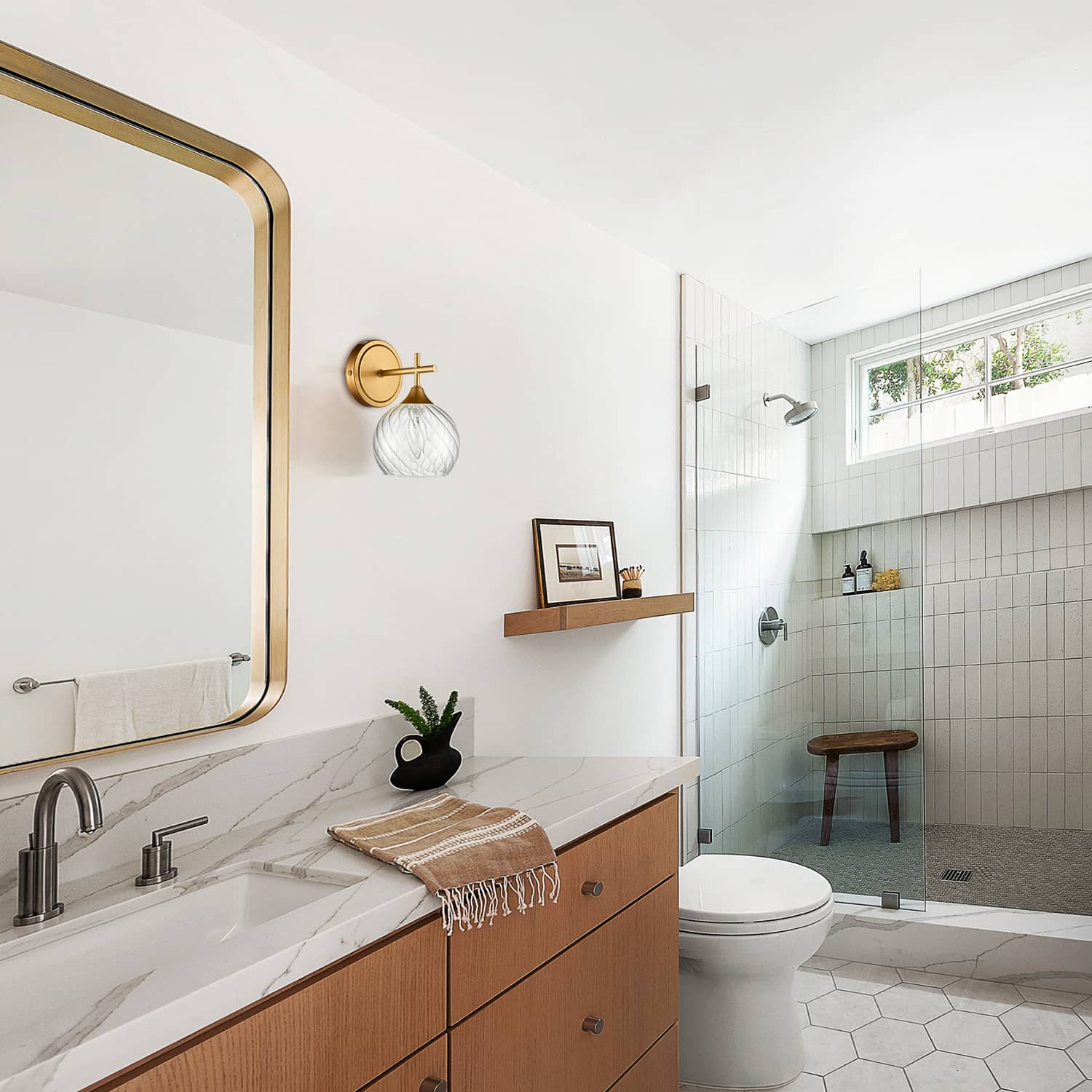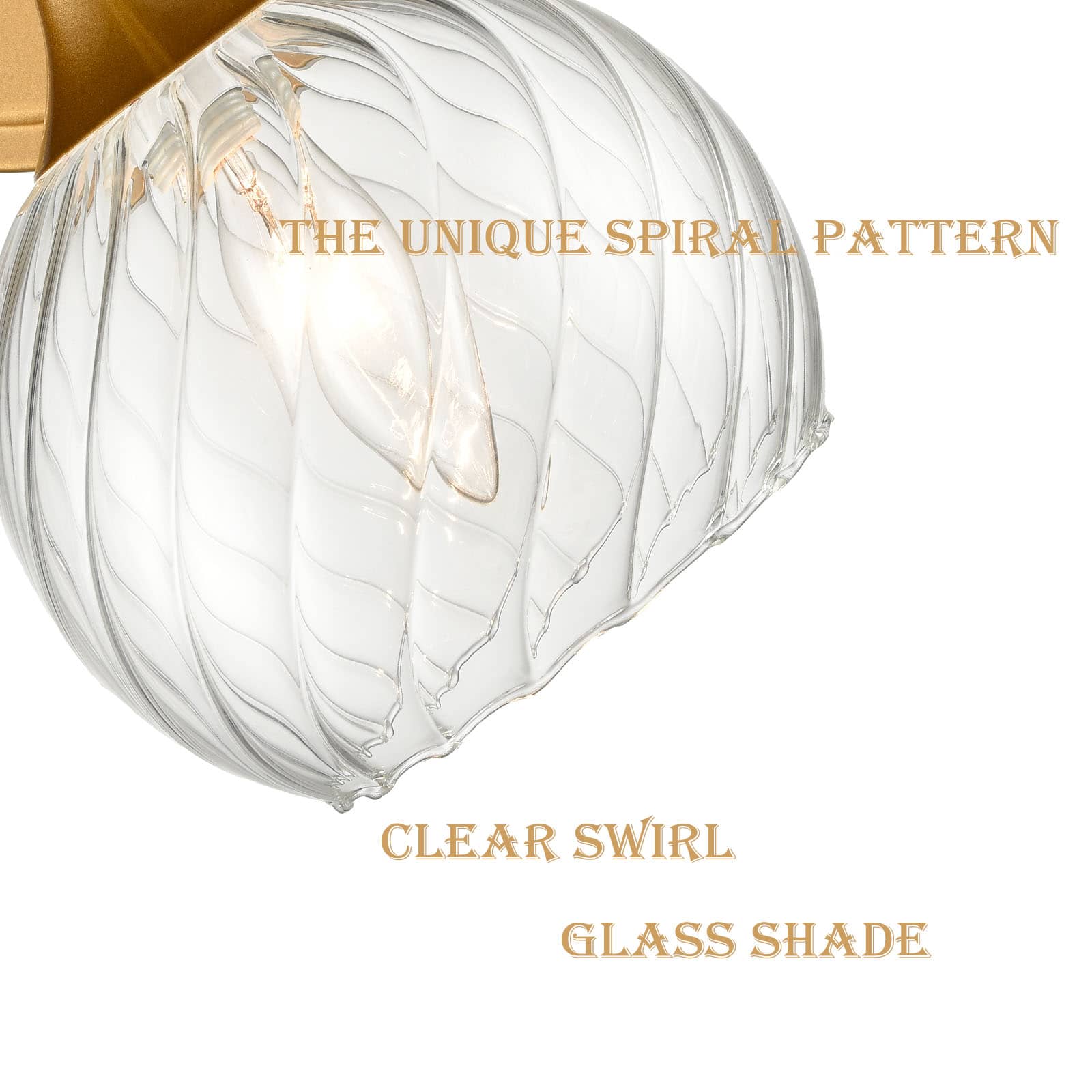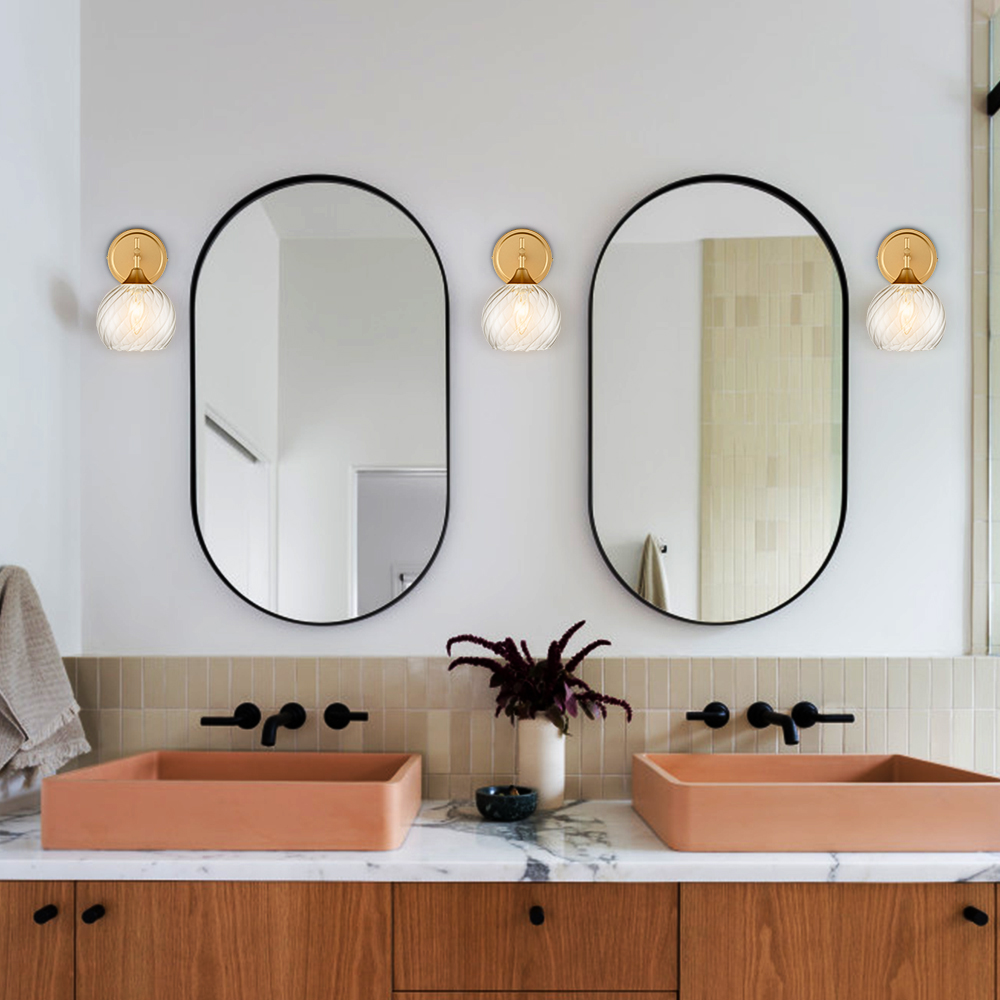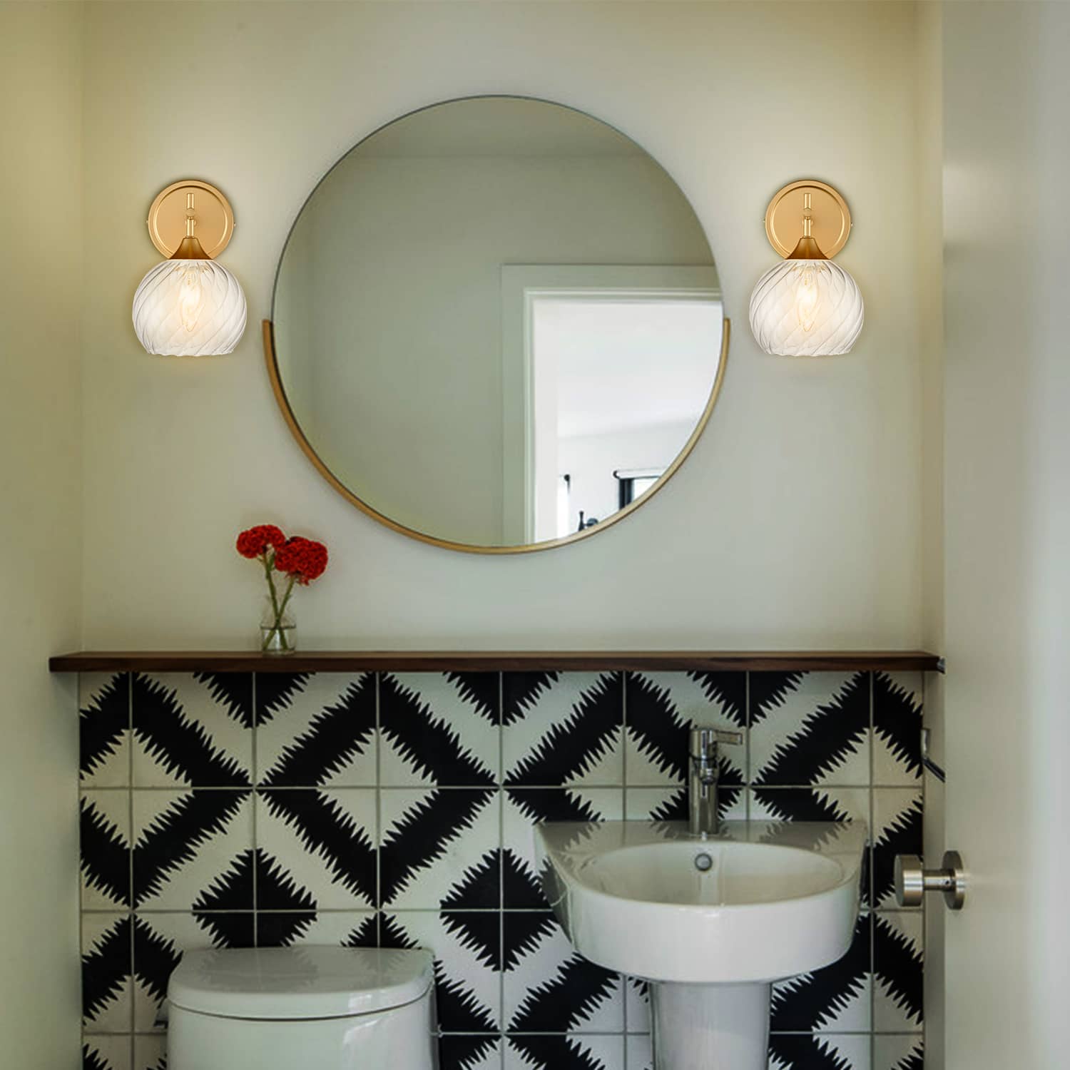The vintage gold bathroom wall sconces show off a boost of sparkle with their shimmery gold finish. Their clear glass shades that flaunt leave pattern provide attractive eye appeal and convey a refined touch to your home. Their hand-blown clear glass globe shades introduce a large dose of texture to the space. Boasting a sleek sphere silhouette, they show off the beauty of geometry and complete the aesthetic with an elegant touch. A charming glow shines through the glass shade, creating intriguing light effects and shades.