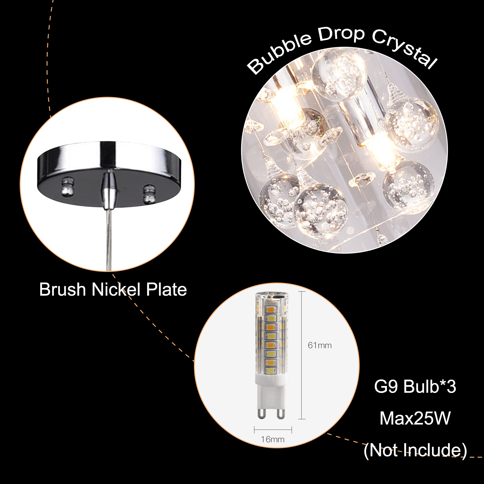 This light is stunning! Just note that the 3 G9 bulbs that are not included are about $8 each at local major hardware store, and there weren't many there, so check ahead of time.