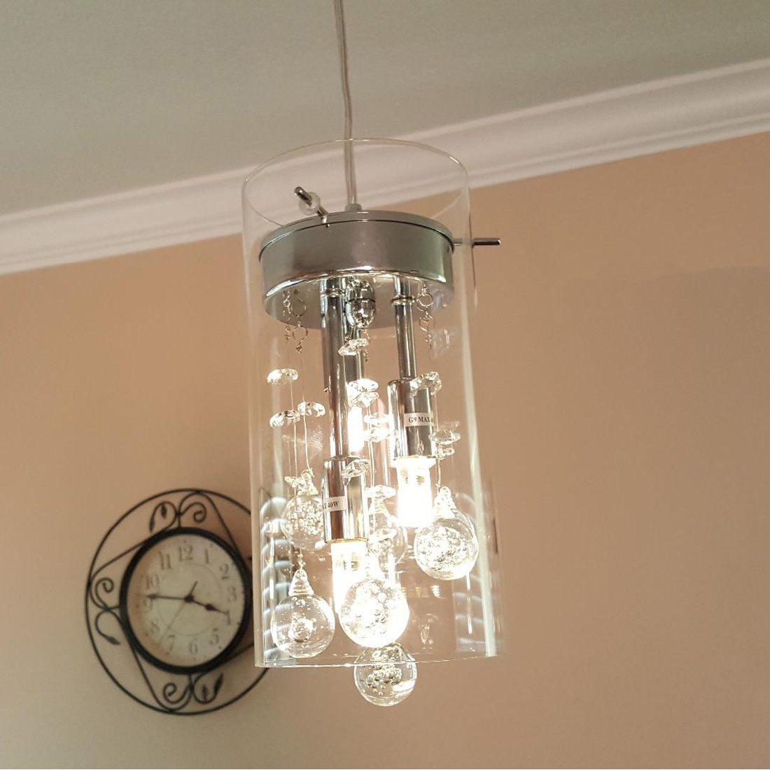 This modern crystal pendant light’s canopy and lamp holder are coated in a chrome finish, bringing a glitzy brightness to your home decor. The crystal pendant light boasts a clear glass cylinder shade, adding an aura of elegance to any room’s aesthetic. The lamp holders of the mini crystal pendant light are surrounded by seven transparent shimmery bubble crystal pendants, exuding a luxurious vibe to your overall design scheme. Crystal chandeliers and pendant lights look elegant and this glass cylinder fixture is exactly what you need to add a touch of luxury to your home decor.