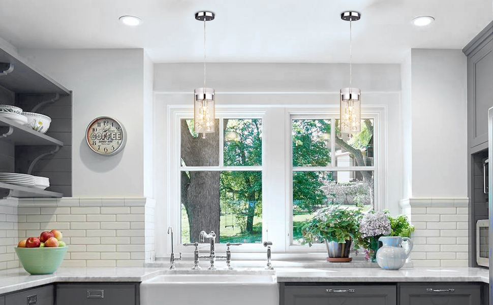 This modern crystal pendant light’s canopy and lamp holder are coated in a chrome finish, bringing a glitzy brightness to your home decor. The crystal pendant light boasts a clear glass cylinder shade, adding an aura of elegance to any room’s aesthetic. The lamp holders of the mini crystal pendant light are surrounded by seven transparent shimmery bubble crystal pendants, exuding a luxurious vibe to your overall design scheme. Crystal chandeliers and pendant lights look elegant and this glass cylinder fixture is exactly what you need to add a touch of luxury to your home decor.