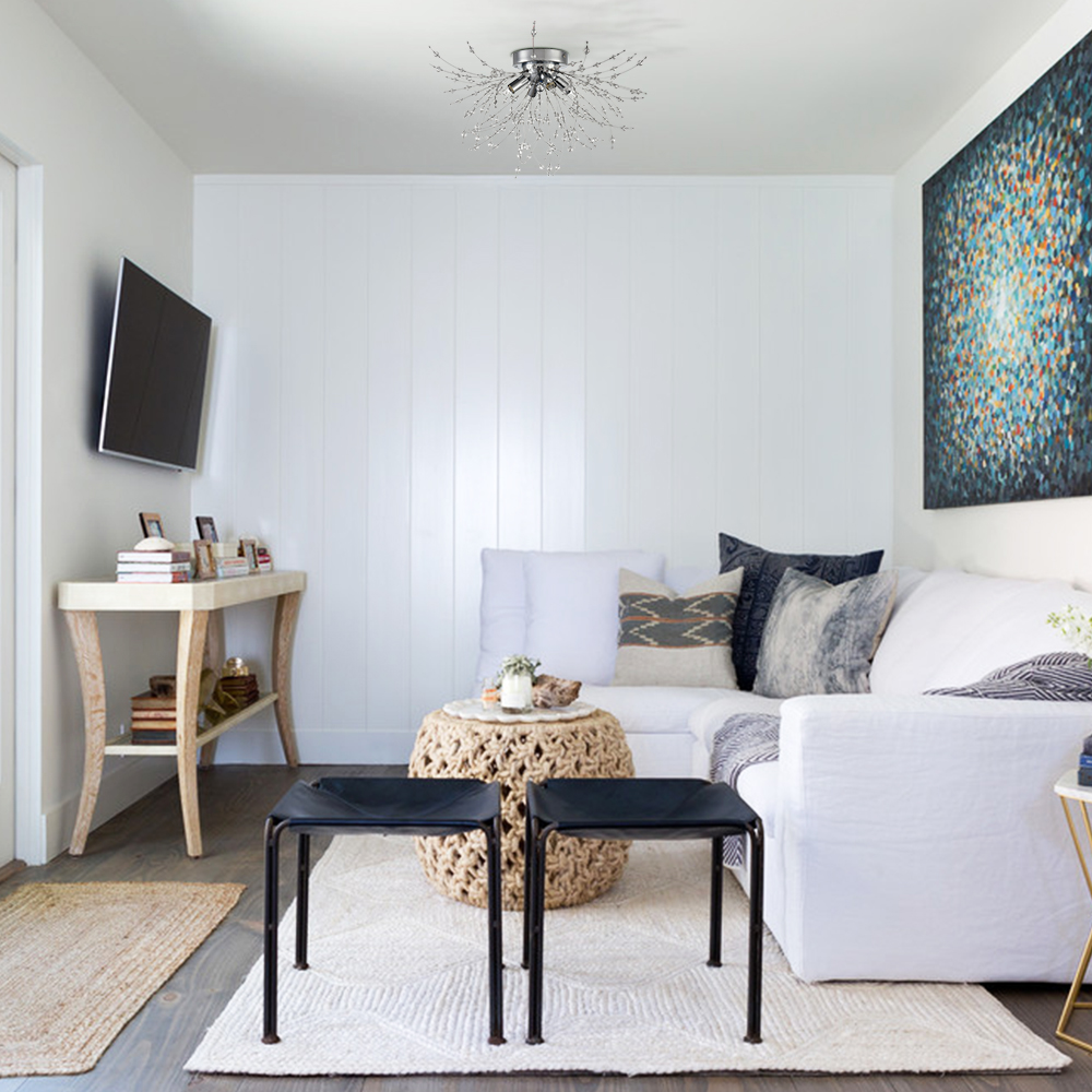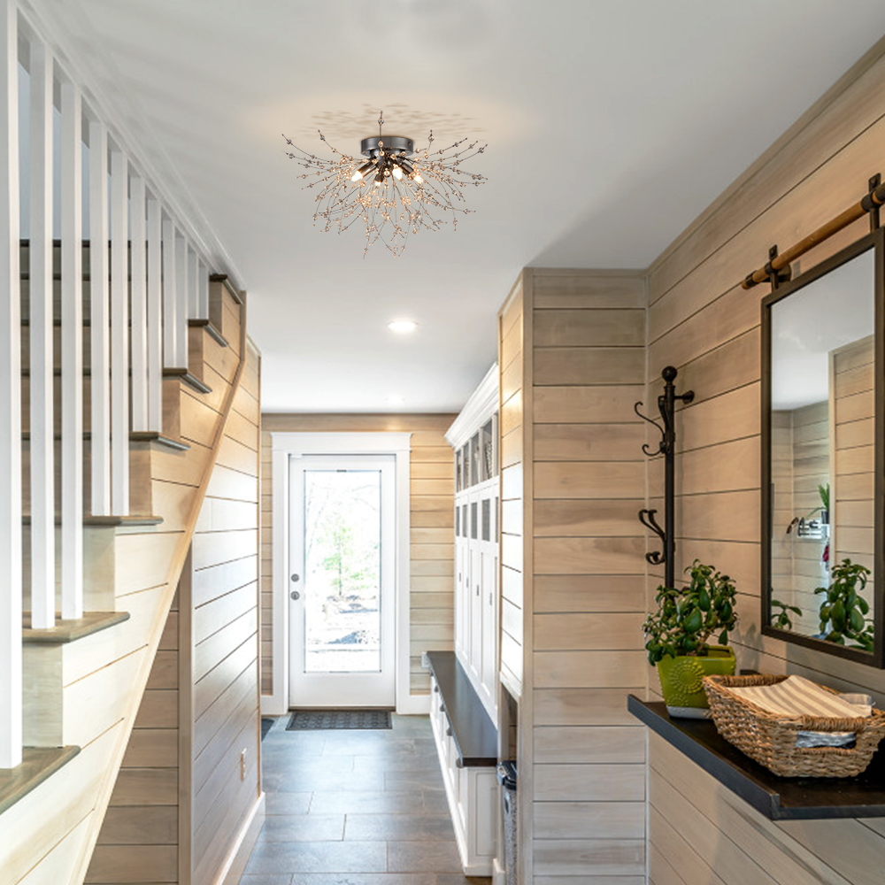 Showing off a rustproof chrome finish, the crystal semi flush ceiling light effortlessly lends a nice pop of brightness to your living space. Inspired by the appearance of dandelion flowers, it encompasses glamour and whimsy. Boasting a multitude of K9 crystal branches and four lamp holders shooting out from the center sphere, it delivers a huge dose of contemporary sparkle and shine. Its crystal beads on the wires largely resemble hundreds of tiny flowers collected together into a composite flower head, providing a ton of eye appeal and packing a powerful, artistic punch to your home. A charming glow shines through the crystal branches, which creates intriguing light effects and shades.