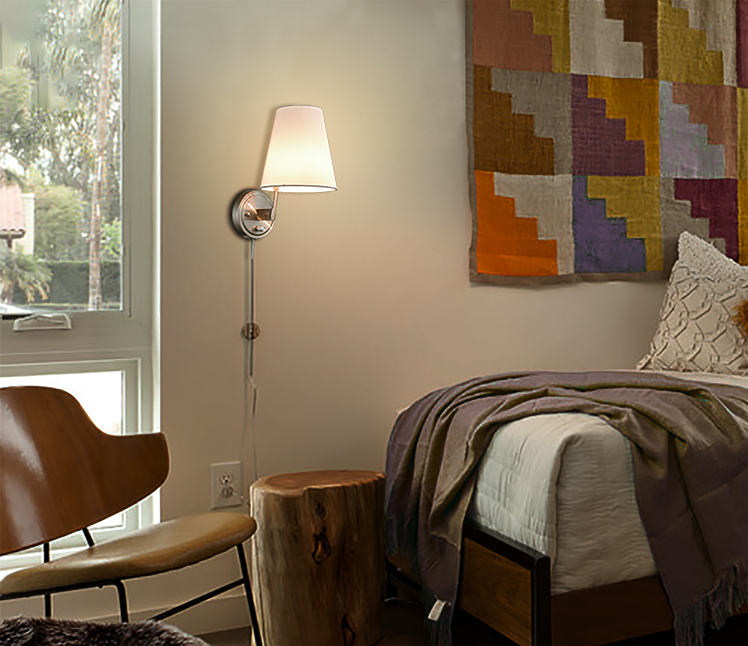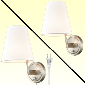 The plug-in wall lamps boast a brushed nickel finish, perking up your living space with their metallic glitz. Their creamy white linen trapezoid shades lend a muted style to your home decor. They are playing with geometry and shapes and add a touch of modernity to your home interior. The light pouring through the fabric lampshade is gently muted and fills the space without any glare. The switch on the wall lights is just an on/off switch without a dimming function. They are awesome additions to your interior with their modern touch.
