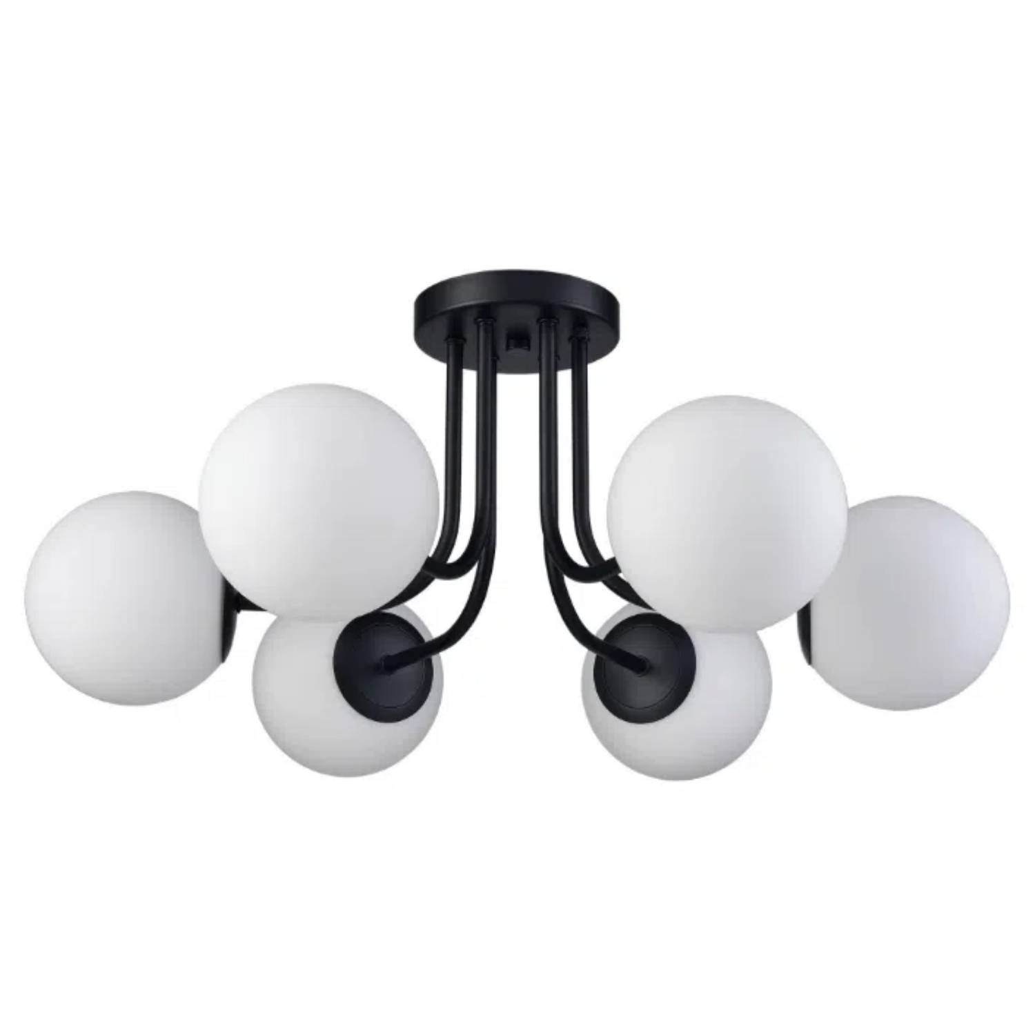 Boasting a rustproof semigloss black finish, the modern globe black semi flush mount ceiling light’s canopy, arms, and lamp-holders bring a dash of drama to your interior. Crafted from impurity-free hand-blown opaque opal glass, it provides the perfect blend of mid-century classic and contemporary elements. Its opal glass shades contrast the black finish and showcase a classic black-and-white color combo. The semigloss black finish flaunts four coats of paint that are applied to the light fixtures by hand. Its black paint features 220-degree high-temperature baking varnish craft for strong adhesion. Six glass shades are supported by gracefully curved arms, conveying a refined touch. The globe shades can distribute light evenly to avoid shadows.