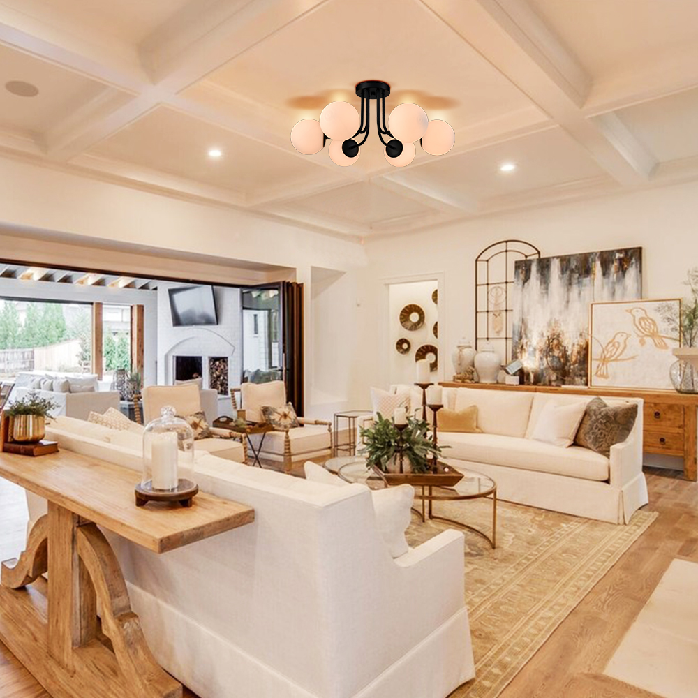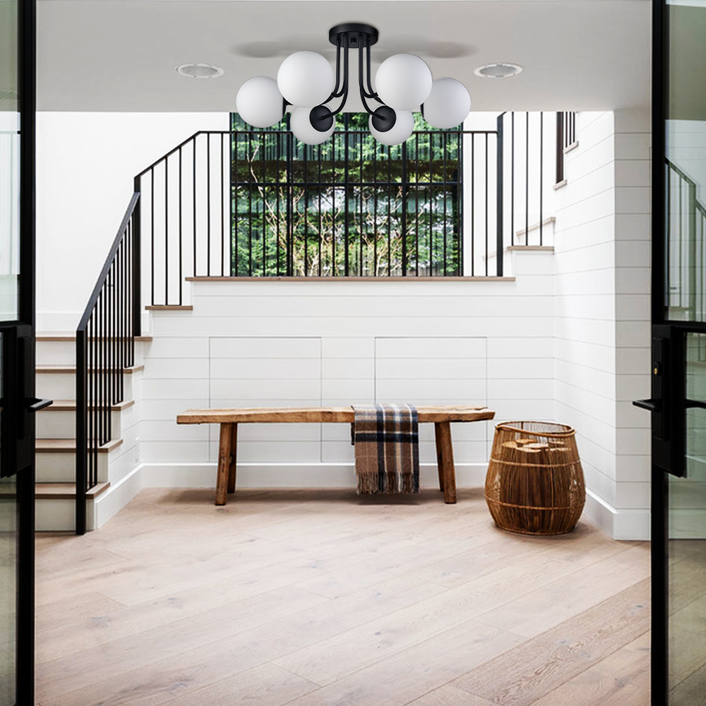 Boasting a rustproof semigloss black finish, the modern globe black semi flush mount ceiling light’s canopy, arms, and lamp-holders bring a dash of drama to your interior. Crafted from impurity-free hand-blown opaque opal glass, it provides the perfect blend of mid-century classic and contemporary elements. Its opal glass shades contrast the black finish and showcase a classic black-and-white color combo. The semigloss black finish flaunts four coats of paint that are applied to the light fixtures by hand. Its black paint features 220-degree high-temperature baking varnish craft for strong adhesion. Six glass shades are supported by gracefully curved arms, conveying a refined touch. The globe shades can distribute light evenly to avoid shadows.