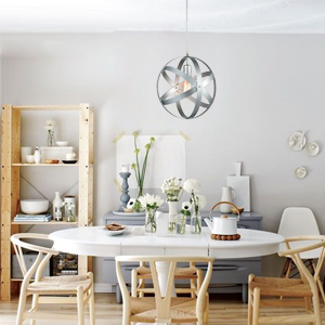 The pendant light’s rustproof and corrosion-proof silver gray finish gives your home decor a metallic glitz and a rustic chic. Its spherical metal shade flaunts an atom-inspired design structure that crisscrosses and weaves to surround a bulb. Four interlocking circles bring geometric elegance to your interior. Crafted of 25mm metal strips, the pendant light’s four metal circles can be adjusted to get a slightly different look to go with your room design scheme by loosening the screws. Its ceramic lamp-base is solid and durable with good conductivity and electricity leakage protection.The pendant light can be used to provide both function and style in kitchen, bedroom, dining room and living room.
