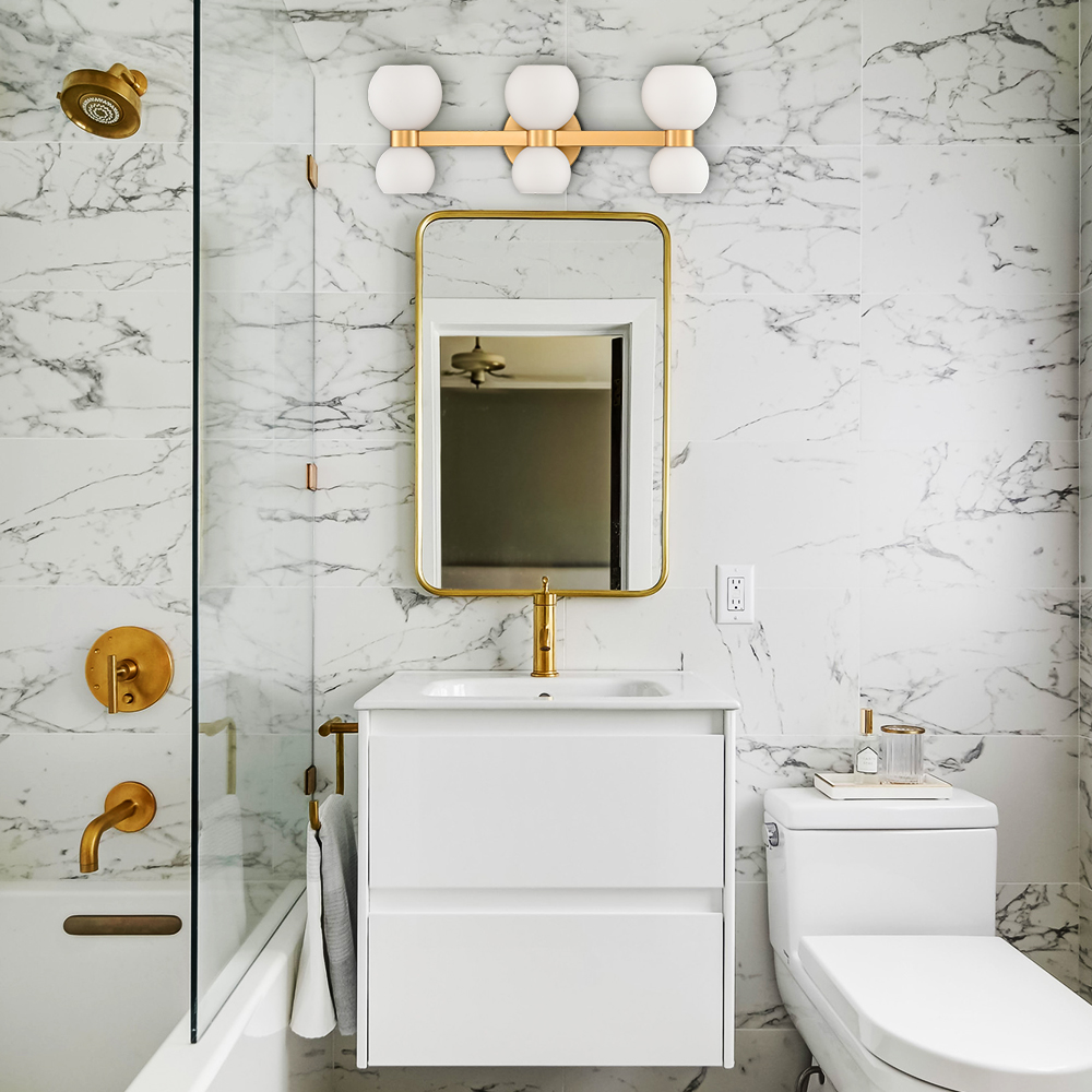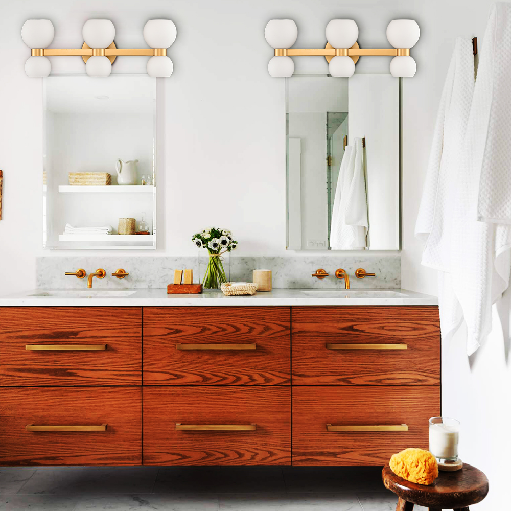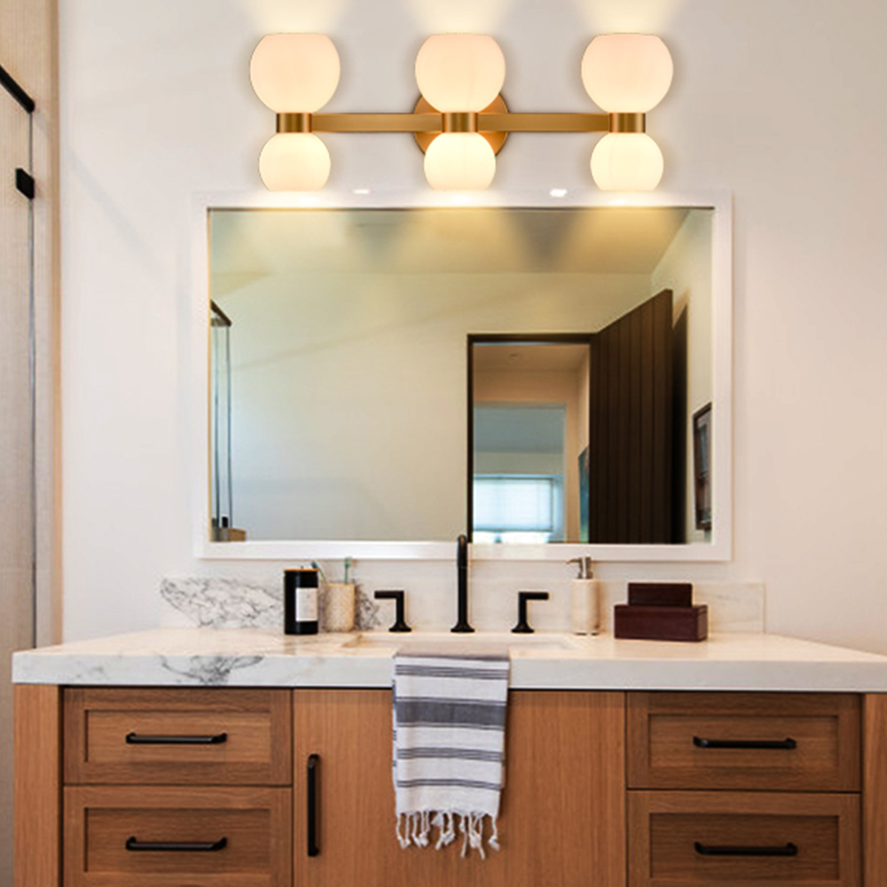 The modern gold bath vanity light’s canopies, lamp holders, and arms are accented with a rustproof gold finish, pepping up your living space with a bit of bling. Crafted from impurity-free hand-blown glass, its milk glass shades distribute light evenly to avoid shadows. Its bow-knot-inspired design adds attractive eye appeal and a touch of whimsy to your interior. It is an eye-catching addition to your home with its lovely design. Its milk glass shades contrast the gold finish and add alluring visual interest to the living area.