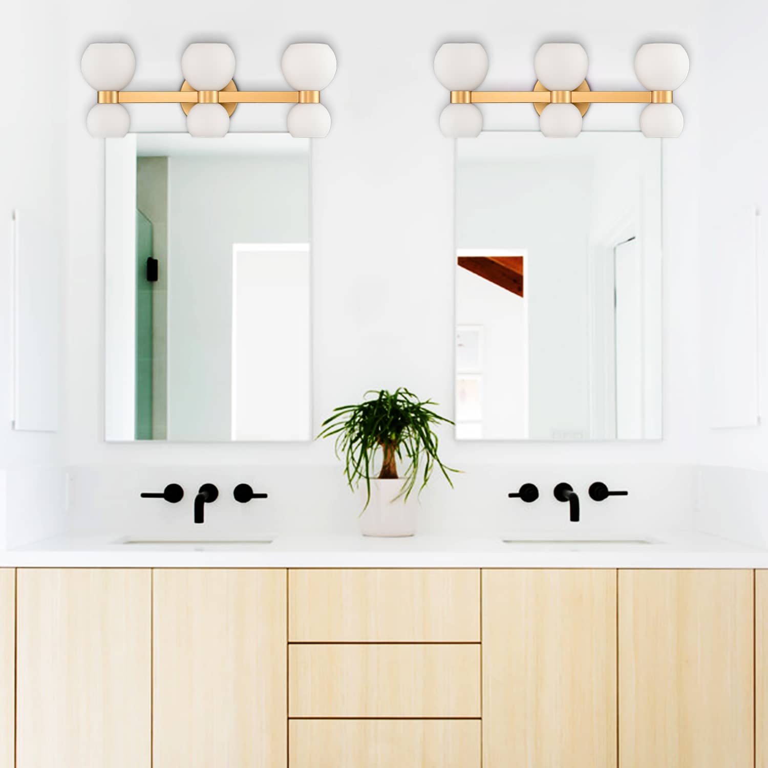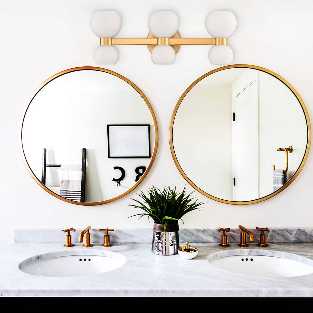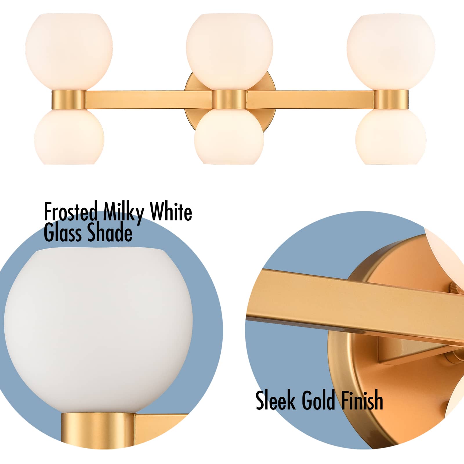 The modern gold bath vanity light’s canopies, lamp holders, and arms are accented with a rustproof gold finish, pepping up your living space with a bit of bling. Crafted from impurity-free hand-blown glass, its milk glass shades distribute light evenly to avoid shadows. Its bow-knot-inspired design adds attractive eye appeal and a touch of whimsy to your interior. It is an eye-catching addition to your home with its lovely design. Its milk glass shades contrast the gold finish and add alluring visual interest to the living area.