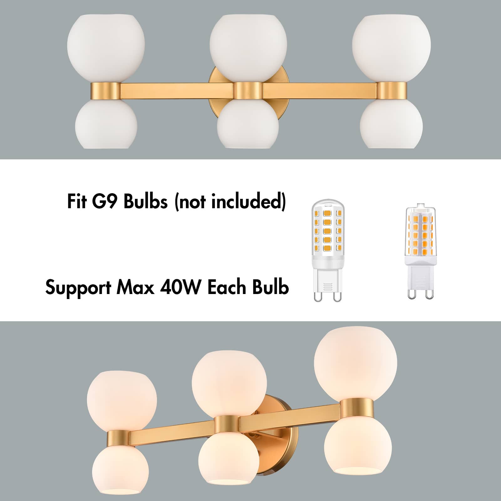 The wall sconce comes with six G9-base sockets which are compatible with a variety of bulb types: LED, INCANDESCENT, and CFL.