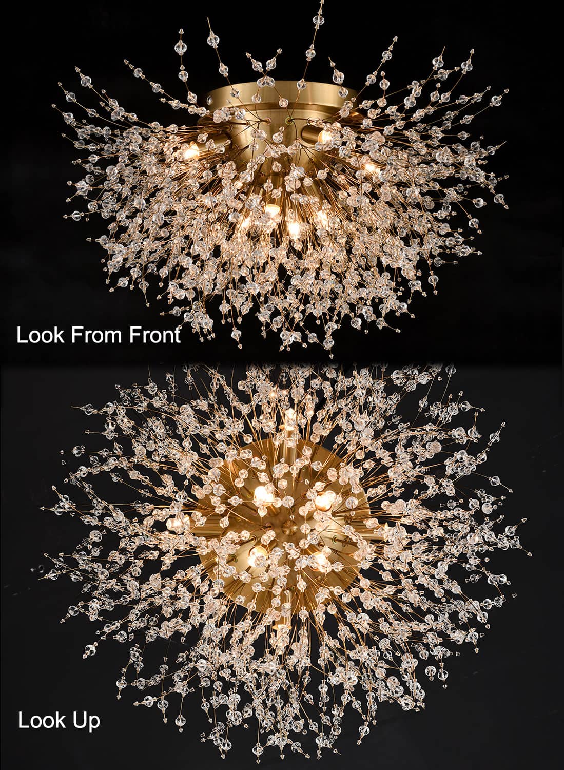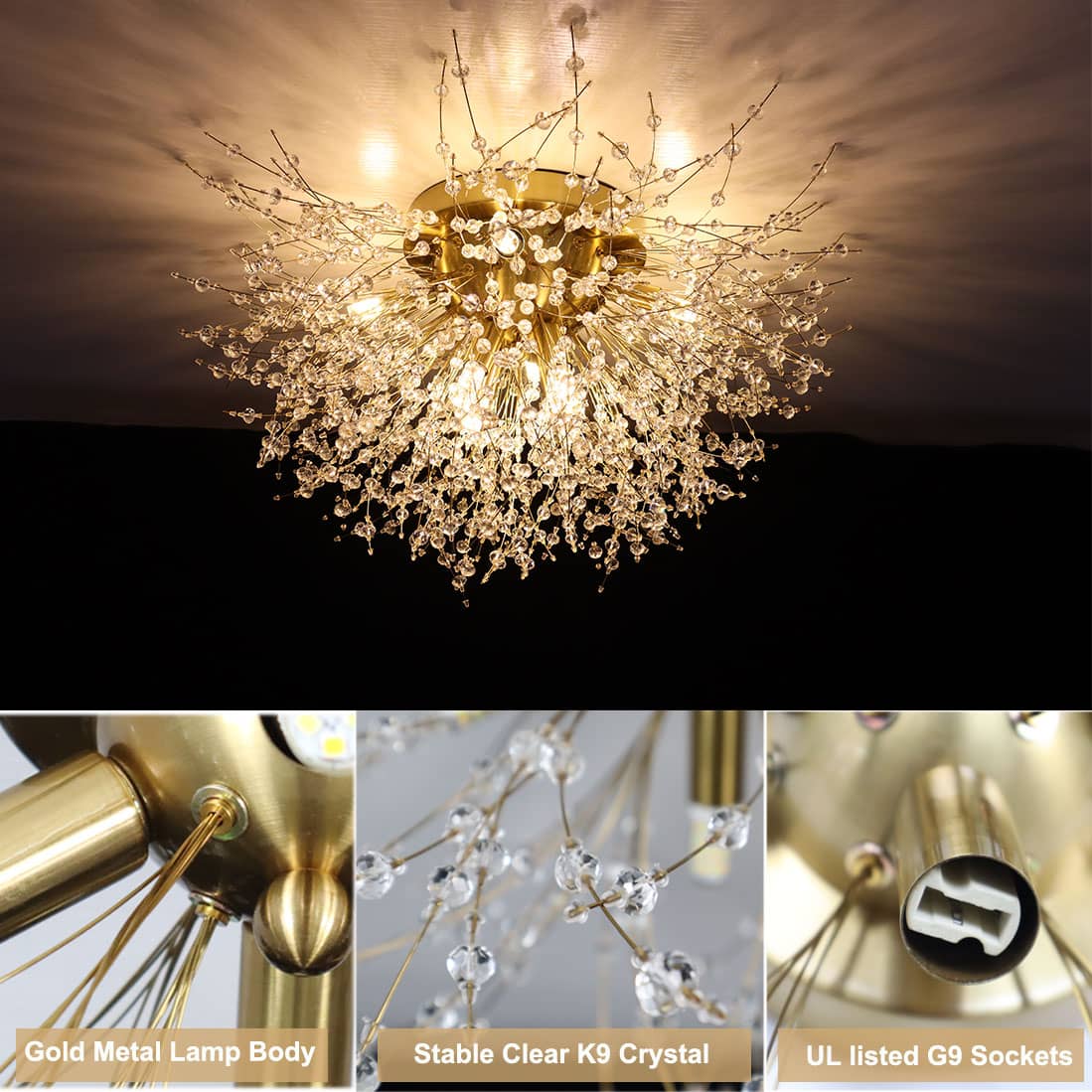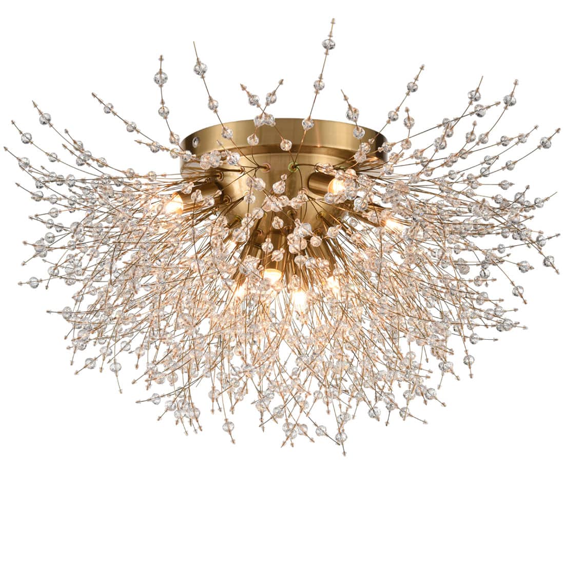 Showing off a rustproof electrophoretic brass finish, the modern gold crystal ceiling light fixture effortlessly lends a nice pop of brightness to your living space. Inspired by the appearance of dandelion flowers, the light fixture encompasses glamour and whimsy. Boasting a multitude of K9 crystal branches and eight lamp holders shooting out from the center sphere, it delivers a huge dose of contemporary sparkle and shine. Its crystal beads on the wires largely resemble hundreds of tiny flowers collected together into a composite flower head, providing a ton of eye appeal and packing a powerful, artistic punch to your home. A charming glow shines through the crystal branches, which creates intriguing light effects and shades.