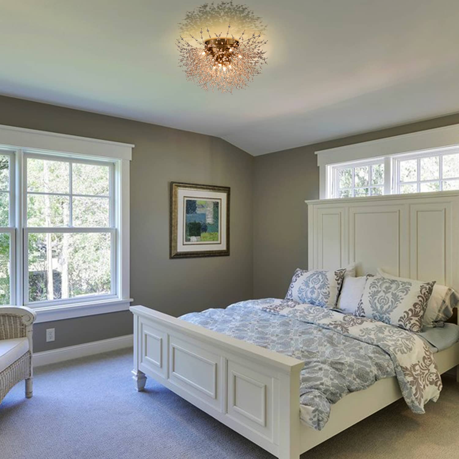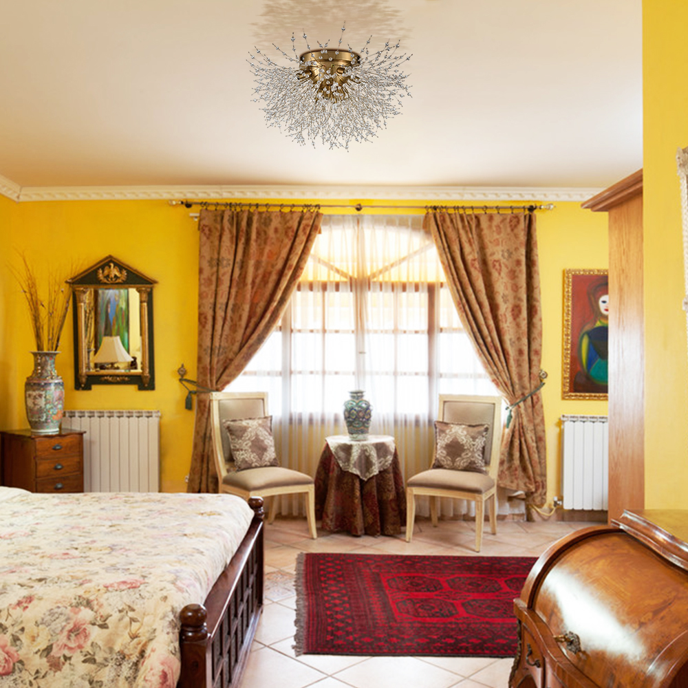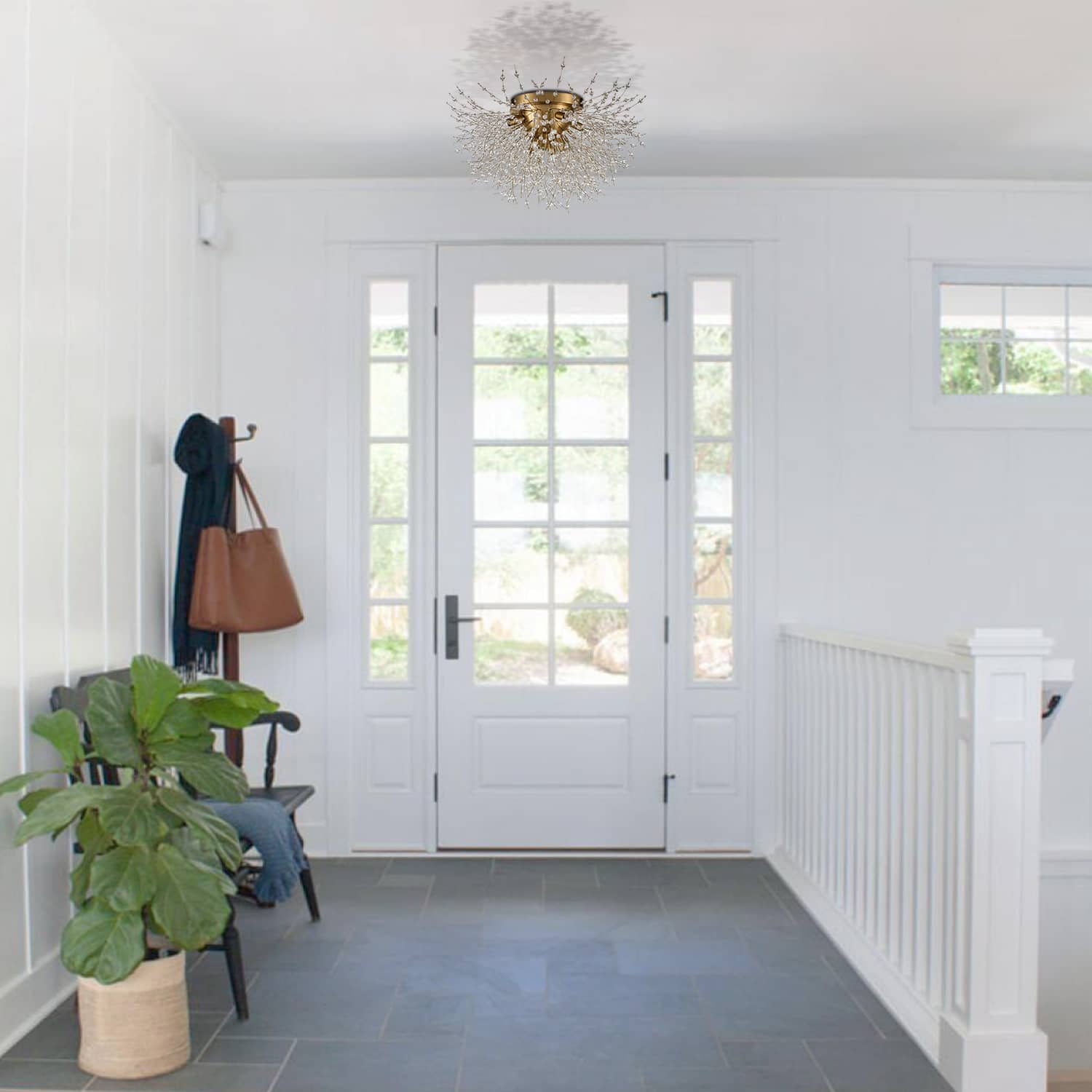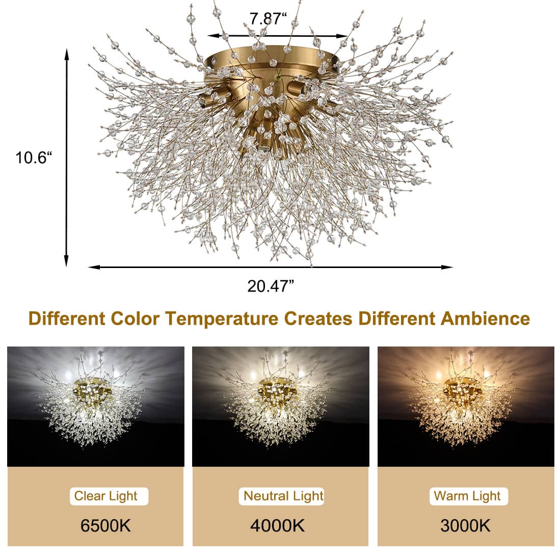 Showing off a rustproof electrophoretic brass finish, the modern gold crystal ceiling light fixture effortlessly lends a nice pop of brightness to your living space. Inspired by the appearance of dandelion flowers, the light fixture encompasses glamour and whimsy. Boasting a multitude of K9 crystal branches and eight lamp holders shooting out from the center sphere, it delivers a huge dose of contemporary sparkle and shine. Its crystal beads on the wires largely resemble hundreds of tiny flowers collected together into a composite flower head, providing a ton of eye appeal and packing a powerful, artistic punch to your home. A charming glow shines through the crystal branches, which creates intriguing light effects and shades.