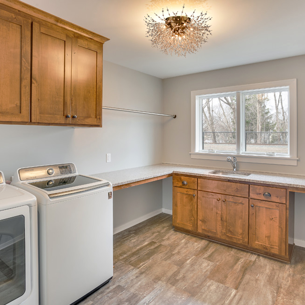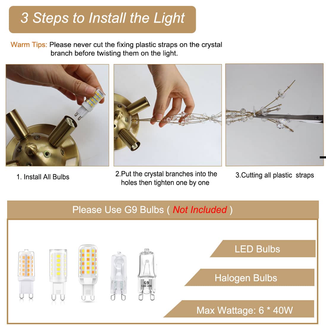 The ceiling light features 8 G9-base sockets which are compatible with a variety of bulb types: LED, INCANDESCENT, CFL.