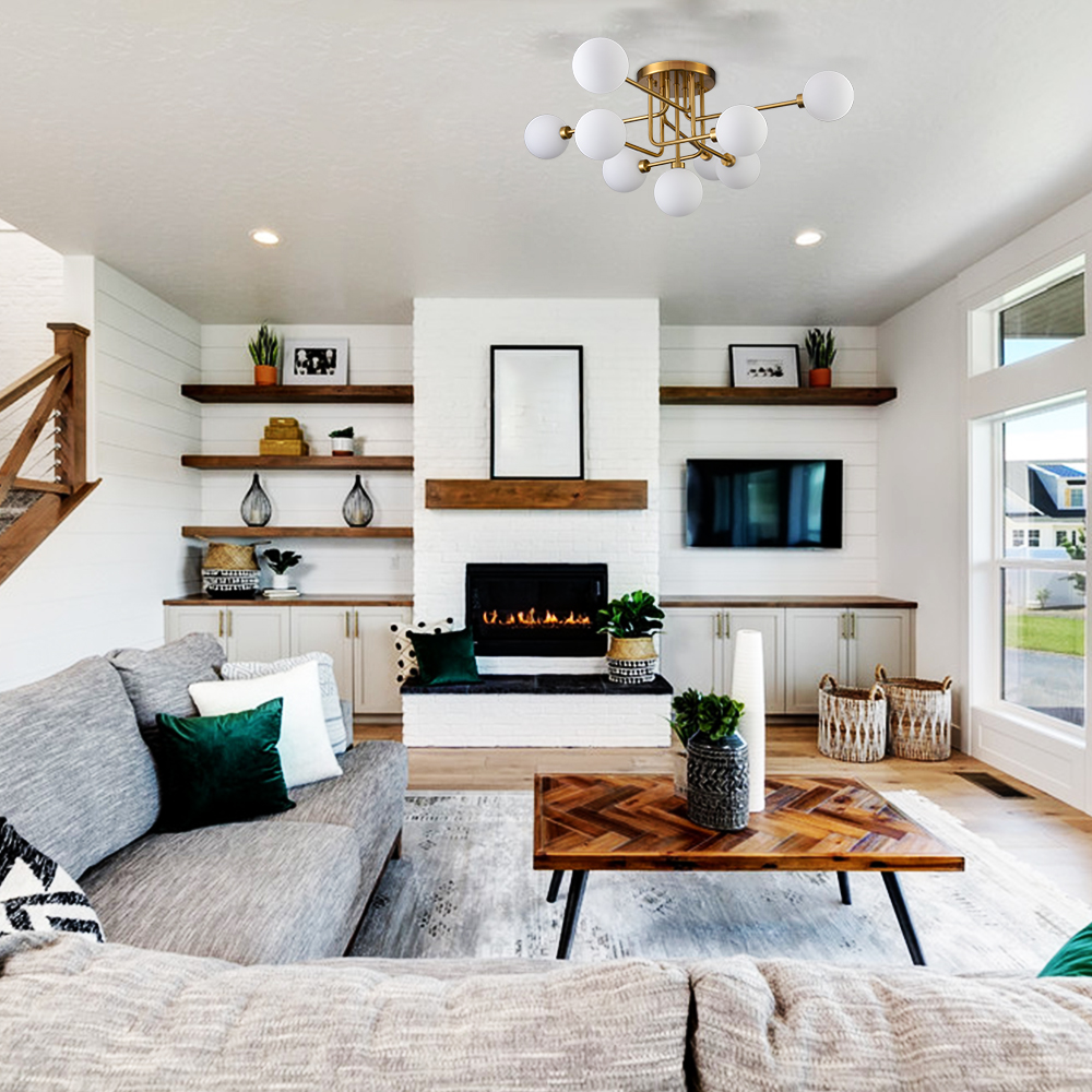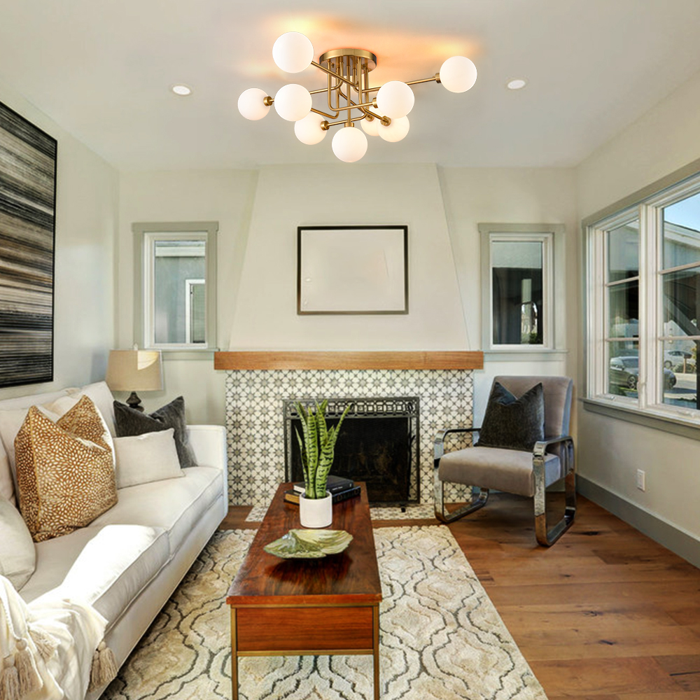 The gold flush mount ceiling chandelier flaunts an electrophoretic gold finish, bringing a dash of metallic glitz to your living space. Crafted from impurity-free hand-blown opaque opal glass, it provides the perfect blend of mid-century classic and contemporary elements. The glass shades are supported by gracefully curved arms that intersect and extend outward in every direction. Its opal glass shades contrast and compete with the gold finish, adding a ton of eye appeal and enhancing the piece's visual interest and beauty even further.