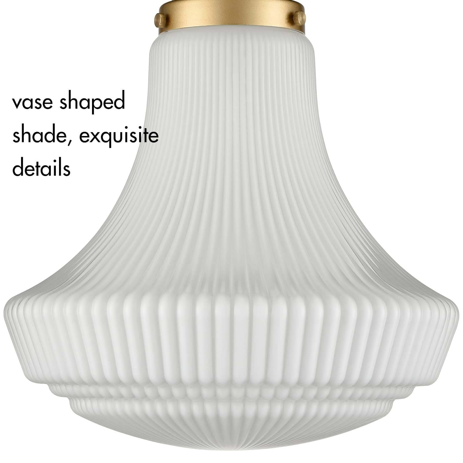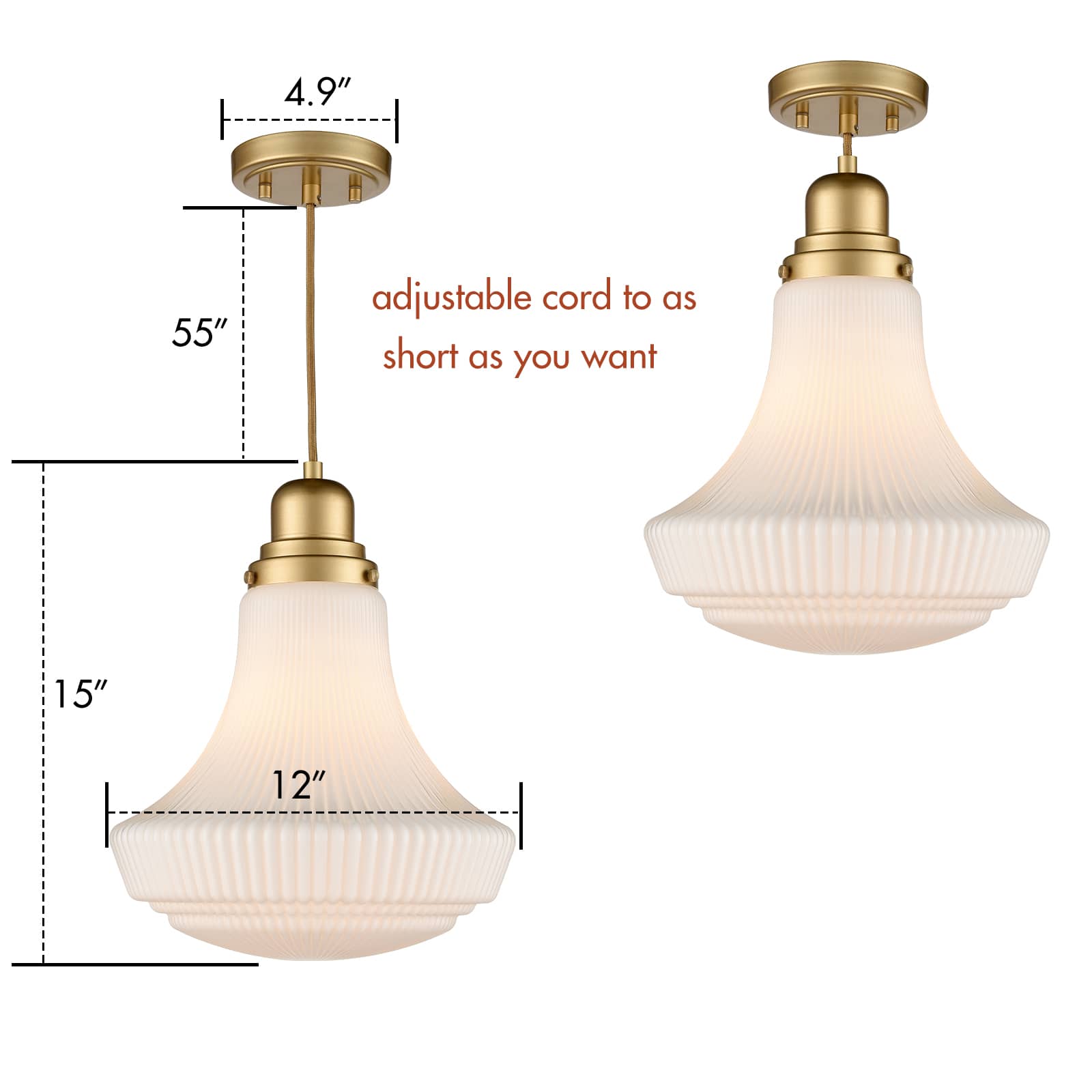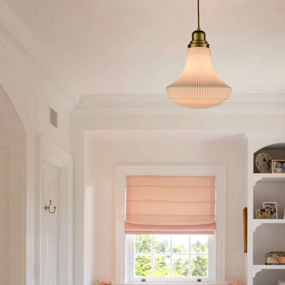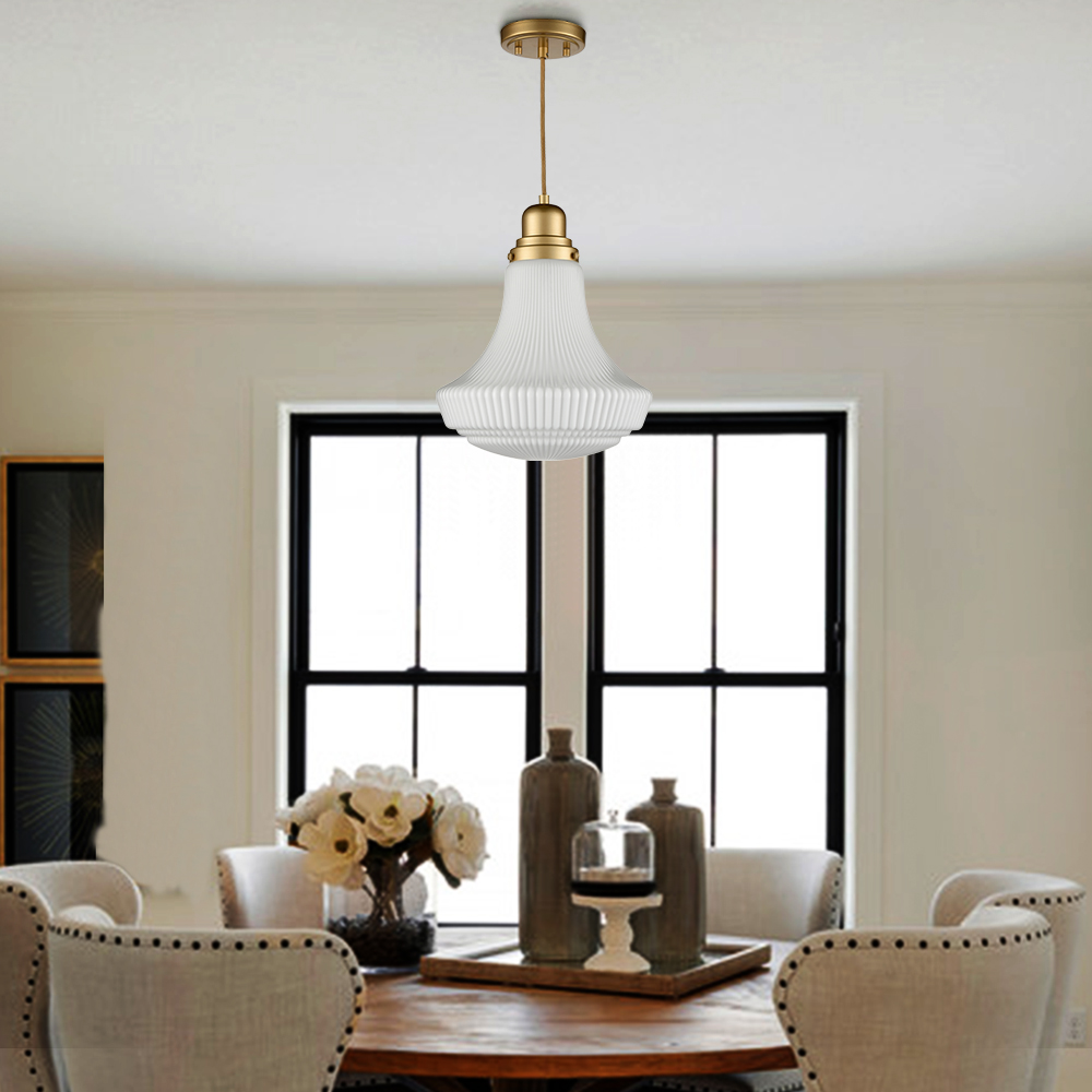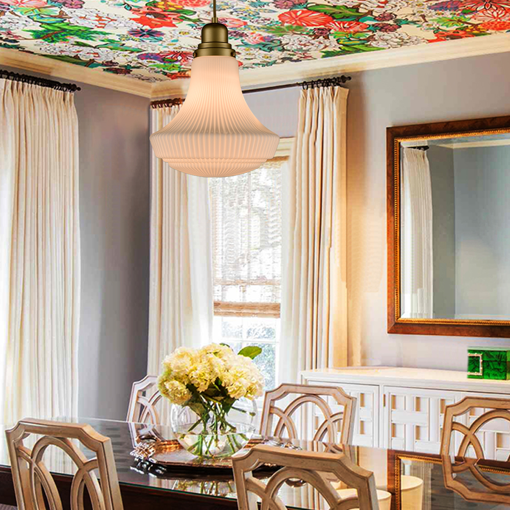 Boasting a rustproof gold finish, the modern gold pendant light effortlessly lends a nice pop of shimmer to your living space. Crafted from impurity-free hand-blown opaque milk glass, its glass shade shows off textural, ridged details and an opulent vase silhouette. It provides the perfect blend of mid-century classic and contemporary elements and completes the aesthetic with an elegant touch. Its gold finish offers a stark contrast to the glass shade, adding charisma and drama to the space. It comes with a 55-inch adjustable gold fabric cord.