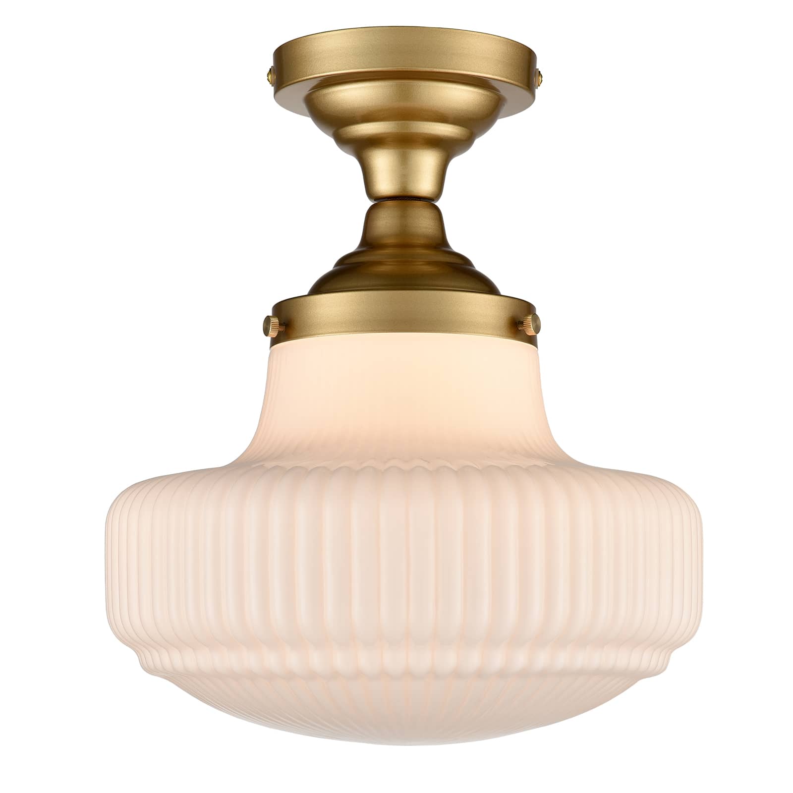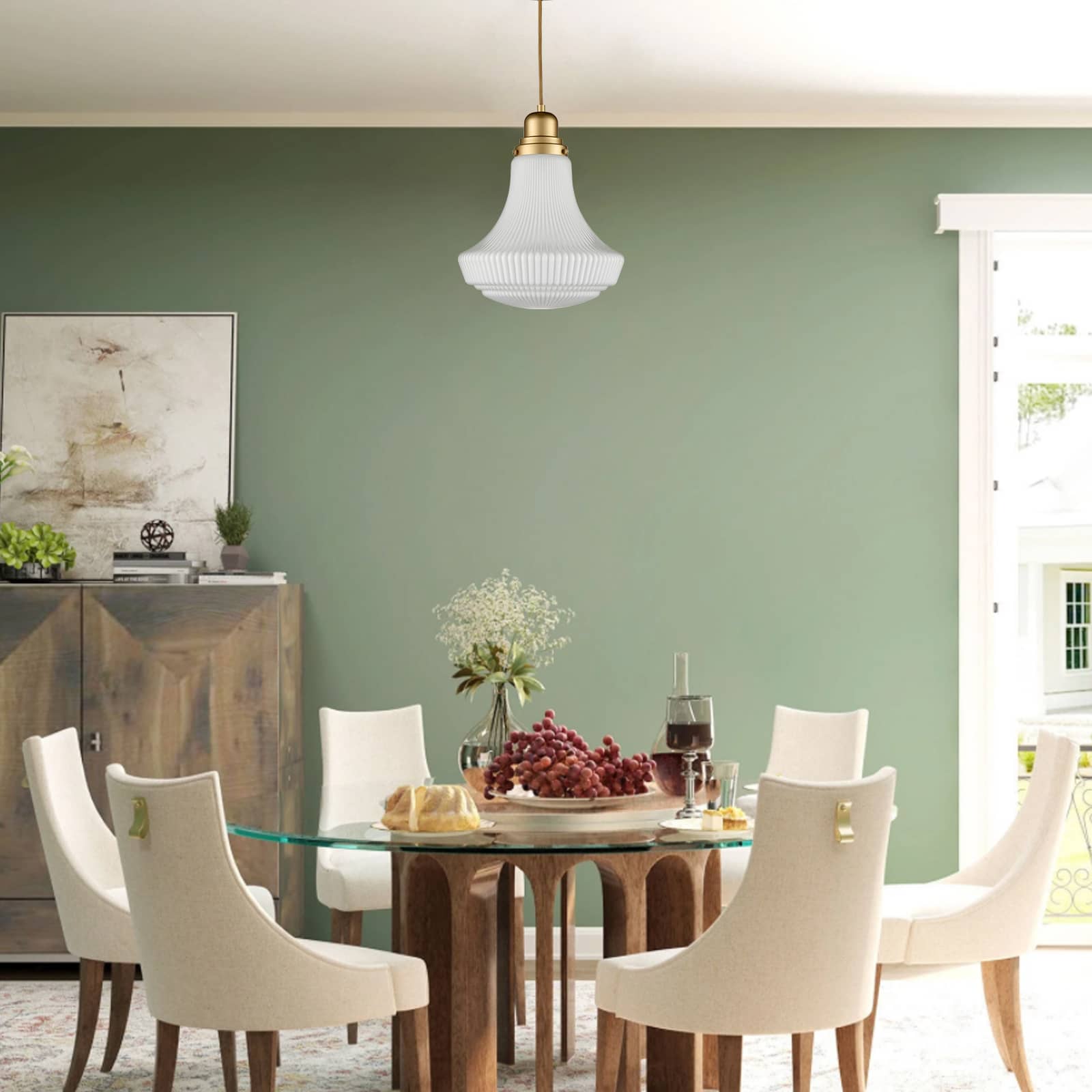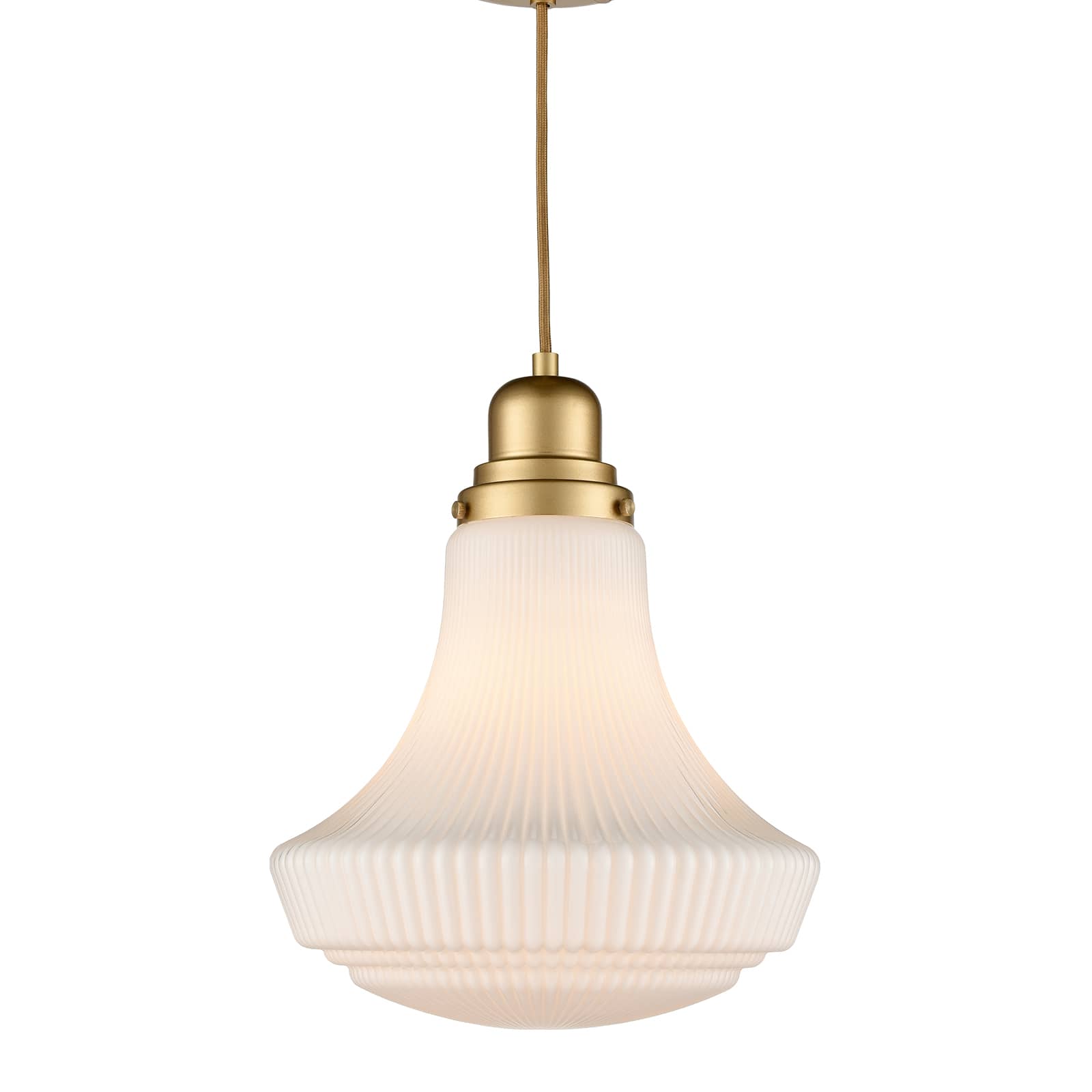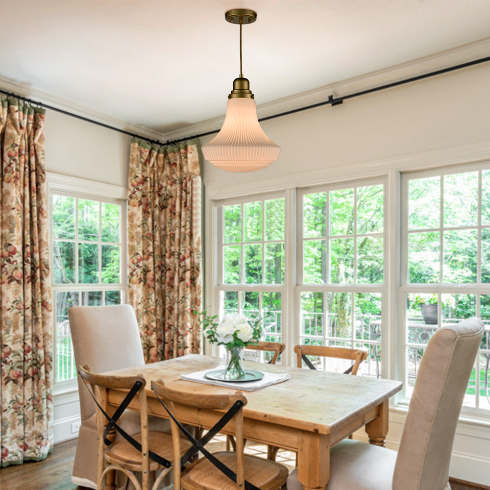 Boasting a rustproof gold finish, the modern gold pendant light effortlessly lends a nice pop of shimmer to your living space. Crafted from impurity-free hand-blown opaque milk glass, its glass shade shows off textural, ridged details and an opulent vase silhouette. It provides the perfect blend of mid-century classic and contemporary elements and completes the aesthetic with an elegant touch. Its gold finish offers a stark contrast to the glass shade, adding charisma and drama to the space. It comes with a 55-inch adjustable gold fabric cord.