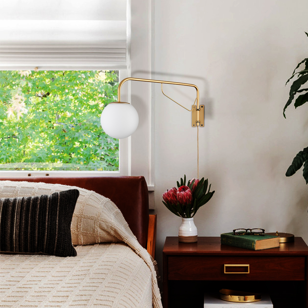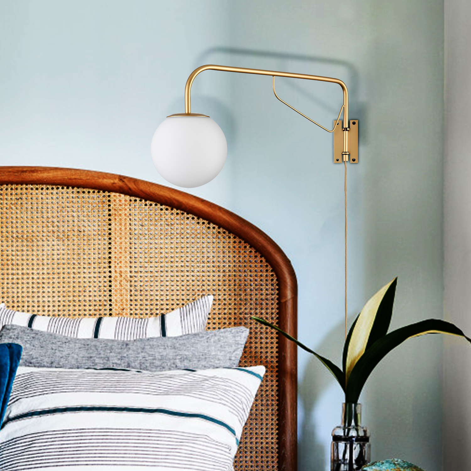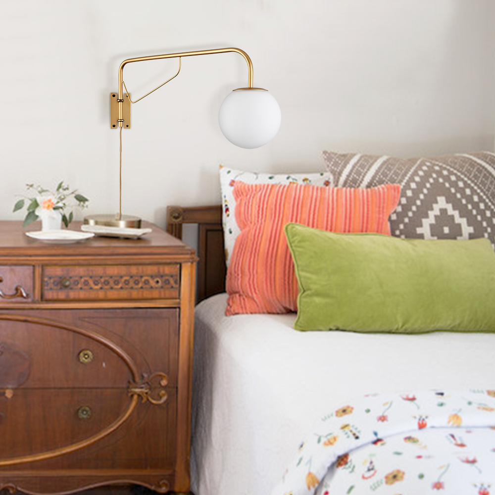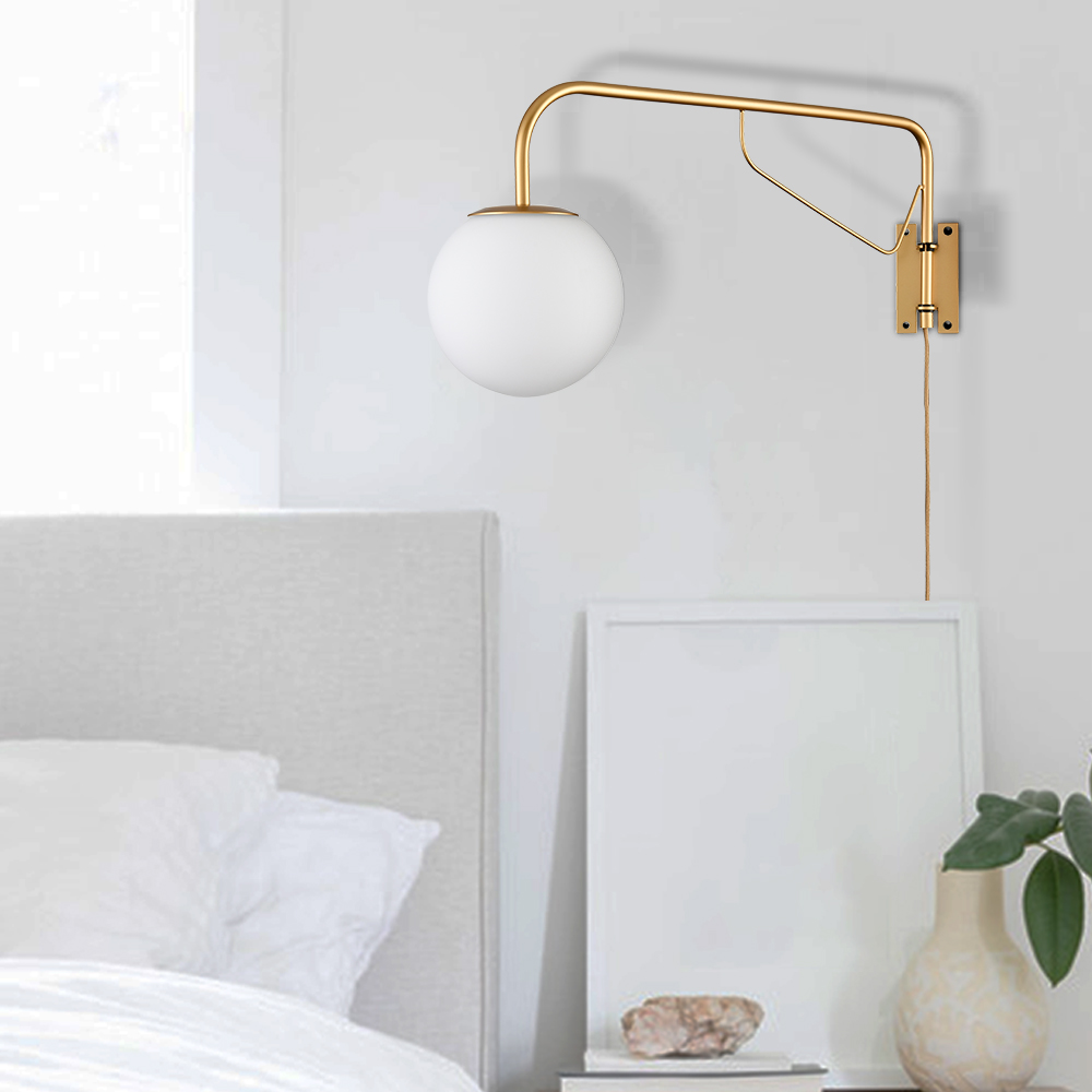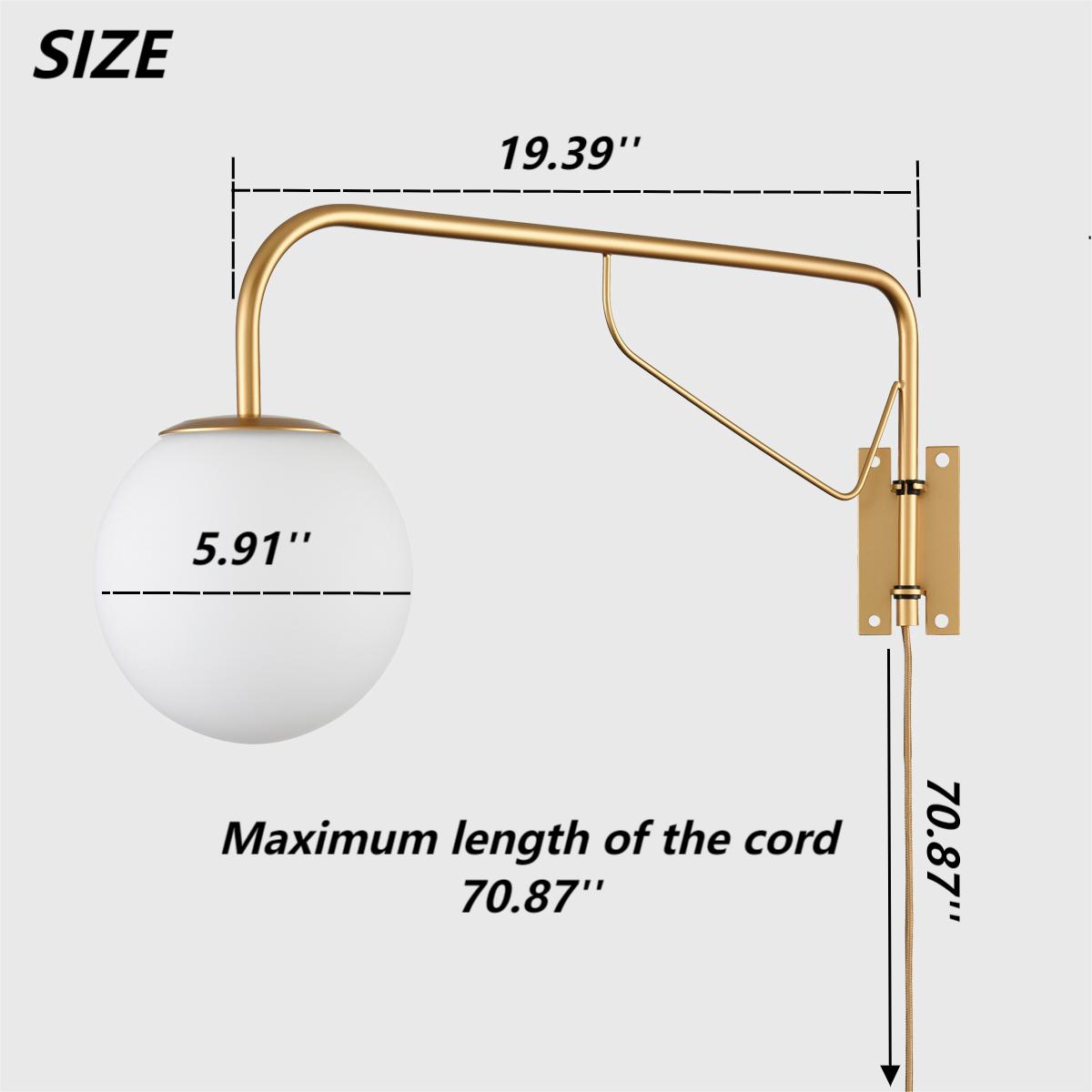 The swing arm wall lamp is accented with a shimmery brass finish, brightening up your interior with a boost of sparkle. It diffuses awesome light rays from the opaque milk glass shade to make the bedroom dainty, romantic, and dreamy. The glass shade offers a sleek sphere silhouette and boasts the beauty of geometry. The gold finish contrasts the milk glass shade and adds alluring visual interest to the living area. Its swing arm can swivel 180 degrees horizontally. It comes with an on/off switch without a dimming function and a 70.87-inch plug-in cord.
