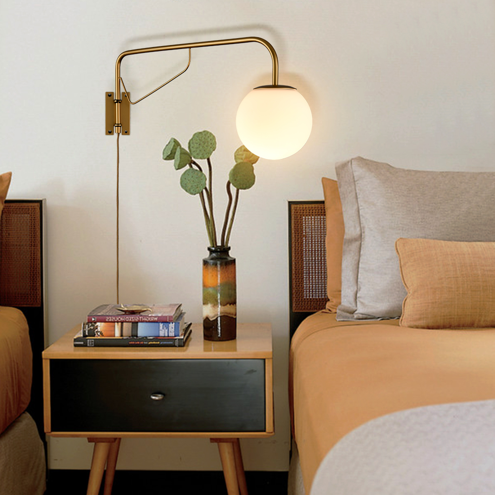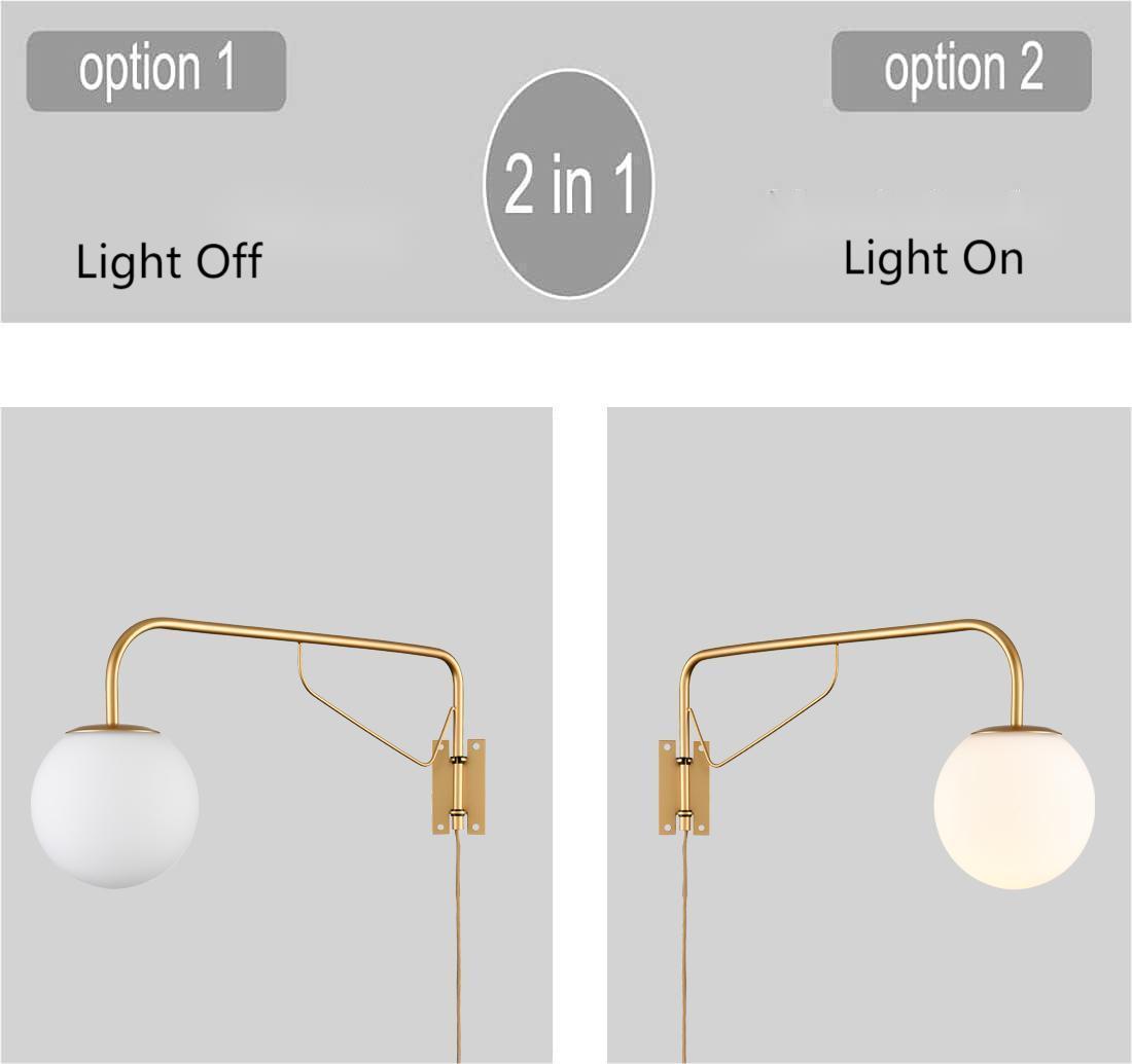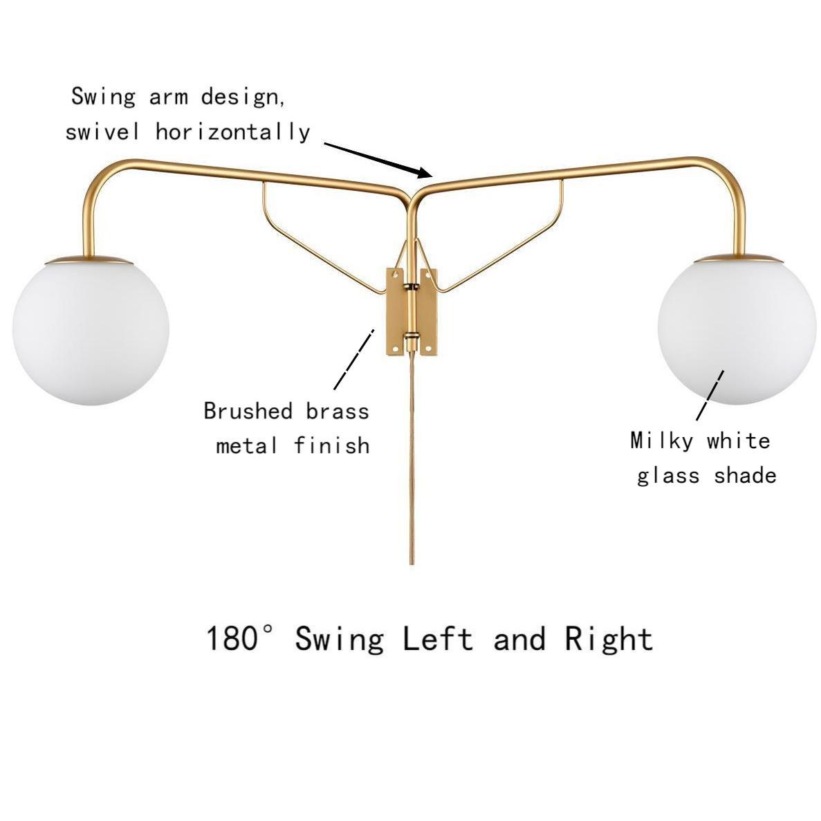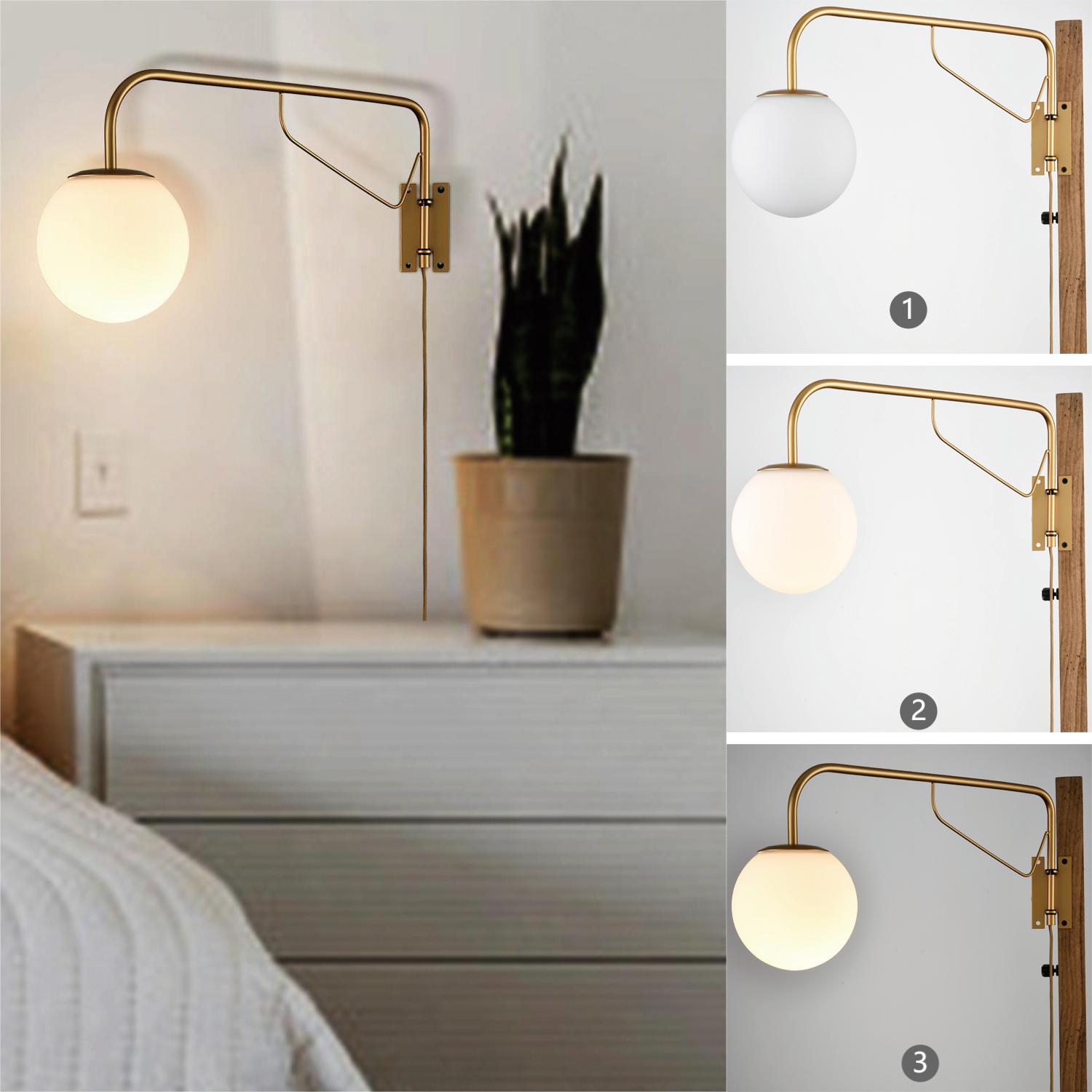 The swing arm wall lamp is accented with a shimmery brass finish, brightening up your interior with a boost of sparkle. It diffuses awesome light rays from the opaque milk glass shade to make the bedroom dainty, romantic, and dreamy. The glass shade offers a sleek sphere silhouette and boasts the beauty of geometry. The gold finish contrasts the milk glass shade and adds alluring visual interest to the living area. Its swing arm can swivel 180 degrees horizontally. It comes with an on/off switch without a dimming function and a 70.87-inch plug-in cord.