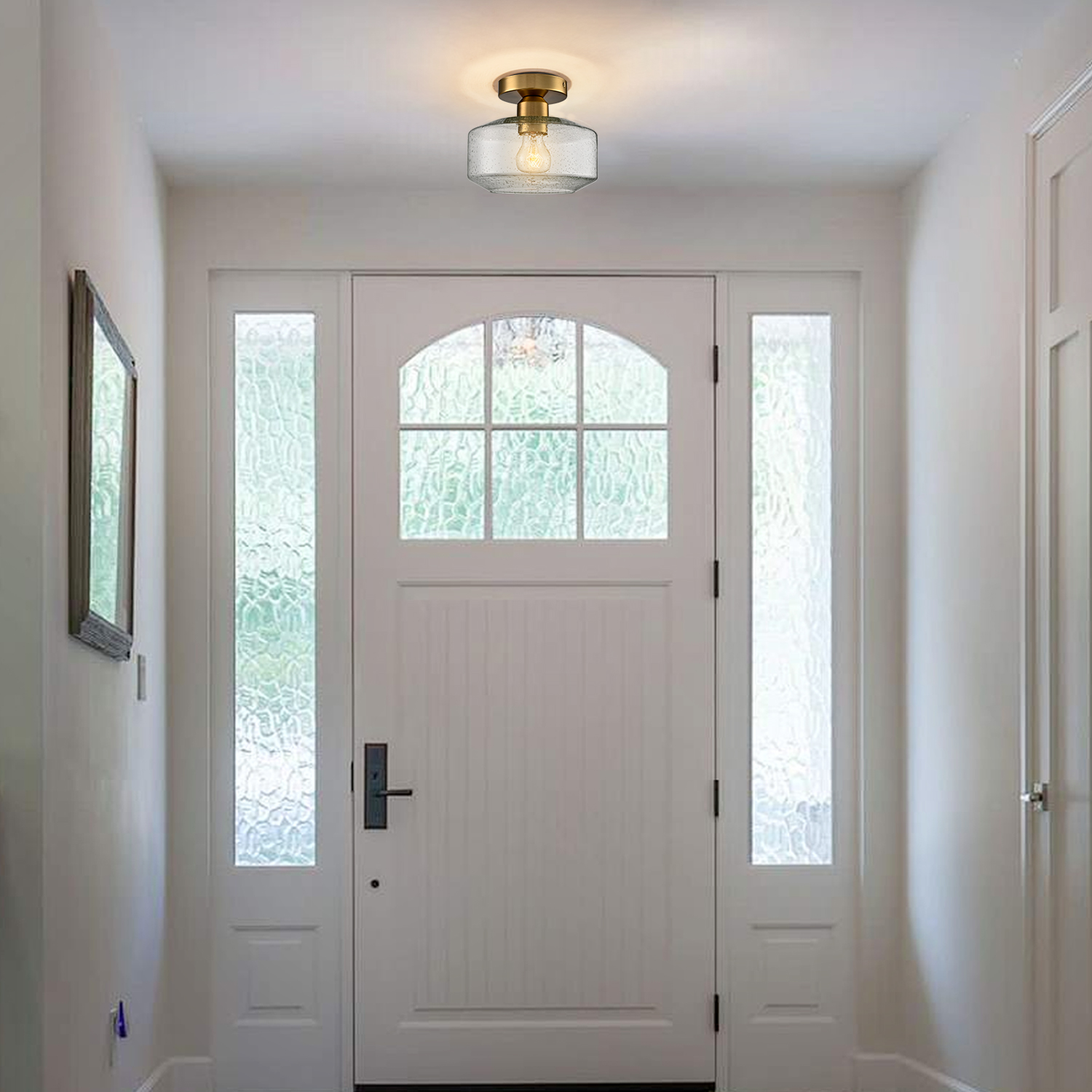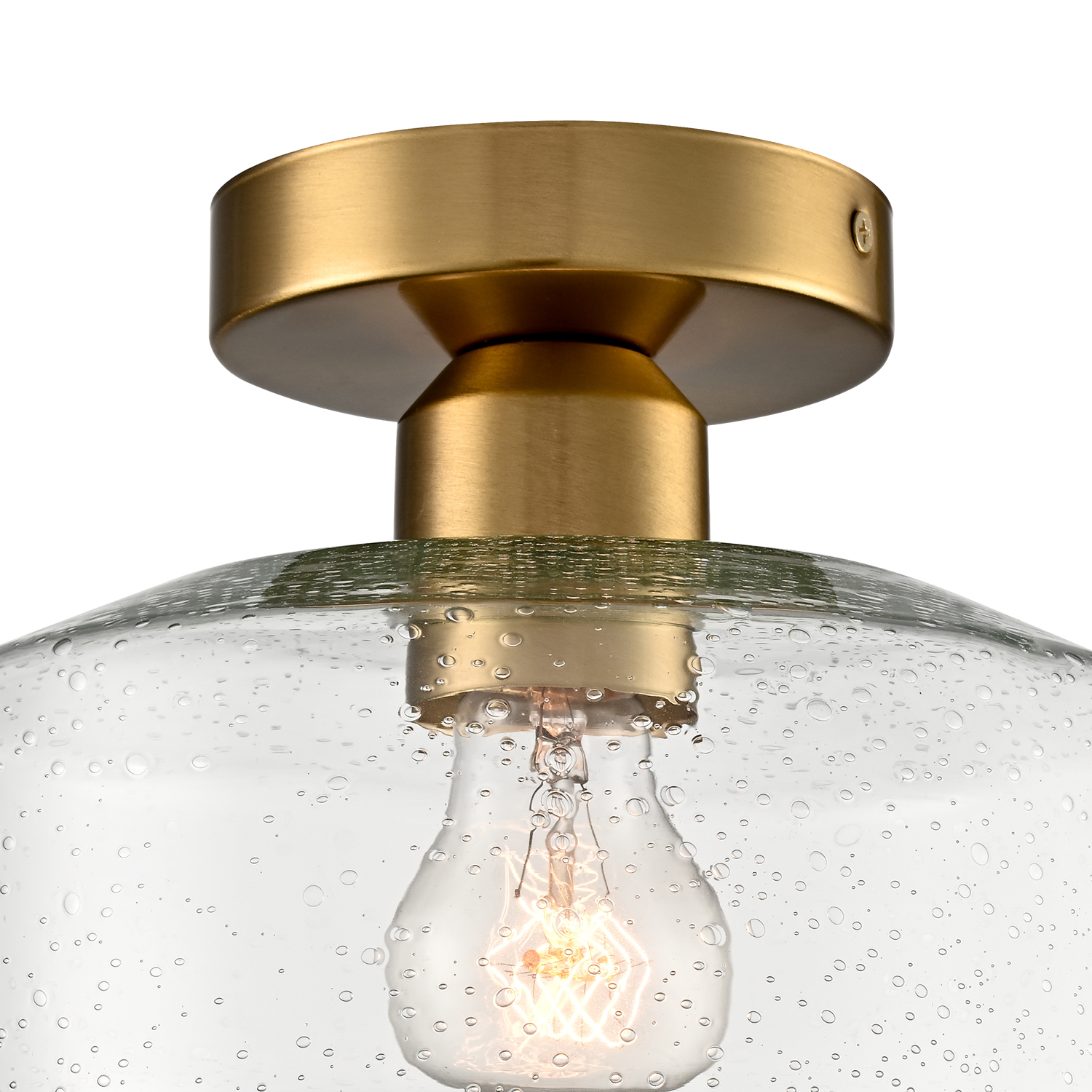 The semi flush mount ceiling light’s canopy and lamp holder show off a shimmery electrophoretic brass finish, pepping up your space with metallic pizzazz. Crafted of impurity-free hand-blown seeded glass, it is made translucent with seeded glass, giving a subtly mysterious and dreamy vibe to the space. Its seeded glass drum shade contrasts with the brass finish and adds alluring visual interest to the living area. It draws the eye upward to a beautiful display of glass and metal suspended above.