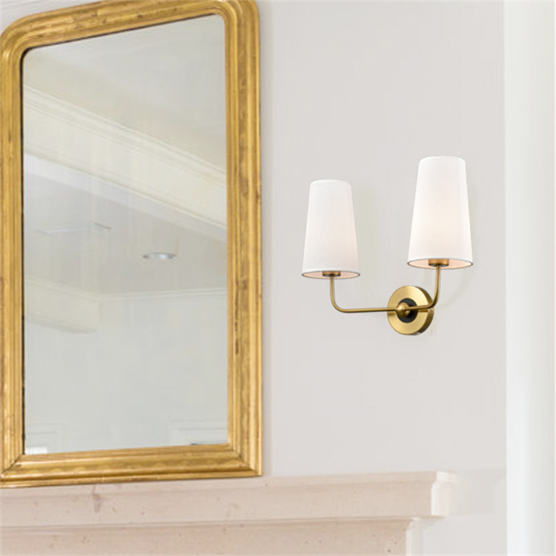 The gold wall sconce's outer ring and central globe of the canopy, lamp holders, and arm are accented with a rustproof electrophoretic brass finish, highlighting your interior with a bit of bling. The inner small ring of the canopy showcases a black finish for a refined touch. Its elongated white linen cone shades cast an enchanting aura of elegance and make for a tasteful statement in your home. The light pouring through the fabric lampshades is gently muted and fills the room without any glare. Add this appealing piece to your bedroom, hallway, kids room, kitchen, living room, and stairwell.
