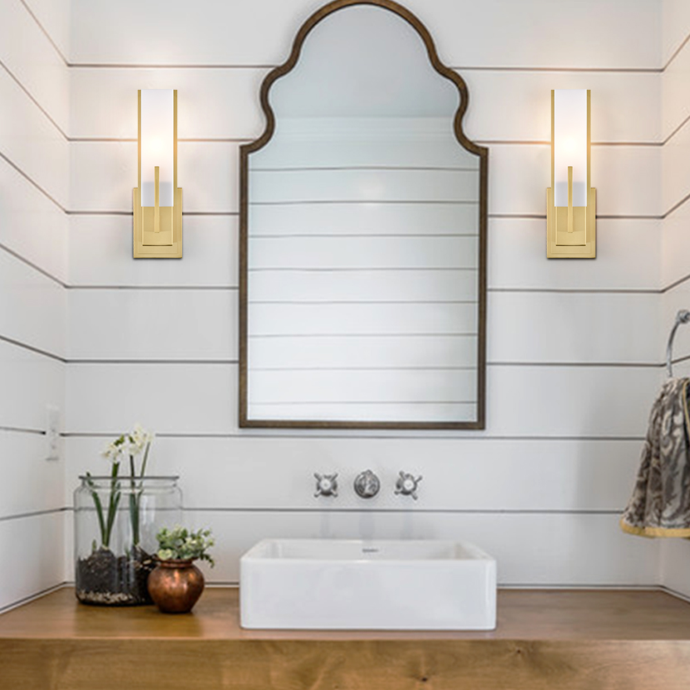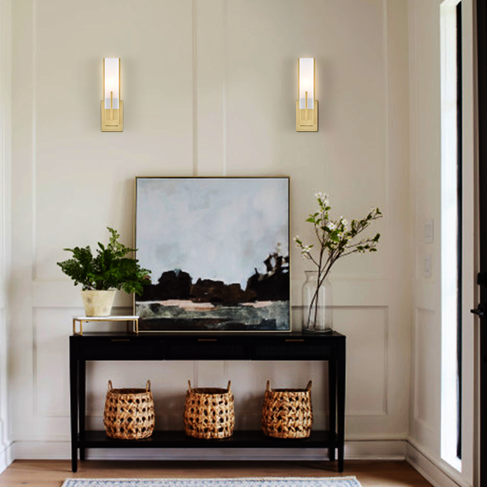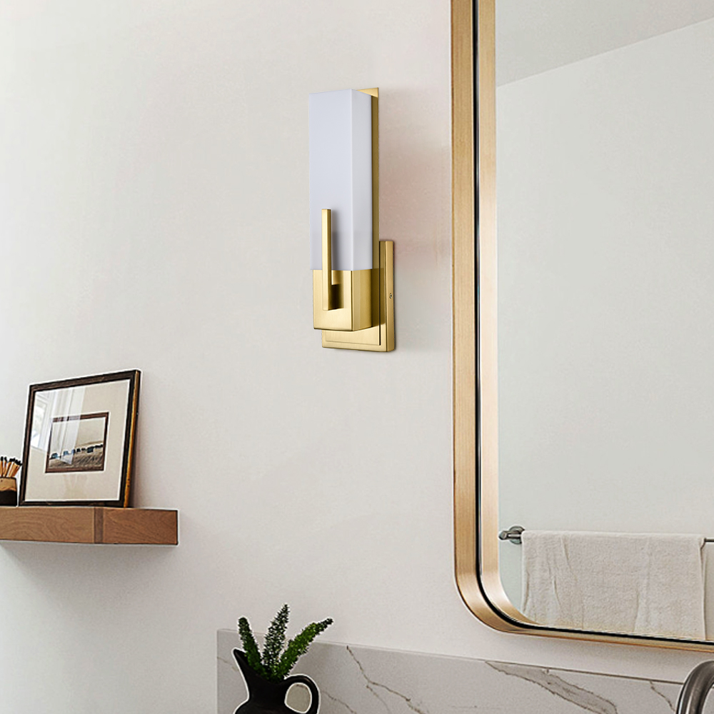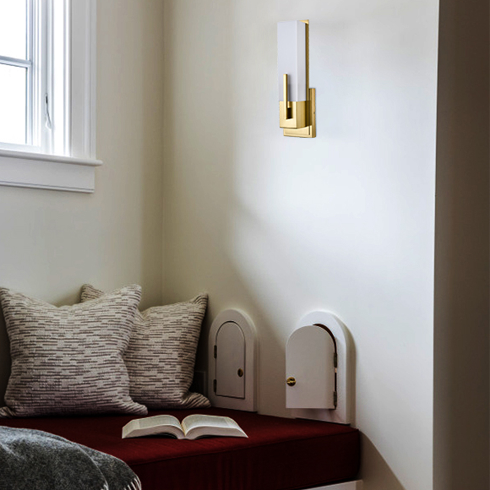Boasting an electrophoretic gold finish, the modern gold wall sconce livens up your space with a dash of metallic shimmer. A rectangular acrylic shade is designed to house an exposed bulb and lends a touch of geometry to the interior. The rectangular acrylic shade is held aloft by the streamlined metal bar extending to the front of the shade. Its shimmery gold finish and the acrylic shade make for a perfect contrast in the space.