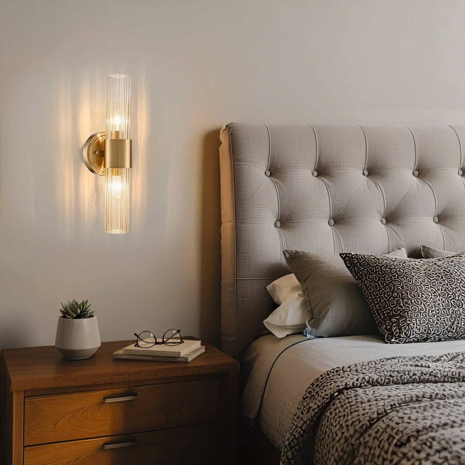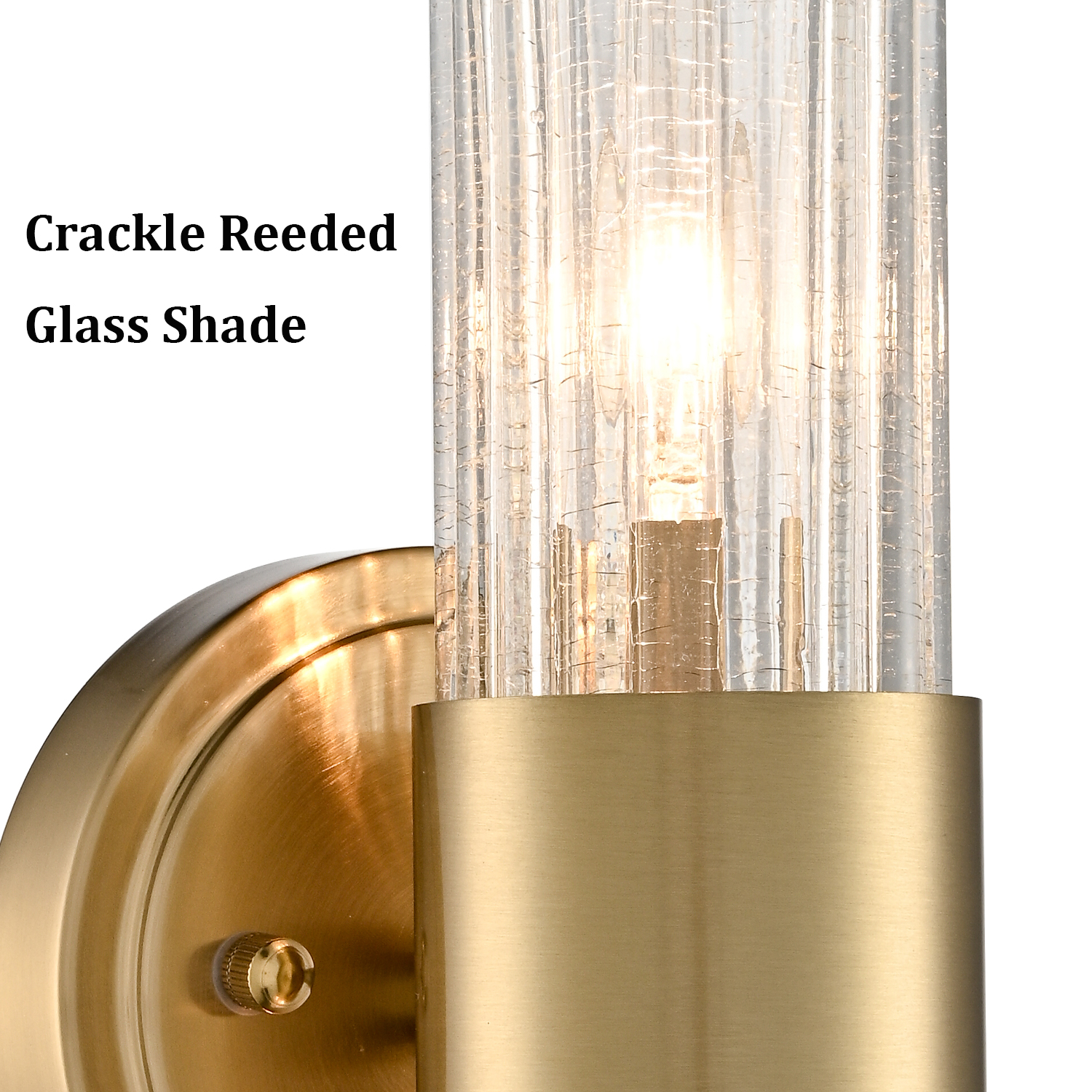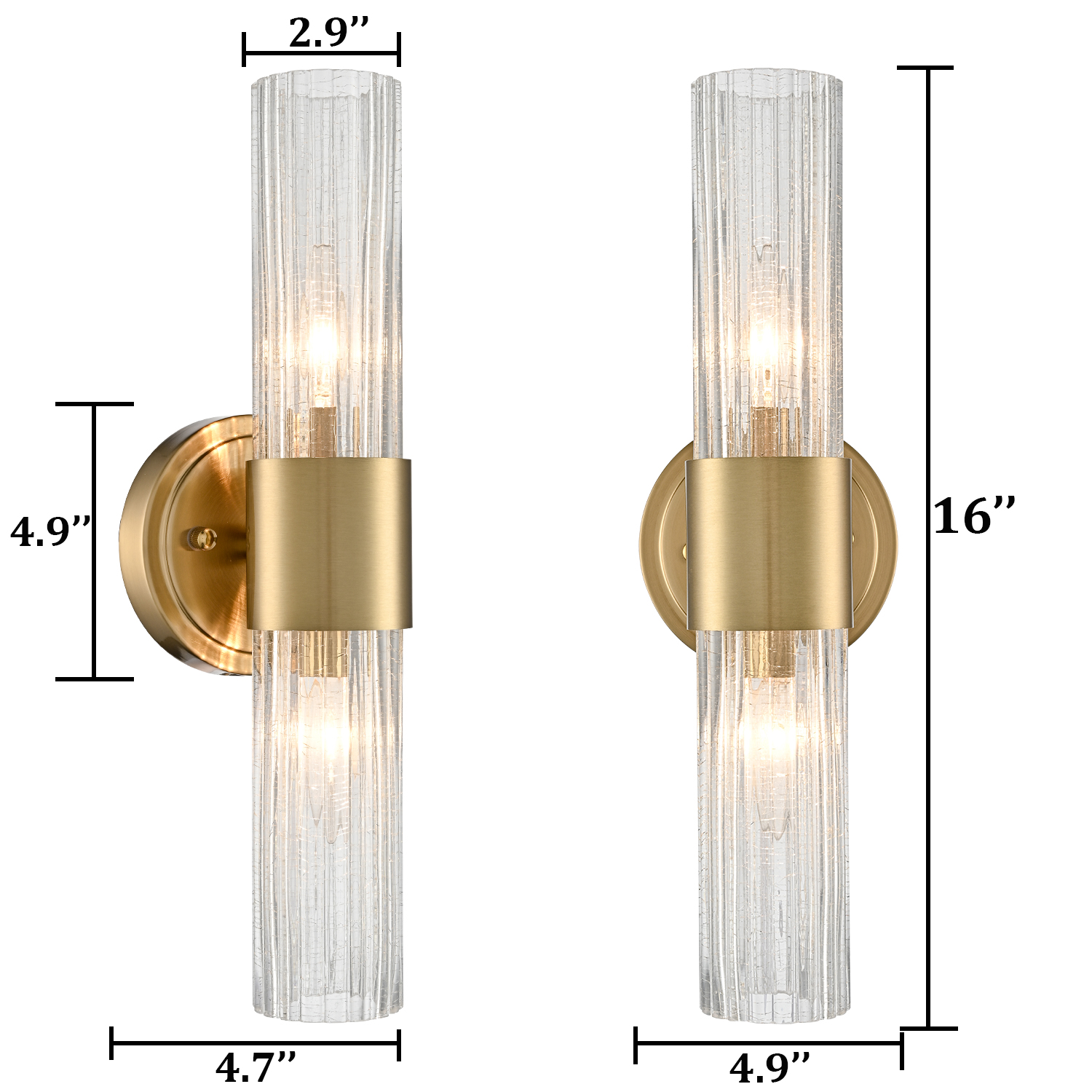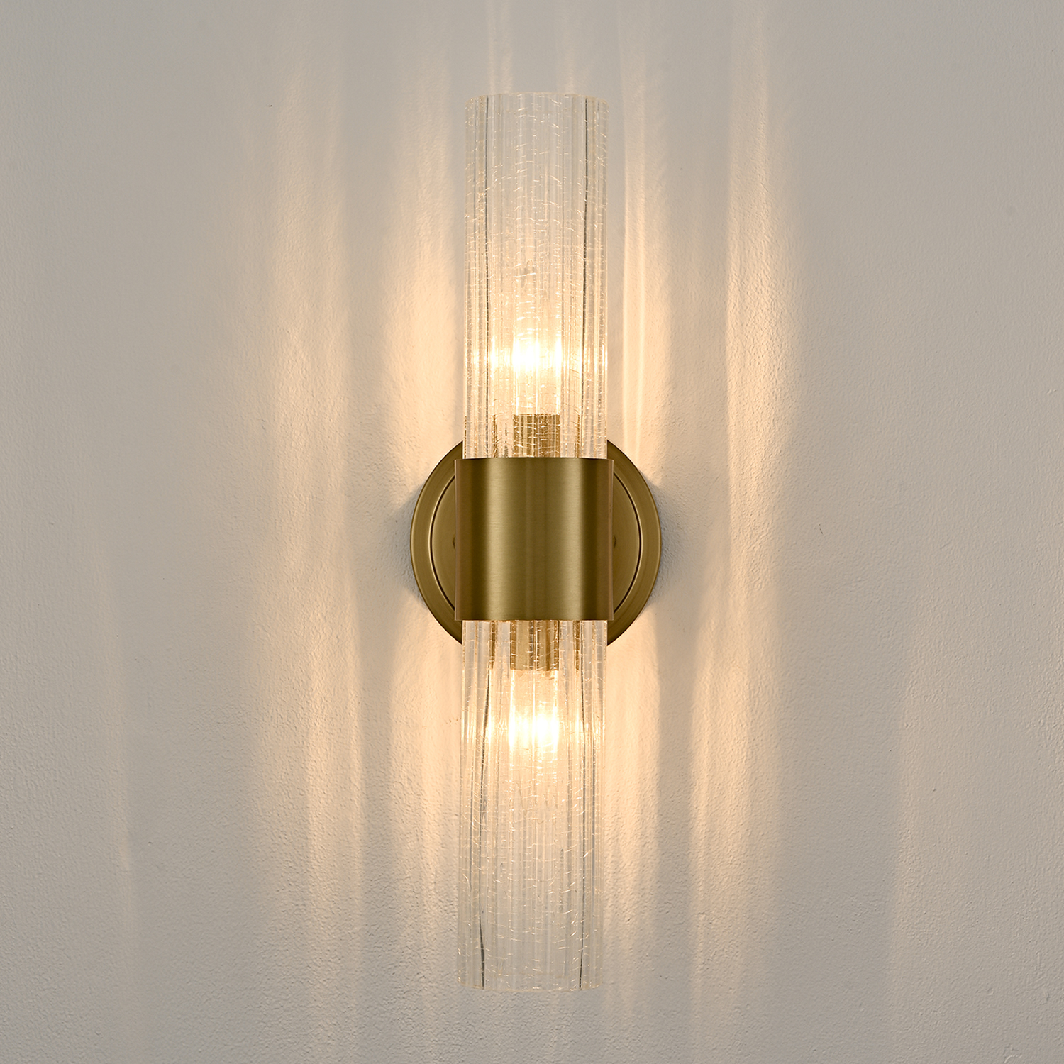 The modern gold wall sconce light sports a glossy gold finish, invigorating your interior with a boost of brightness. It is characterized by a cylinder glass shade crafted from impurity-free crackle glass with excellent light transmittance. Its fluted crackle cylinder glass shade is designed to house two exposed bulbs to complete the aesthetic. A charming glow shines through the fluted glass shade, creating intriguing light effects and shades. Its cylinder glass shade contrasts with the gold finish and adds alluring eye appeal and a large dose of texture to your interior. It can be mounted horizontally and vertically.