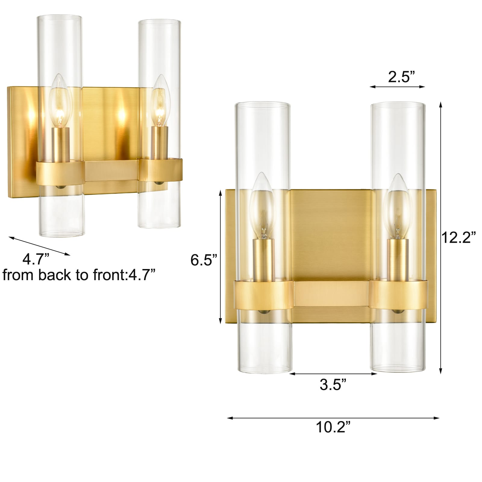 ETL listed for dry locations. A hardwired connection is applicable to the gold wall sconces. Dimension: cylinder shades:2.5 inches wide * 12.2 inches high; the distance it extends from the wall: 4.7 inches; backplate: 6.5 inches high * 10.2 inches wide; spacing between two shades: 3.5 inches. Claxy offers a two-year warranty against workmanship and material defects.