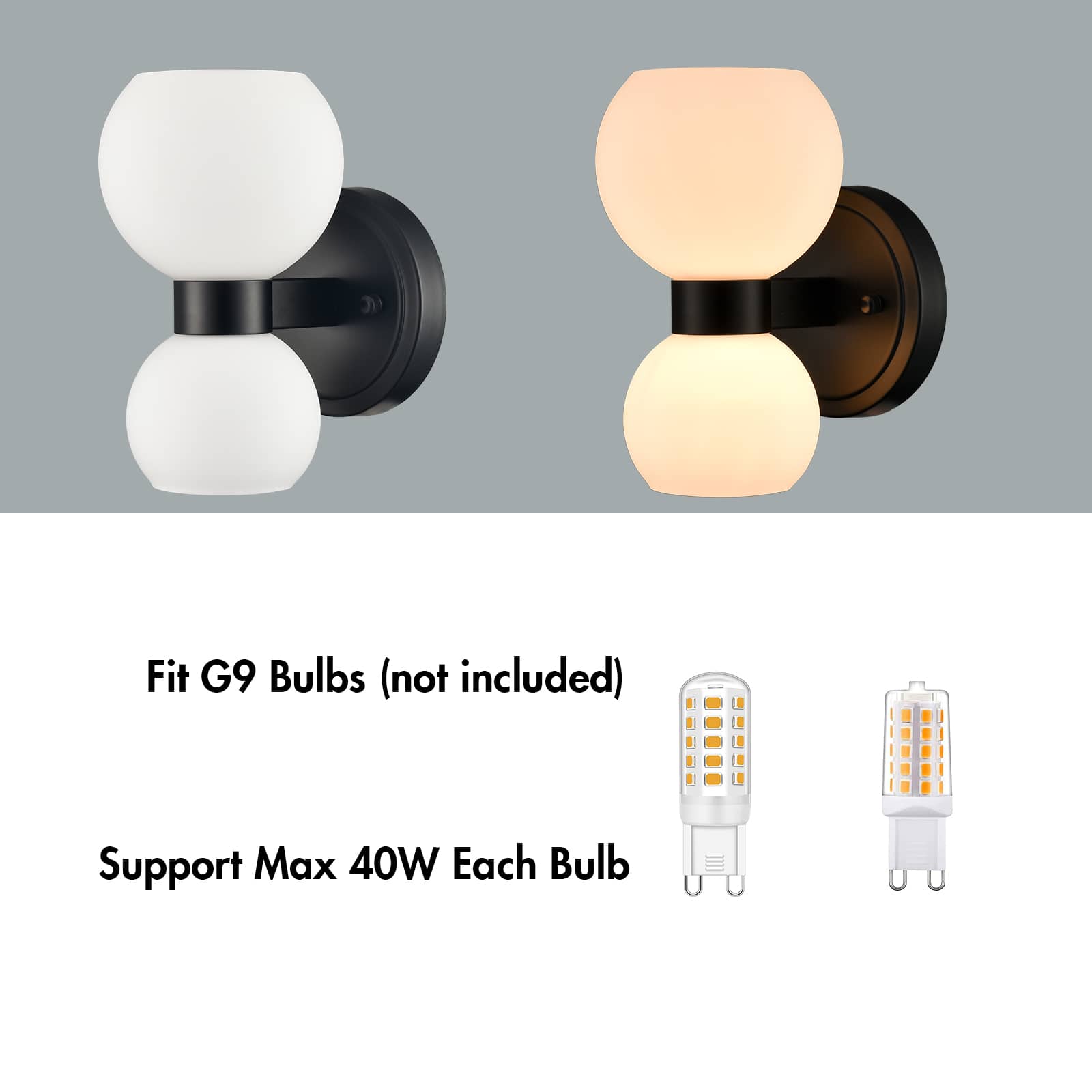 Each wall sconce comes with two G9-base sockets which are compatible with a variety of bulb types: LED, INCANDESCENT, CFL.
