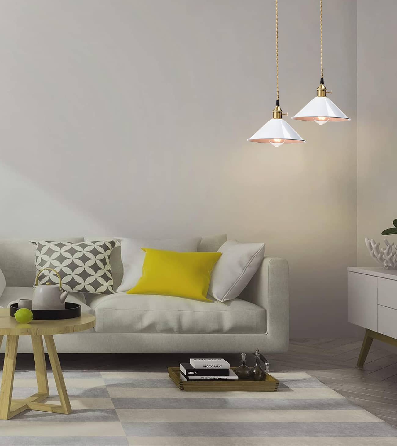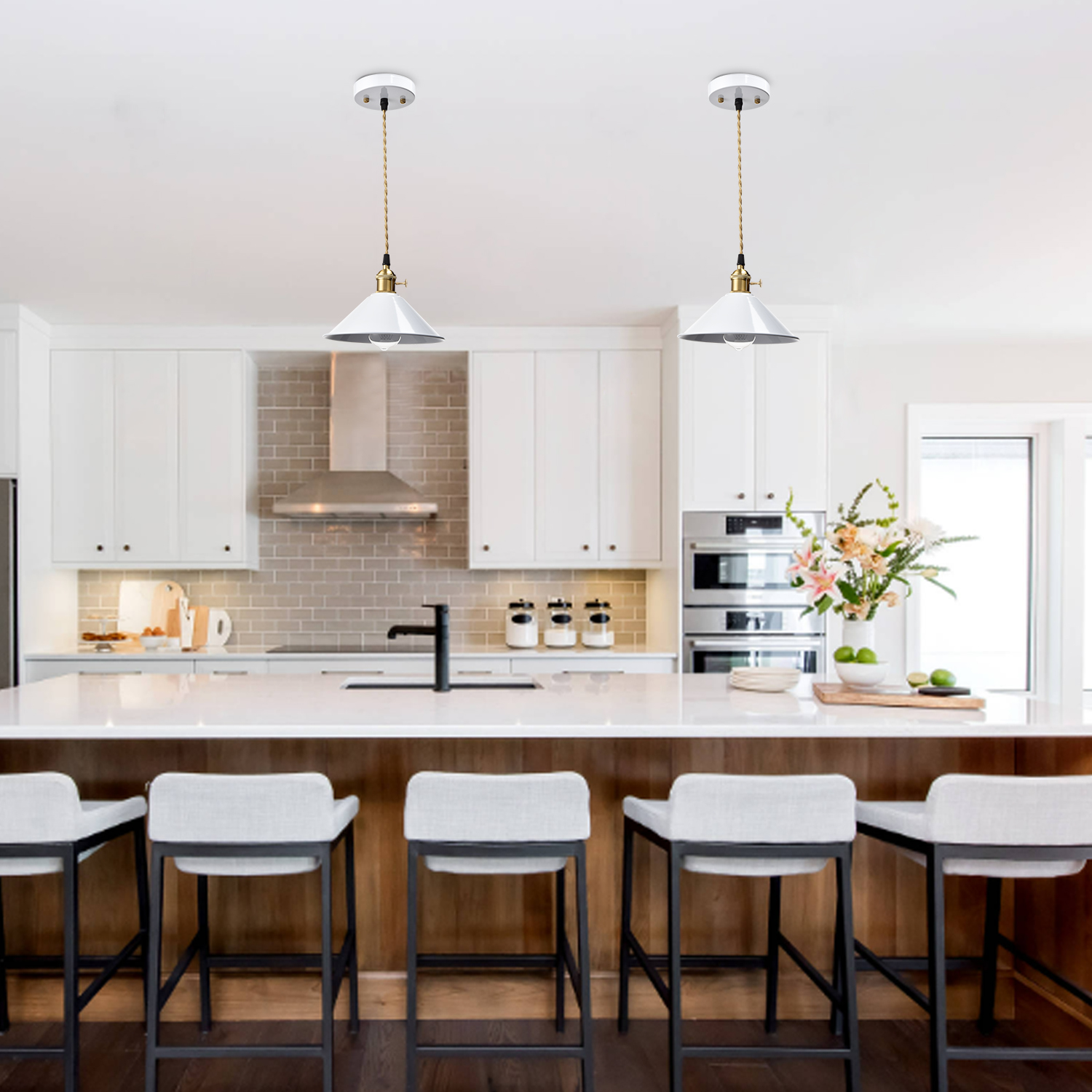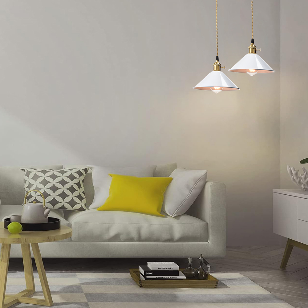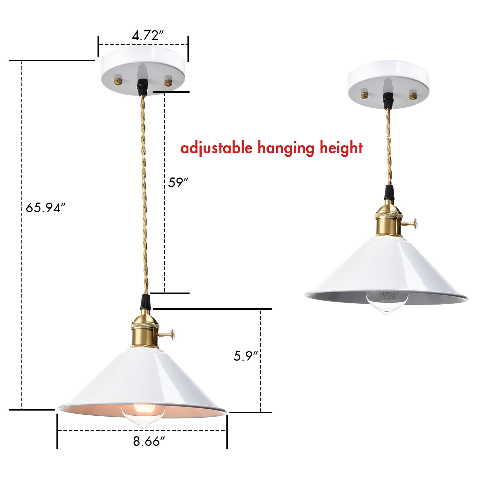 The modern industrial mini pendant light’s cone shade and canopy show off a white finish while its lamp holder, rotary switch, and hanging cord flaunt a gold finish. The white interior of the cone shade helps reflect the light. A mix of finishes encompasses both a dash of drama and a touch of shimmer, yet maintains a modern edge. Its white finish gives your home a snappy look and a glamorous, refreshing vibe. Its shiny gold finish offers a stark contrast to the white finish and adds alluring eye appeal to the space. Feel free to turn on/off the pendant light with the rotary switch on the lamp holder. It comes with a 59-inch adjustable cord to suit your different lighting needs.