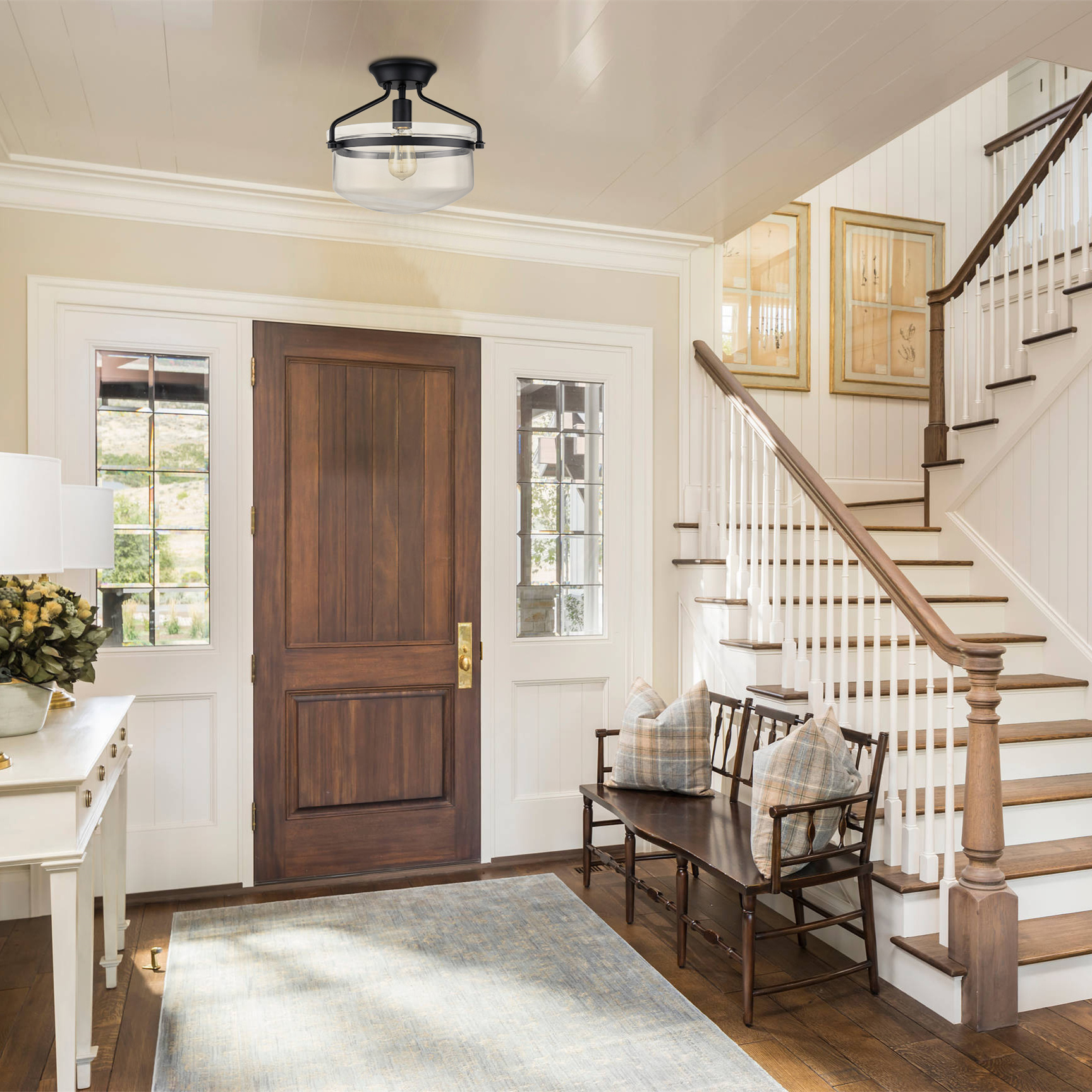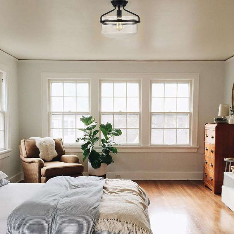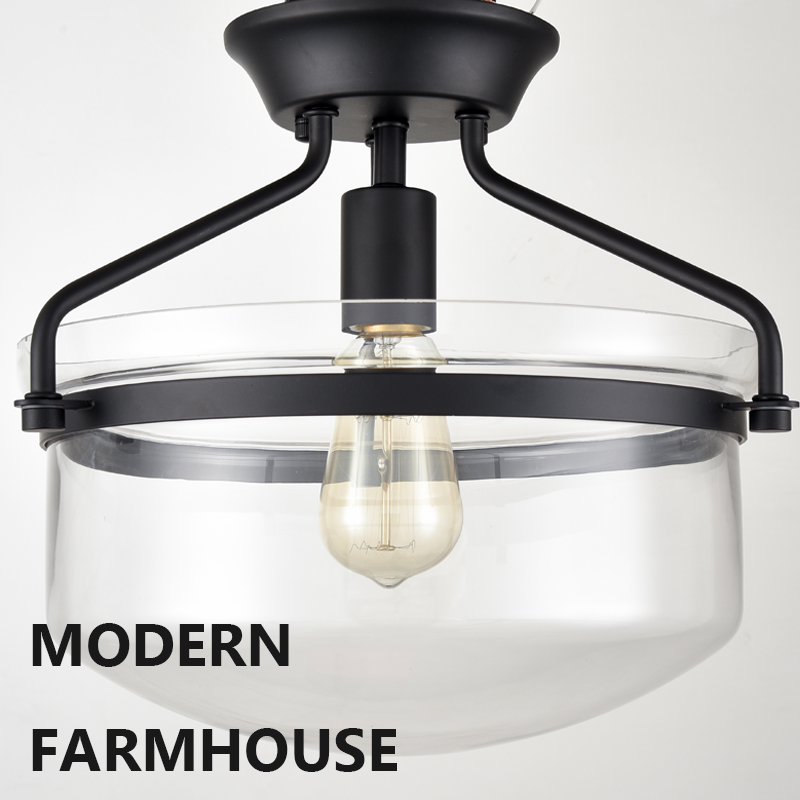 Transparent inverted glass shade design with 3 arms and band to hold the glass, the black semi flush ceiling light is a great choice for modern farmhouse ,urban, and eclectic decor styles