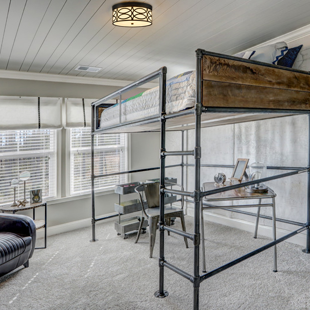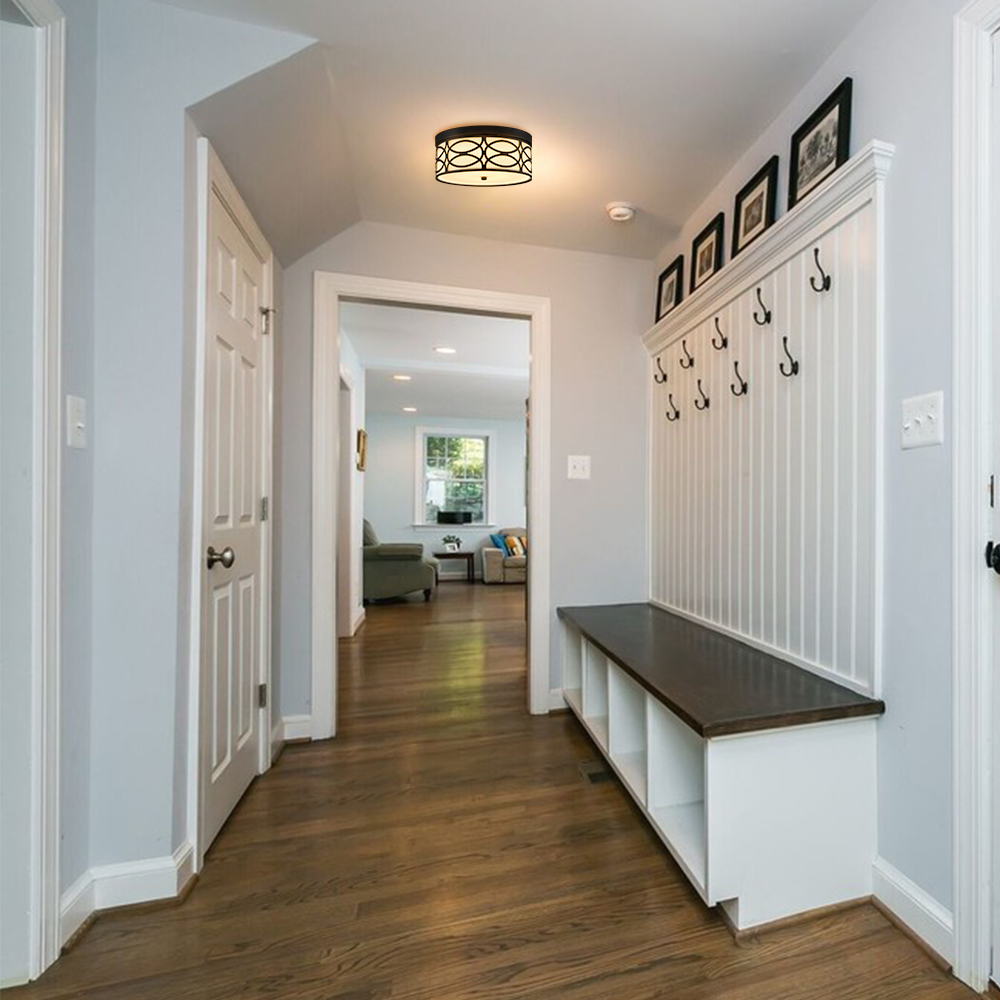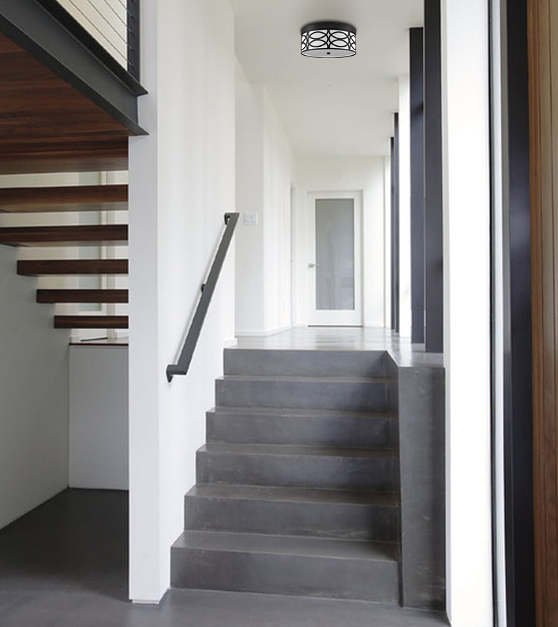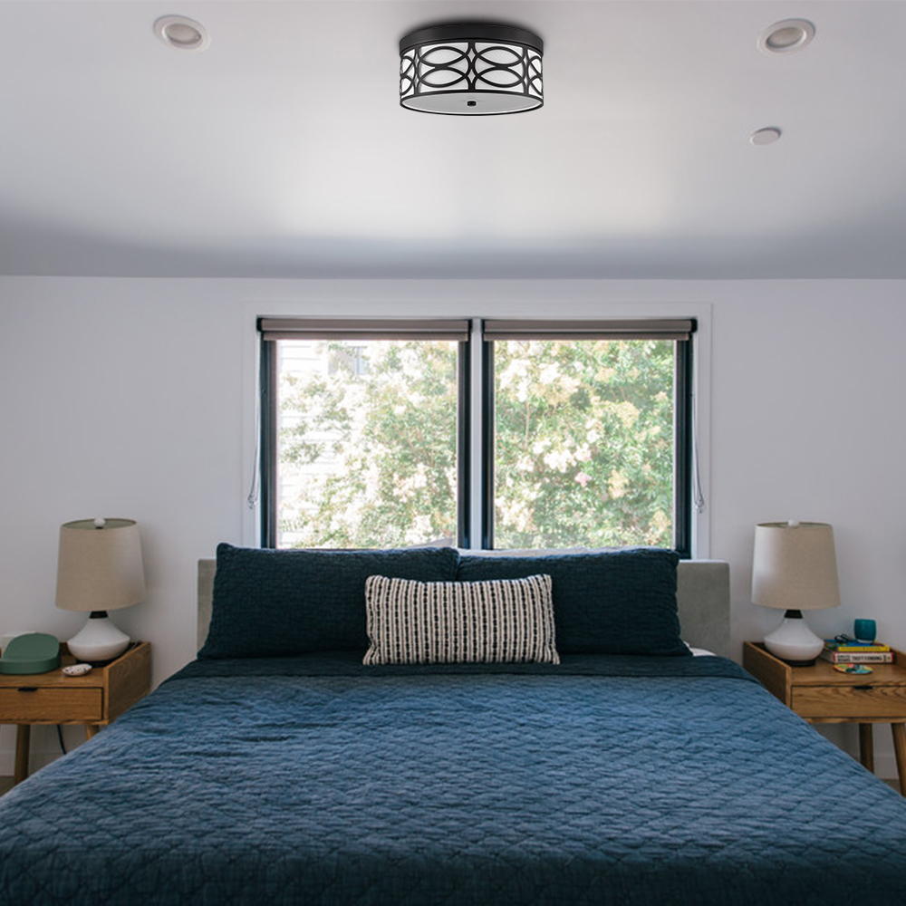 The led flush mount ceiling light's canopy, lamp-holder, bottom accent, and airy cage are coated in a black finish. Its creamy white linen drum shade is protected by an airy metal cage featuring conjoining ovals, creating a look that is sure to be noticed. The light pouring through the fabric lampshade is gently muted and fills the room without any glare. The led flush mount ceiling light is a perfect fixture for your bedroom, dining room, entryway, hallway, living room, patio, and porch. Exuding a lovely glow throughout your space, it creates a cozy atmosphere. ETL listed for dry locations.
