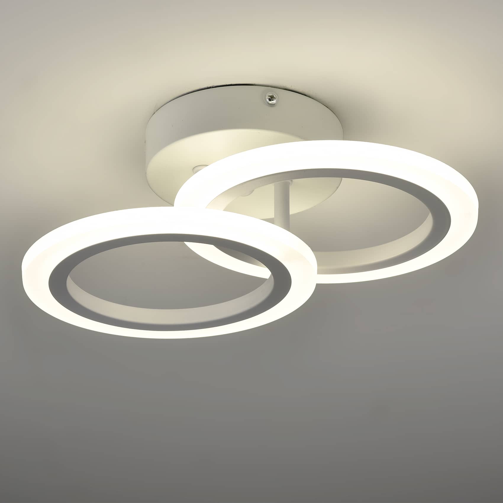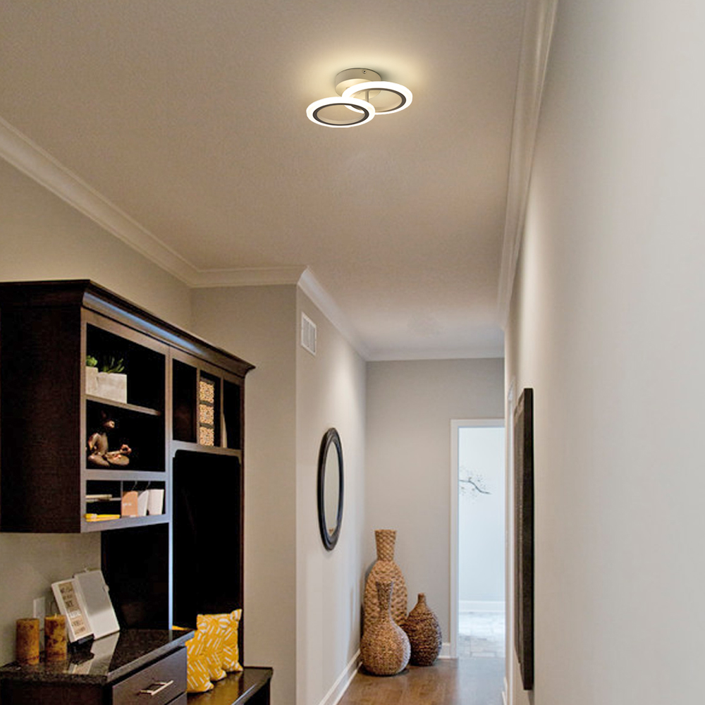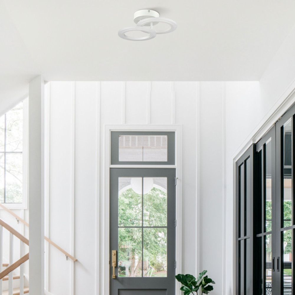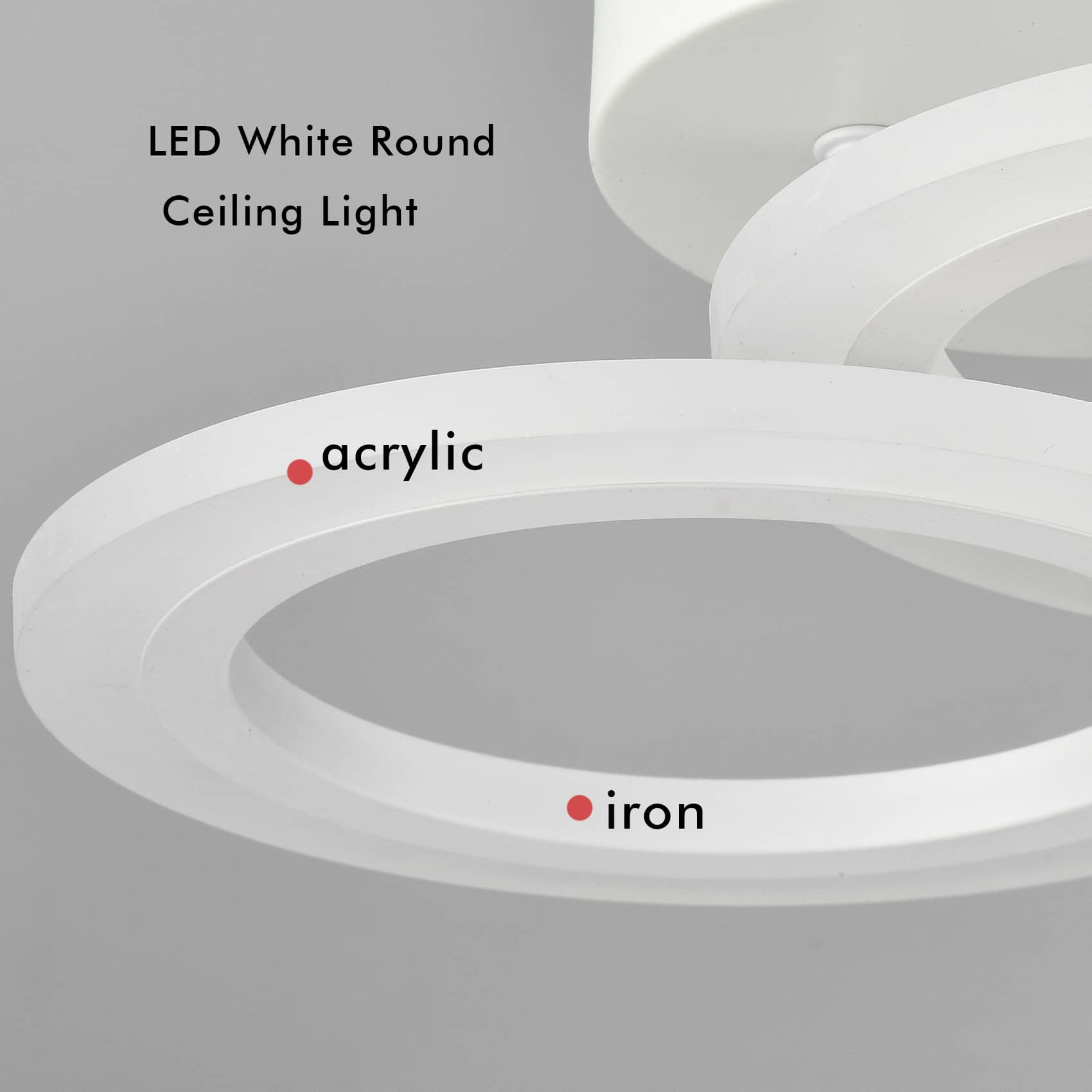 The modern LED ceiling light sports a rustproof white finish, giving your living space a touch of urban sophistication. It flaunts two intersecting rings hanging at different heights, providing a bold decorative detail to the living space. The rings are crafted of metal and acrylic. It doubles up on the rounded shades, creating layers of nuanced light. It boasts elegant geometry and adds a ton of eye appeal to the scene. It has all the style, charisma, and drama required to make everyone stand still to stare and appreciate. Offering attractive eye appeal, it delivers a huge dose of modern touch to your interior. Its intricate design draws the eye upward to a beautiful display of metal and acrylic.