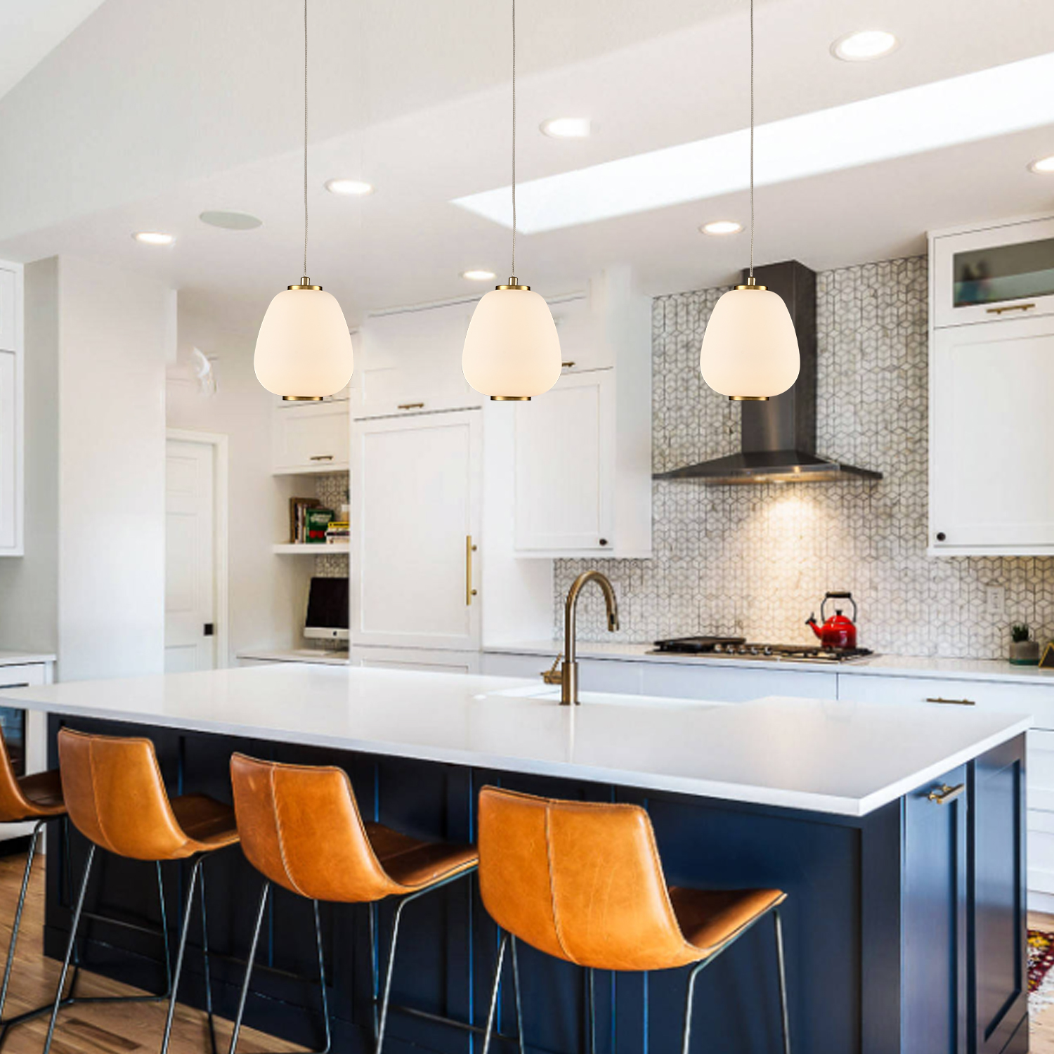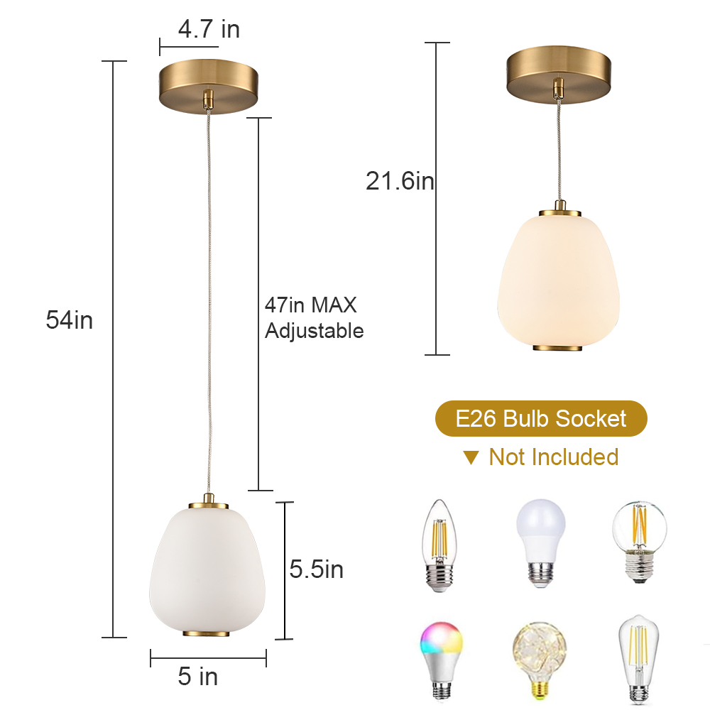 The modern LED pendant light fixture flaunts a boost of sparkle to your living space with a glossy gold finish. Its milk glass bell shade conveys a touch of elegance and brings eye appeal to the space. A mix of finishes encompasses both modern qualities and classic elements, yet maintains an industrial edge. Its milk glass shade contrasts with the shiny finish and introduces a large dose of texture to the space. It comes with one 47-inch adjustable hanging cord.