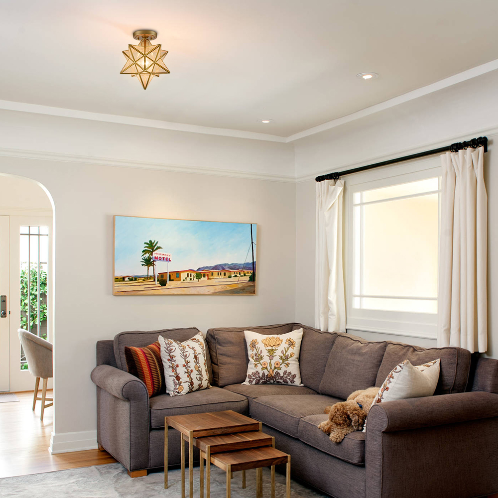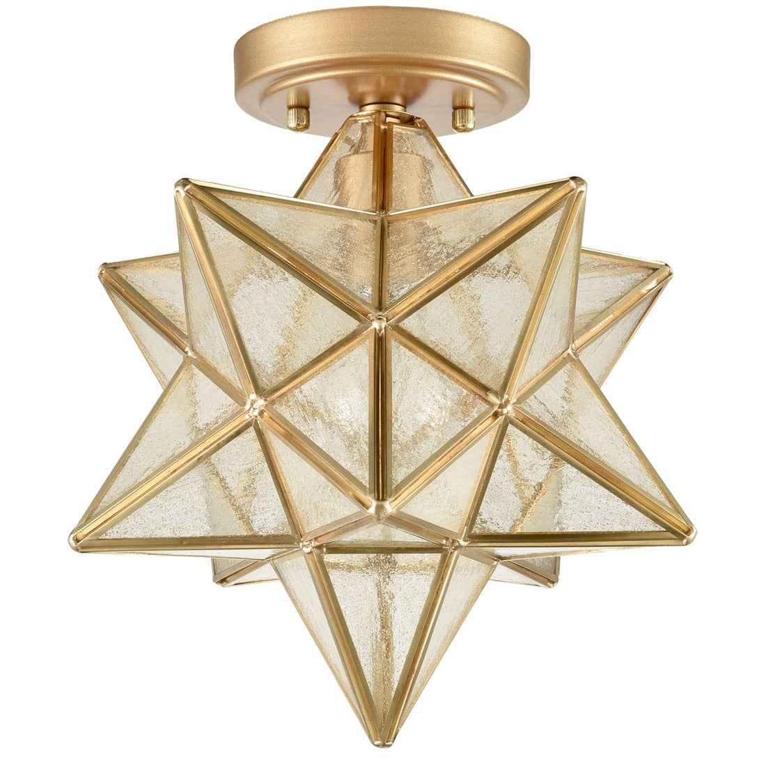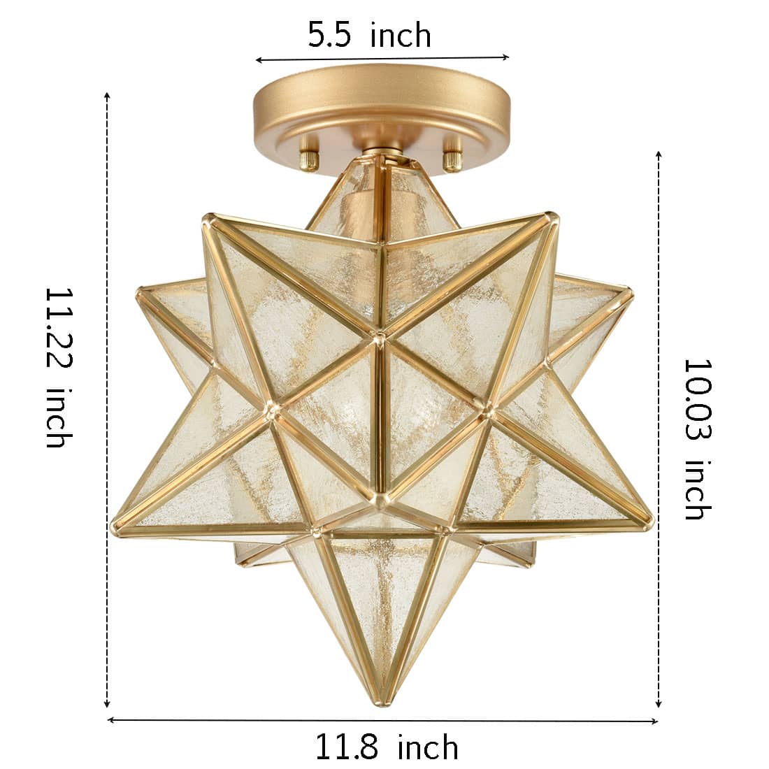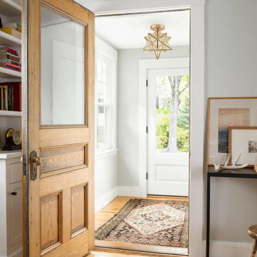 Crafted of impurity-free seeded glass, the Moravian star glass shade of the semi flush mount ceiling light is exquisitely hand-welded. Coated in a rustproof brass finish, the ceiling light reinvigorates your interior with a glint of glamour. A hinged door can be opened for bulb replacement..
