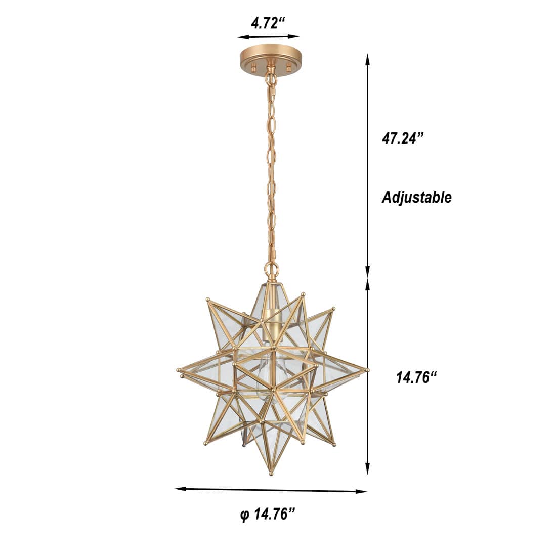 Crafted of impurity-free clear glass, the modern Moravian star pendant light’s glass shade is exquisitely hand-welded and pairs nicely with the gold edges featuring copper alloy covering. Boasting a rustproof gold finish, it peps up your interior with a touch of sparkle. Its stellated multi-point design adds an element of surprise and whimsy to your living space. A hinged access door can be opened for bulb replacement. The clear glass shade contrasts the gold finish and adds alluring visual interest to the living area. It comes with a 47.24-inch adjustable chain and is sloped ceiling adaptable.